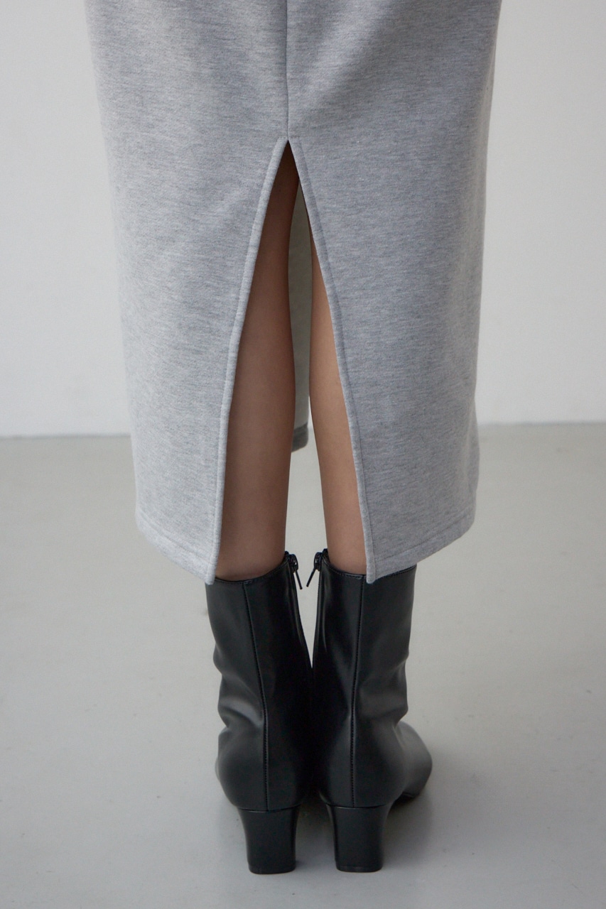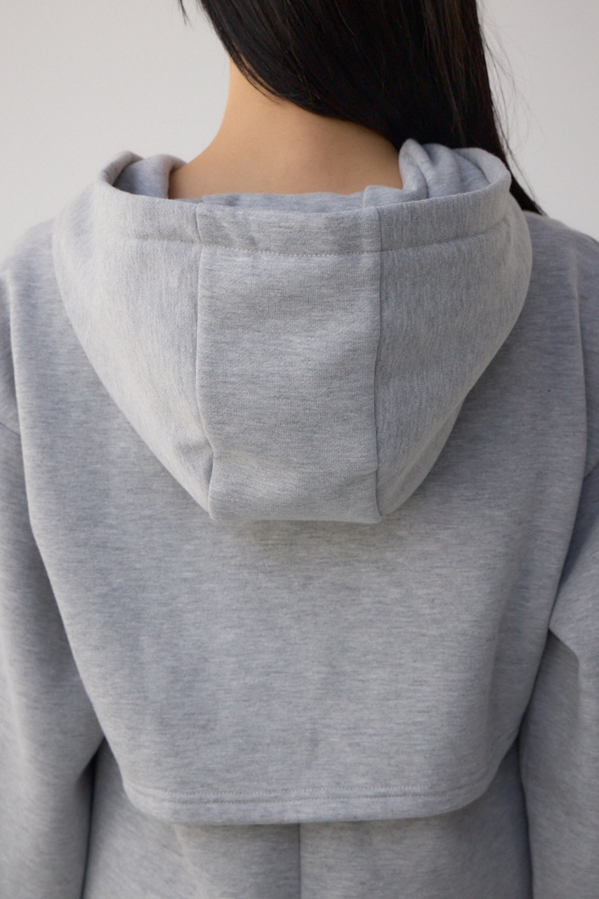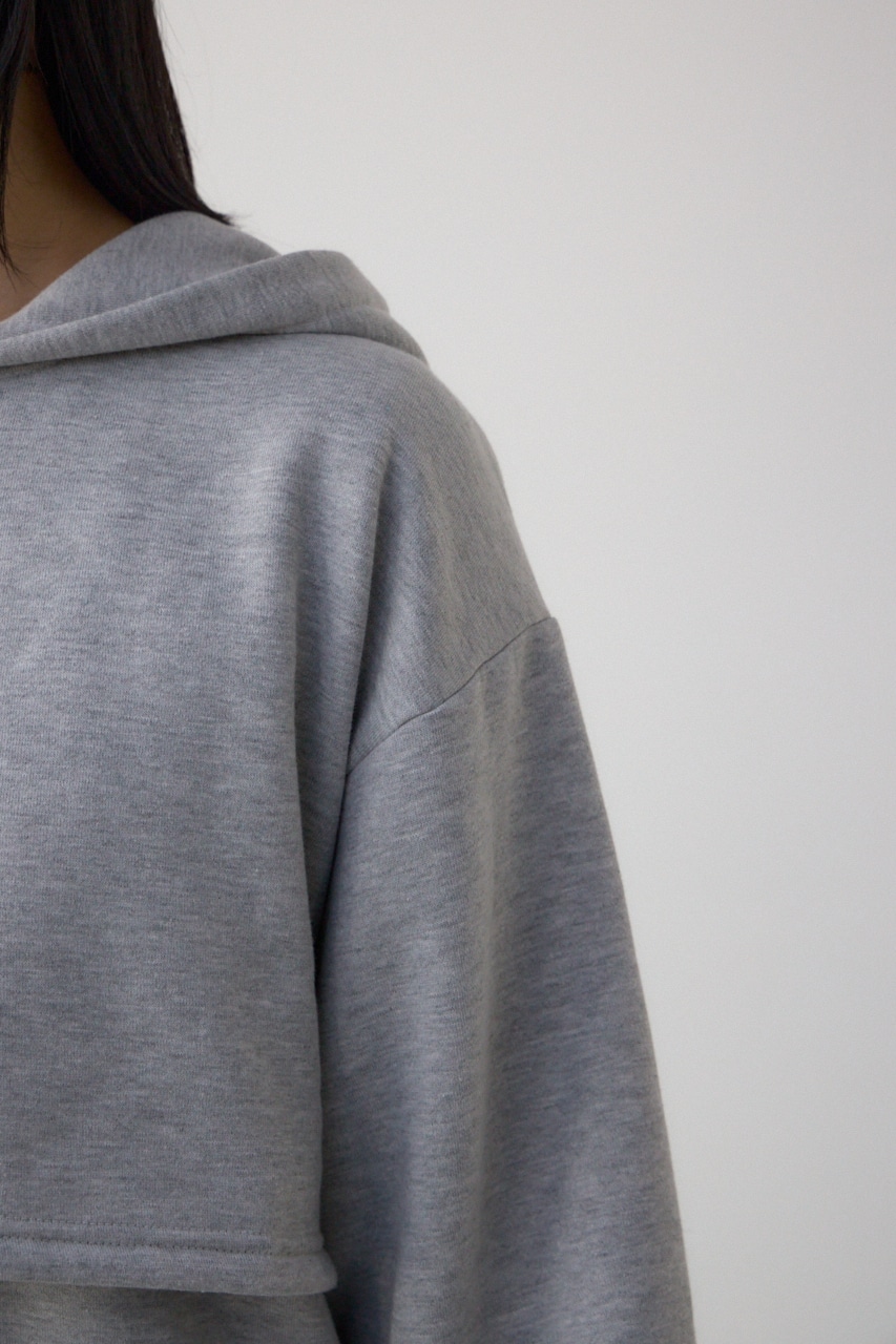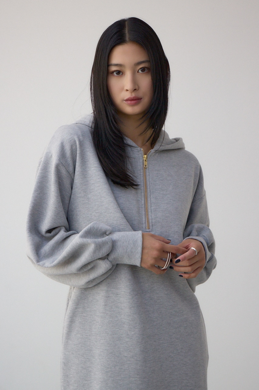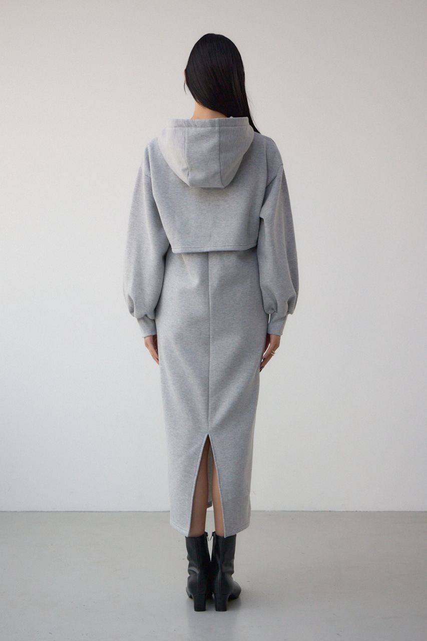 フード付きの短丈パーカーとIラインシルエットのワンピースをレイヤードしており、ウエスト位置が高くみえるためスタイルアップが叶います。