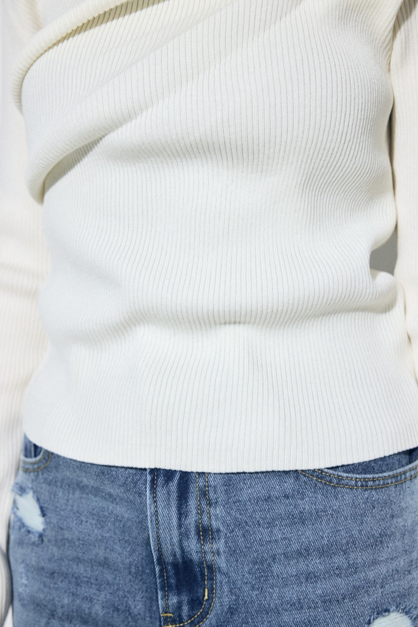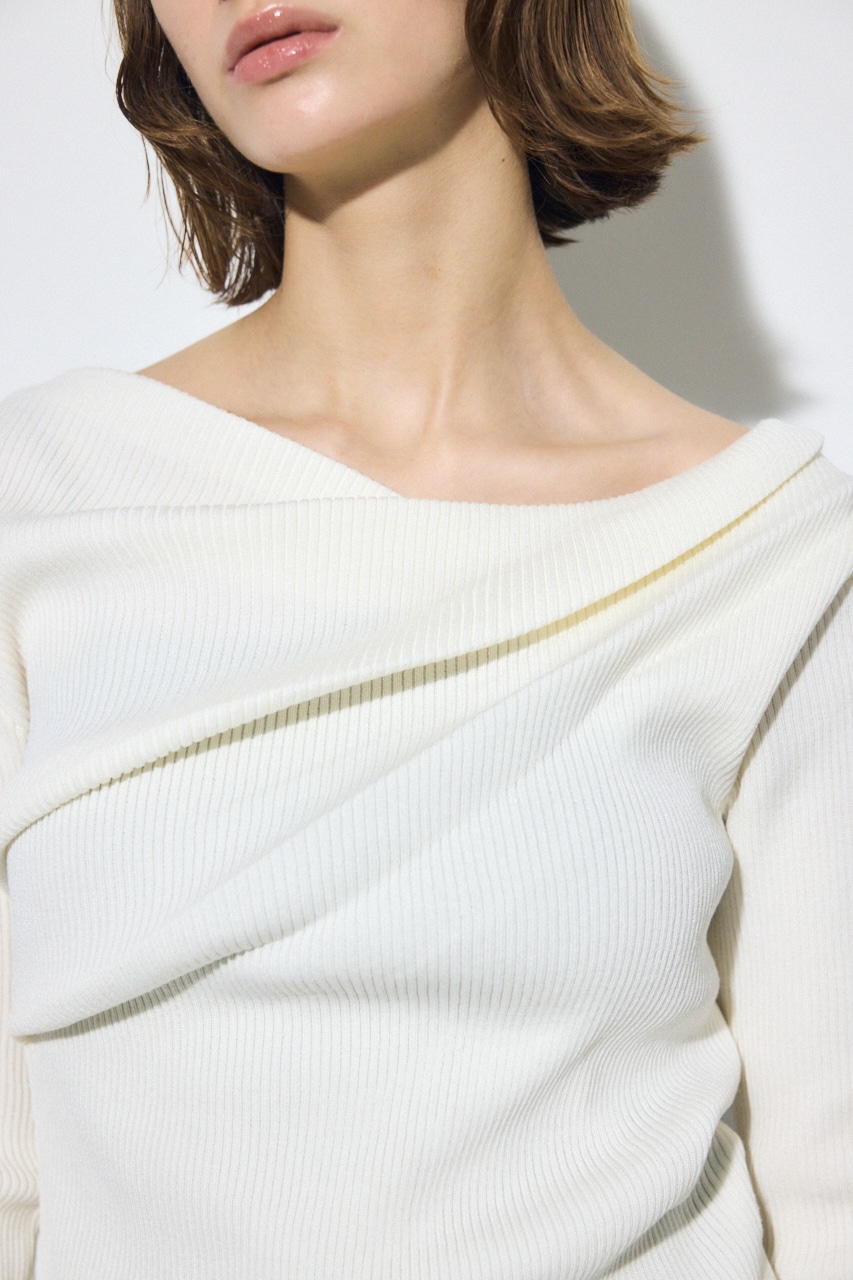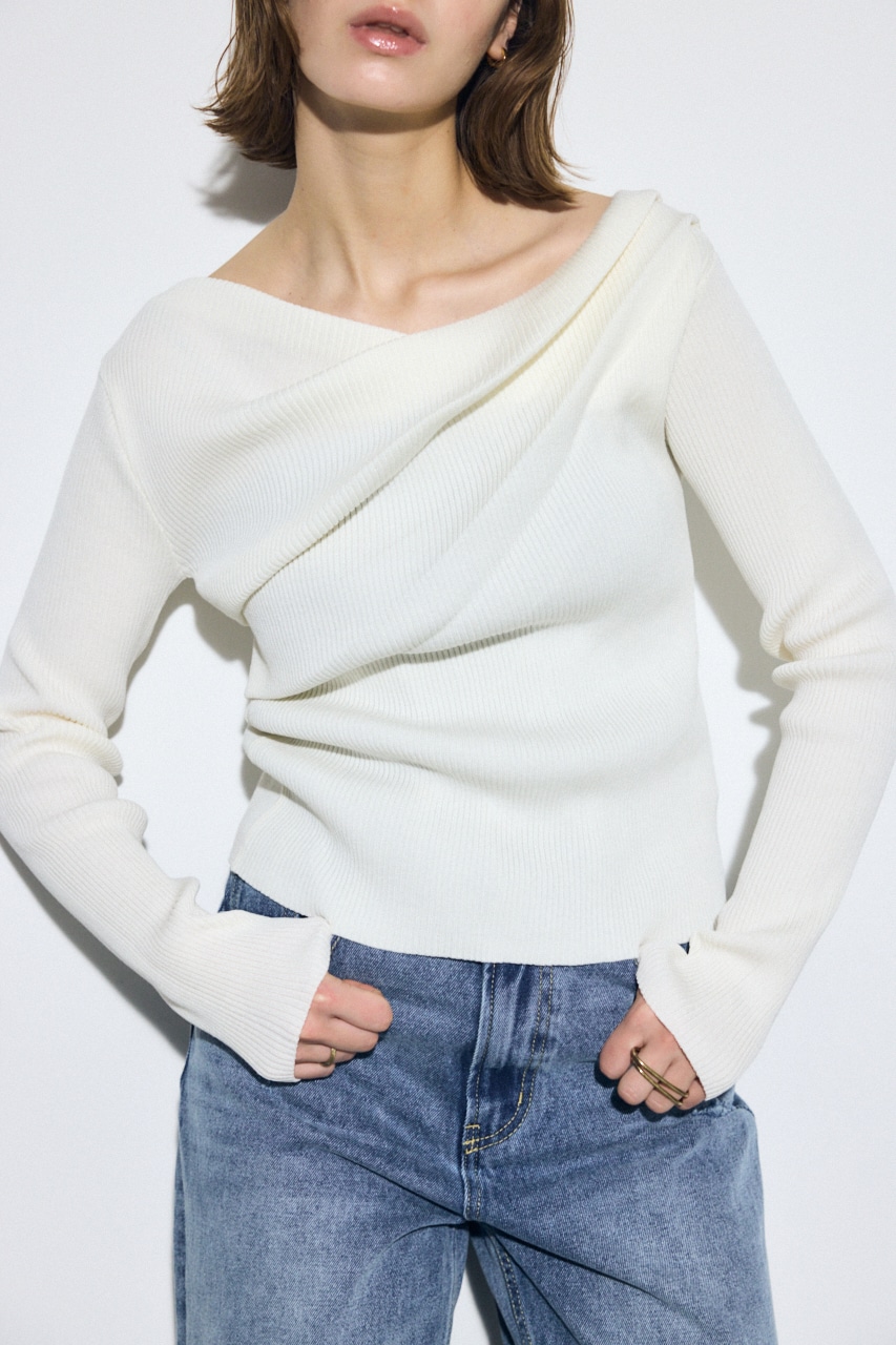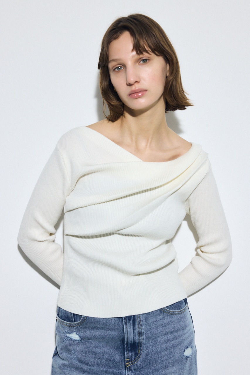 前身頃にアシンメトリーなドレープを入れたデザインのドライタッチなリブニット。