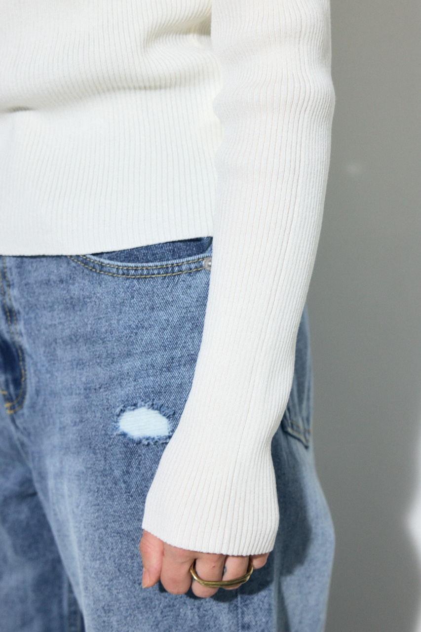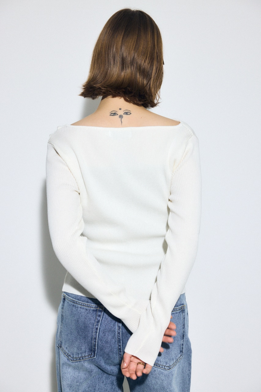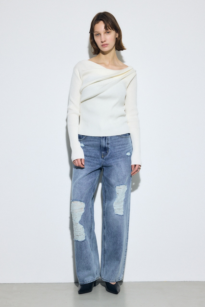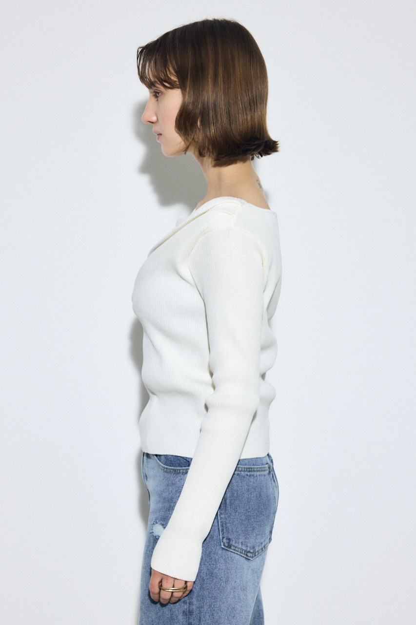 前身頃にアシンメトリーなドレープを入れたデザインのドライタッチなリブニット。