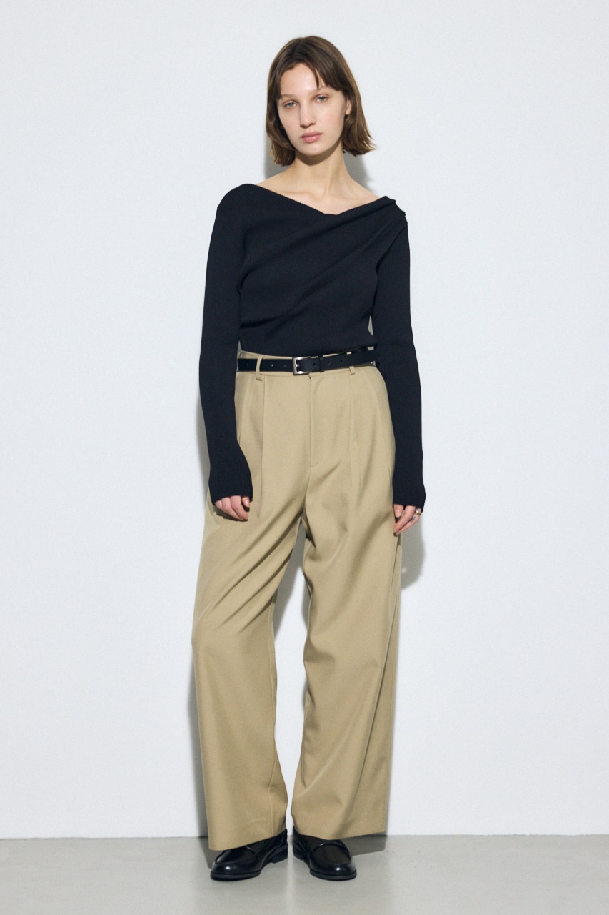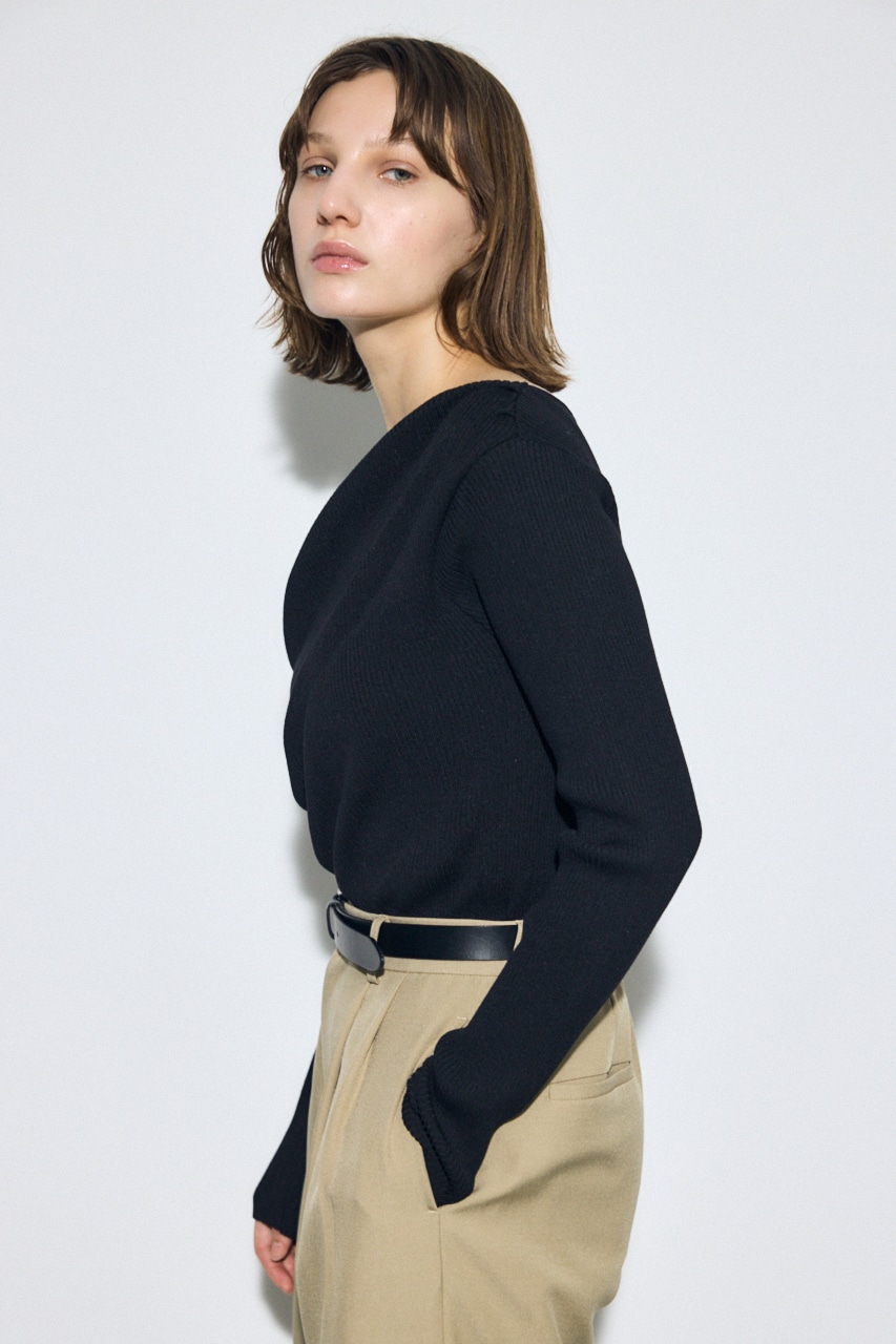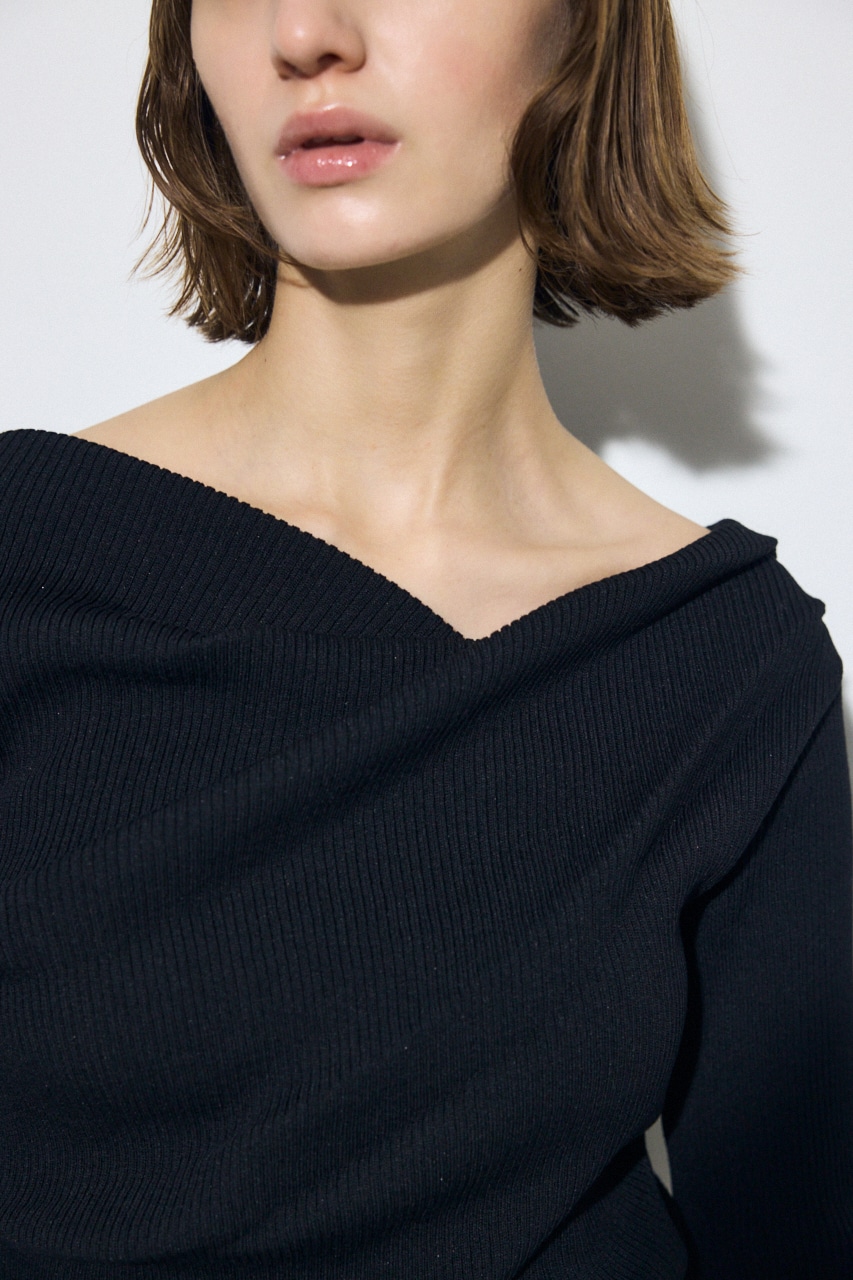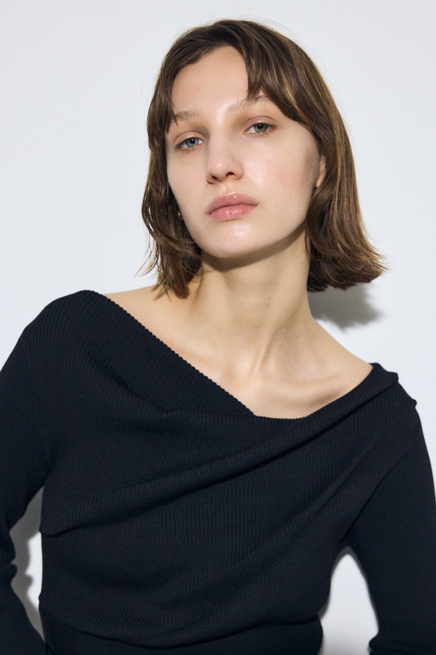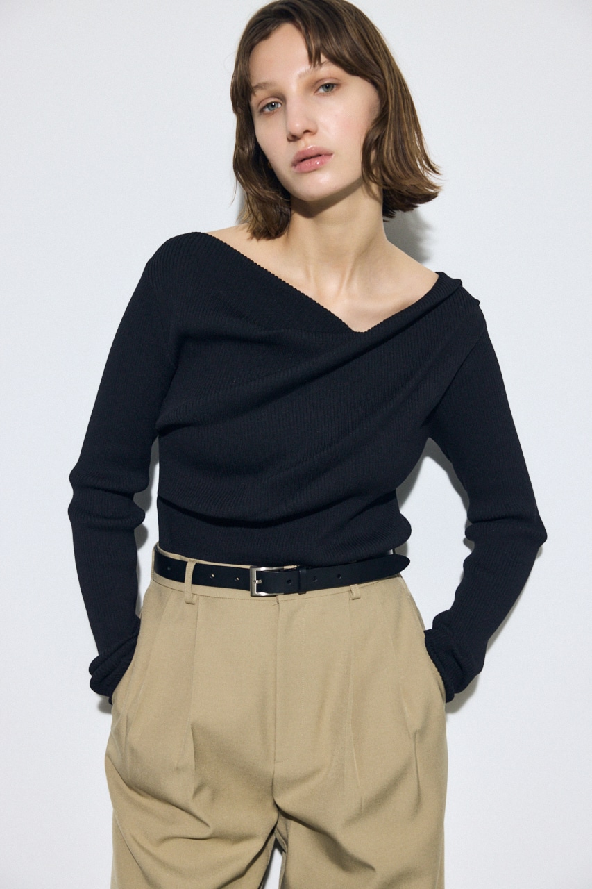 前身頃にアシンメトリーなドレープを入れたデザインのドライタッチなリブニット。