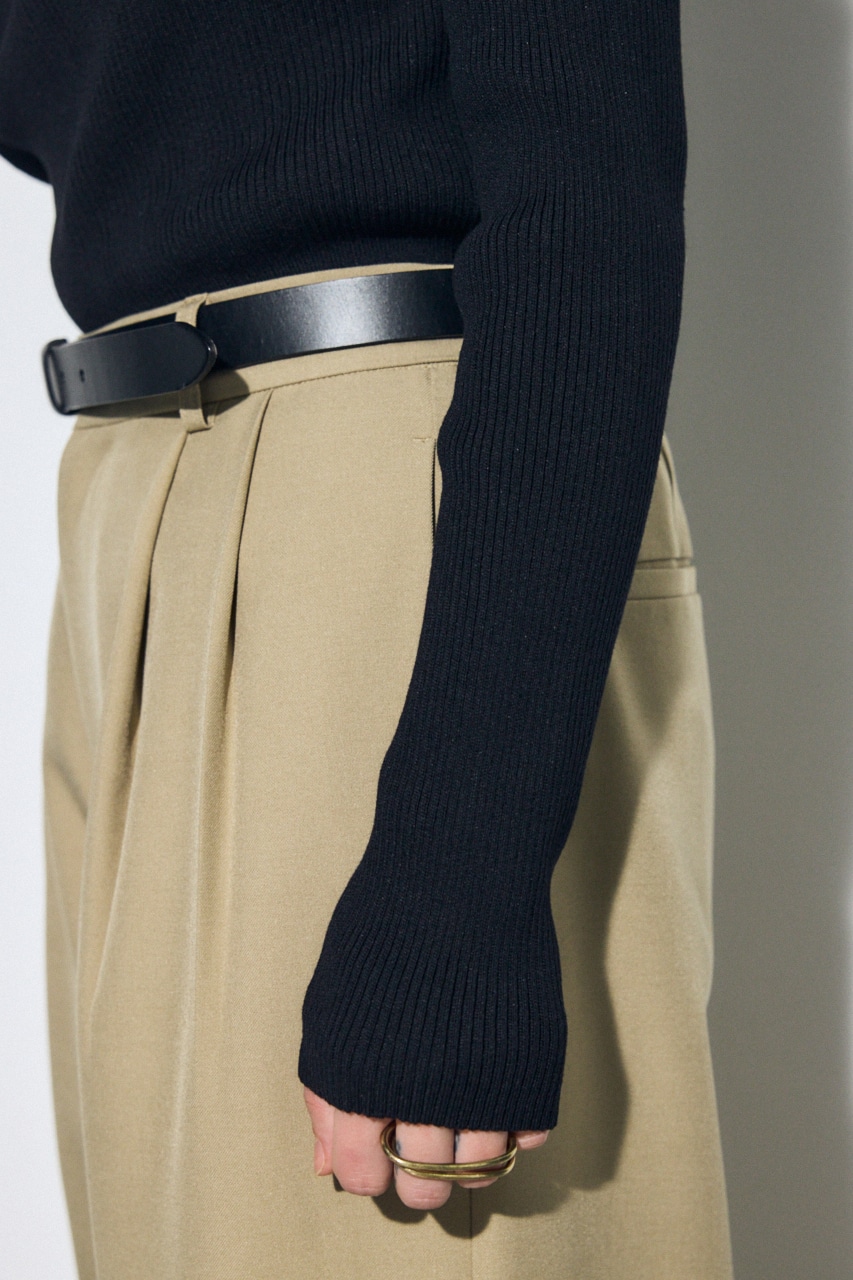 体のラインを拾いやすいイメージのリブニットですが、ドレープを入れることで適度に体型カバーもしてくれます。