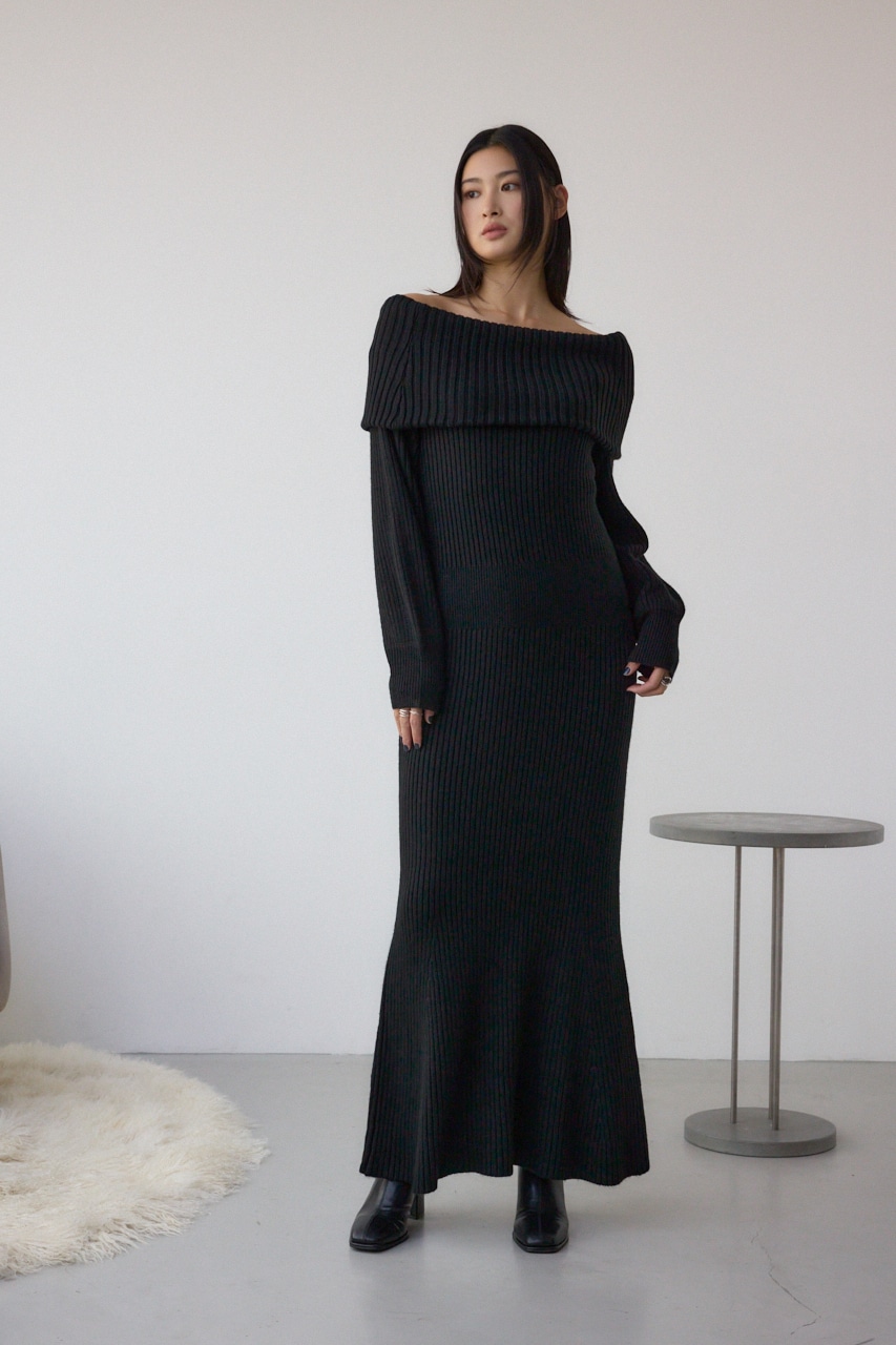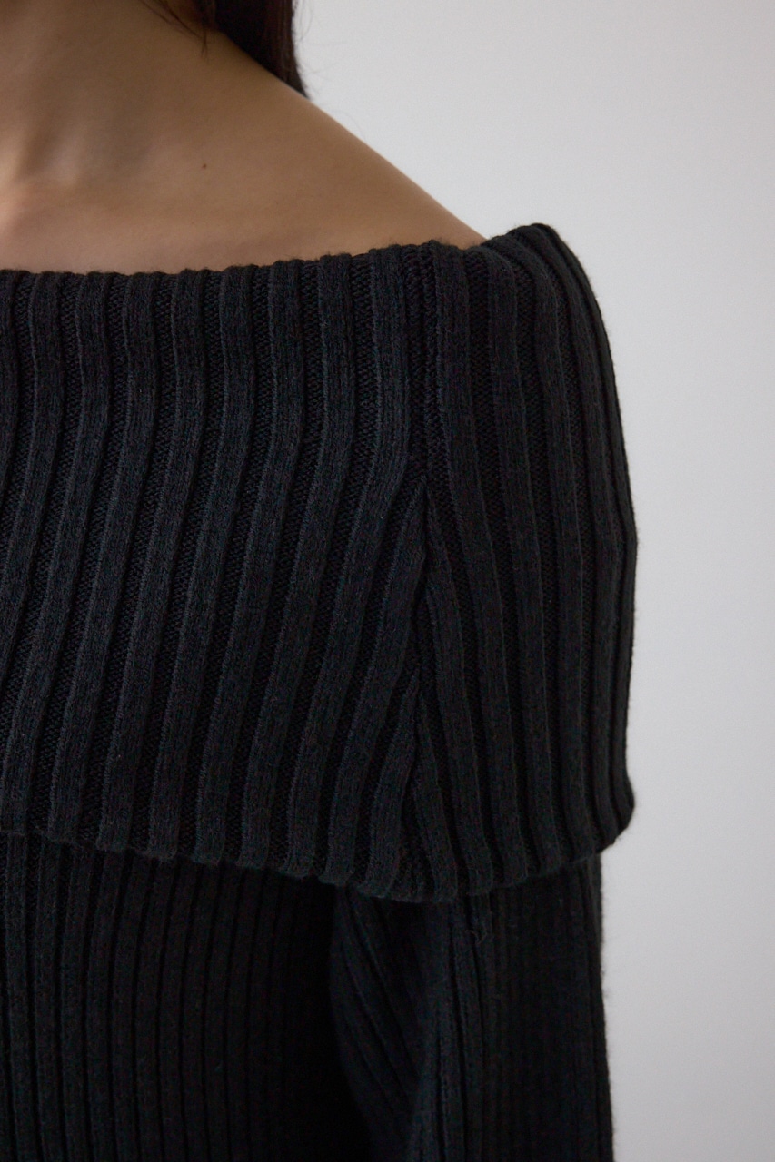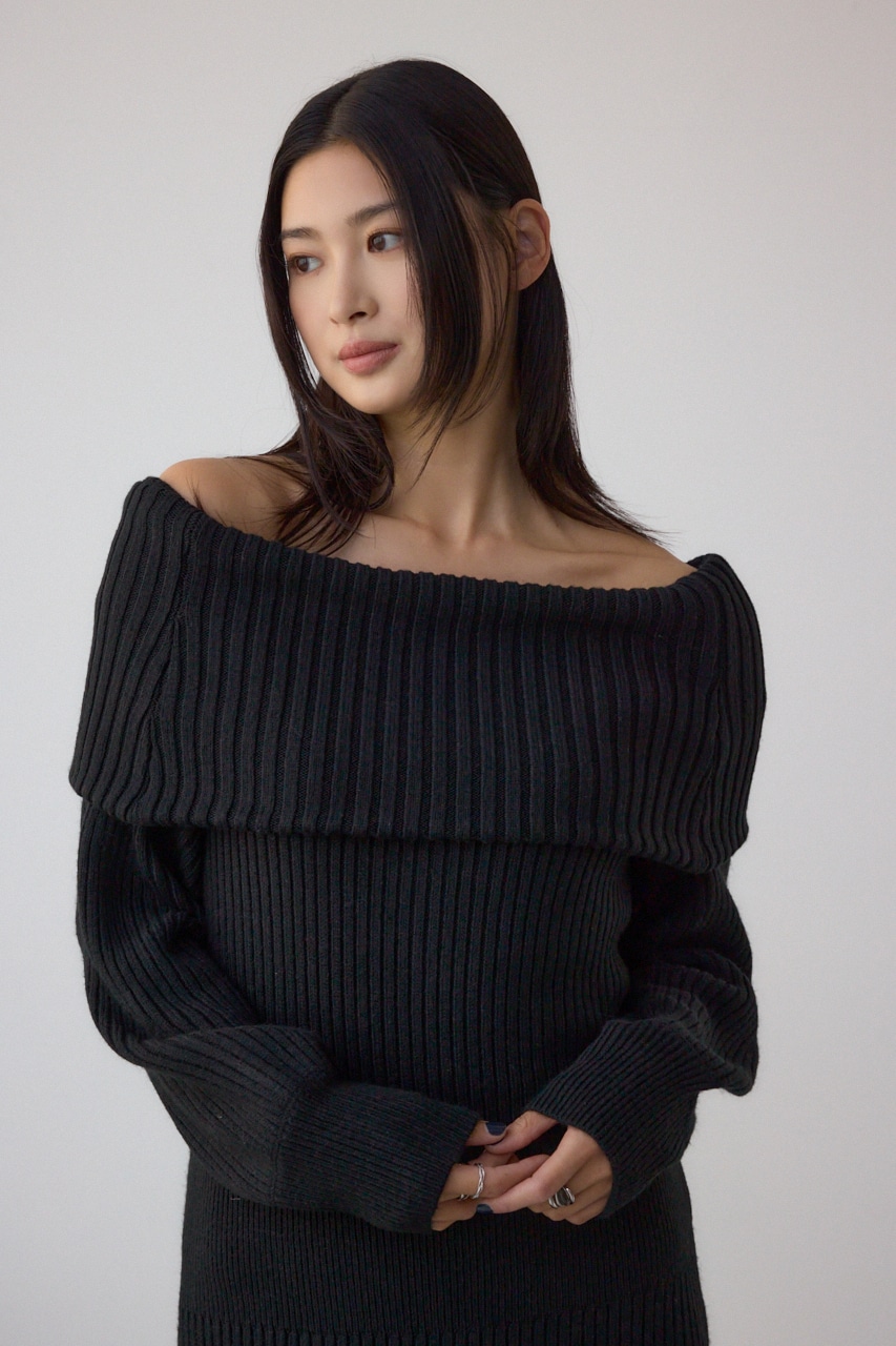 デコルテラインを美しく見せる、大胆なオフショルダーデザイン。
