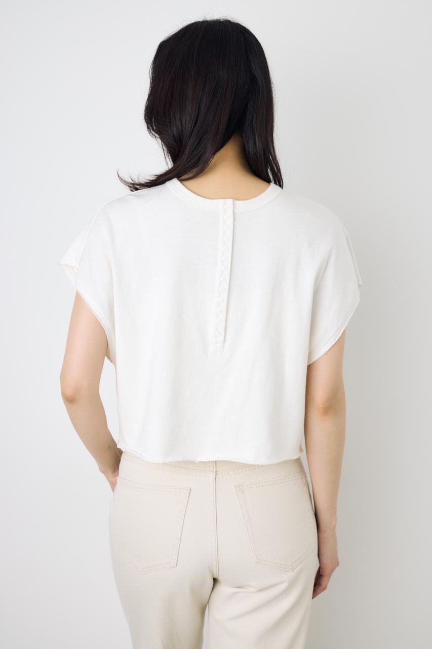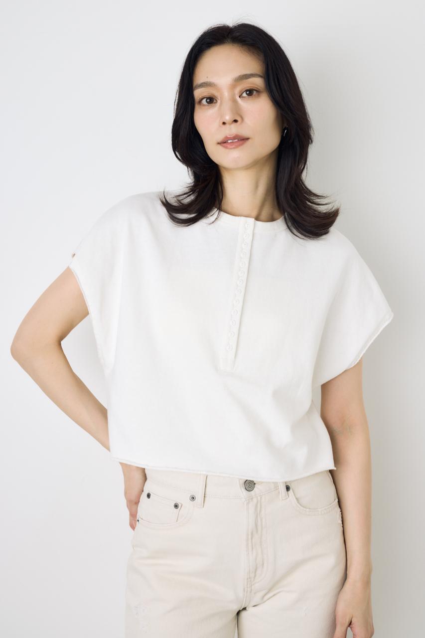 ボタンディテールがアクセントになった、前後2WAYで着用できるデザイントップス。