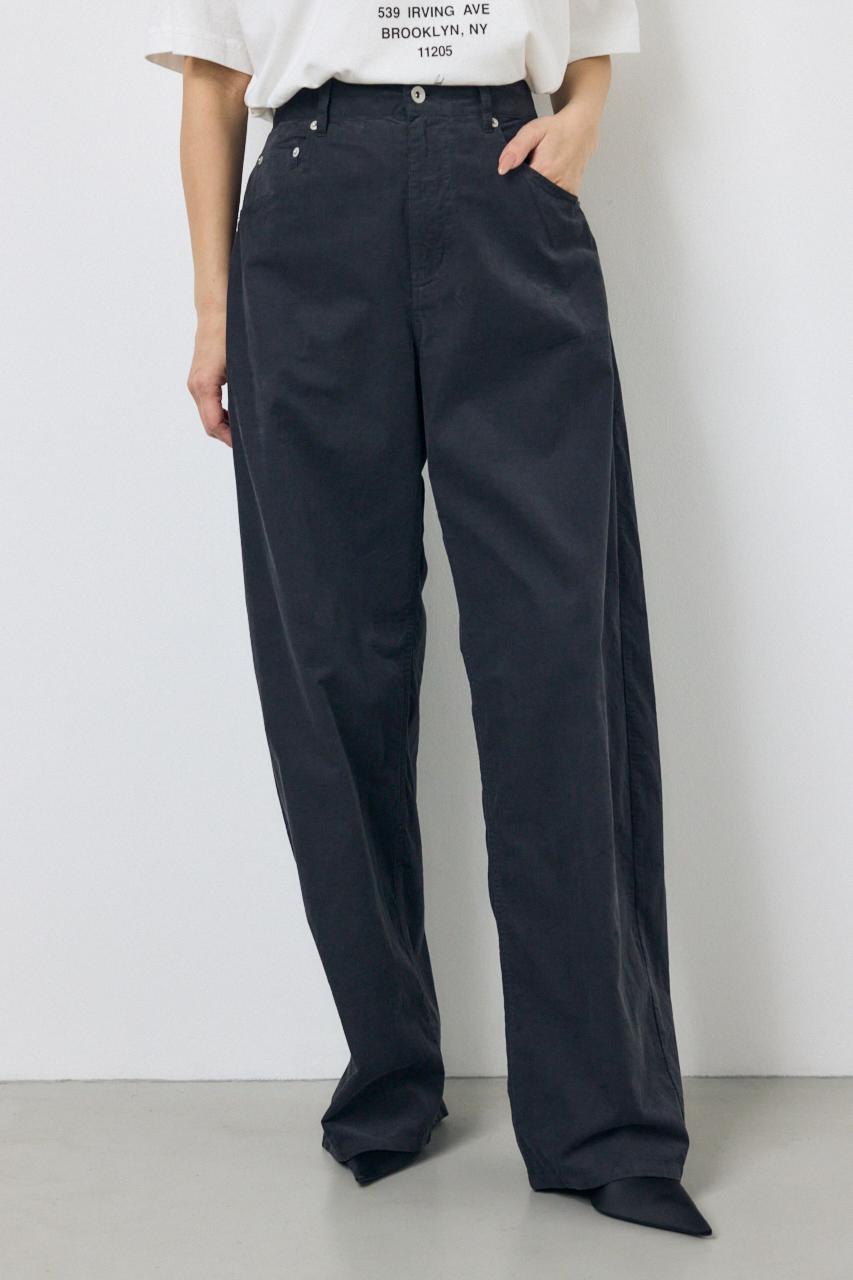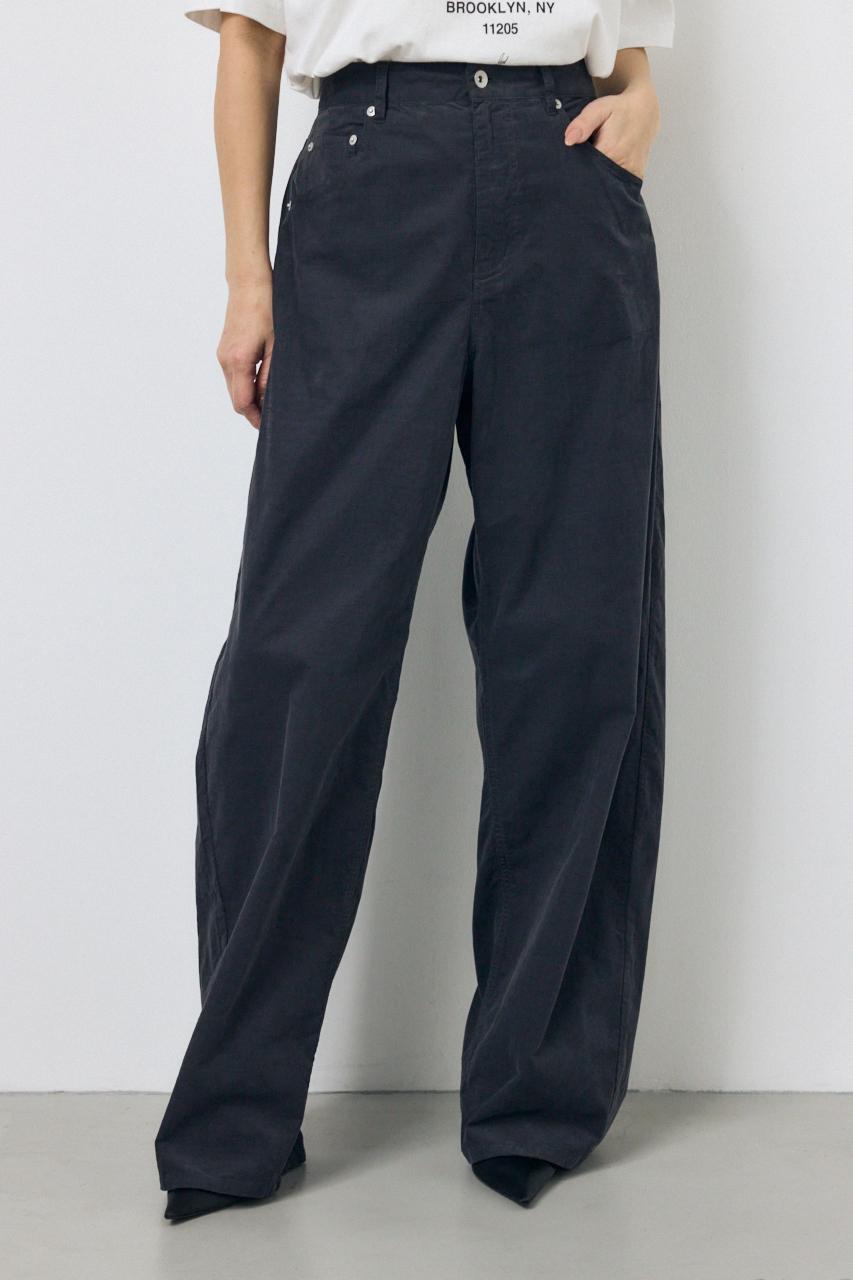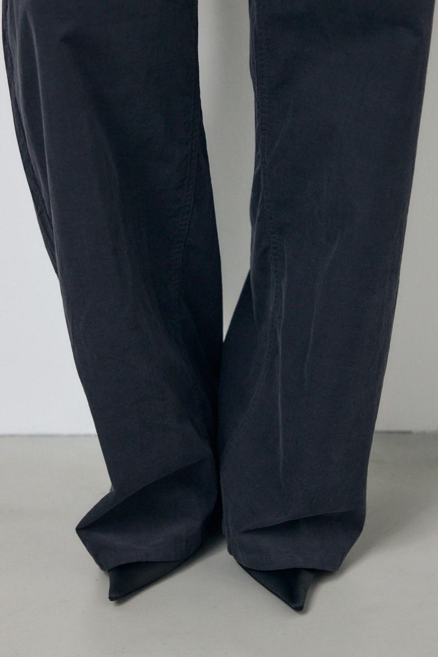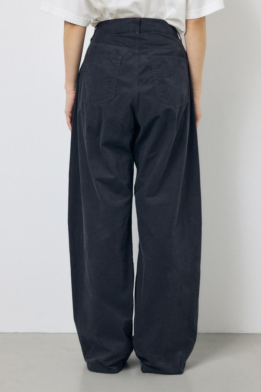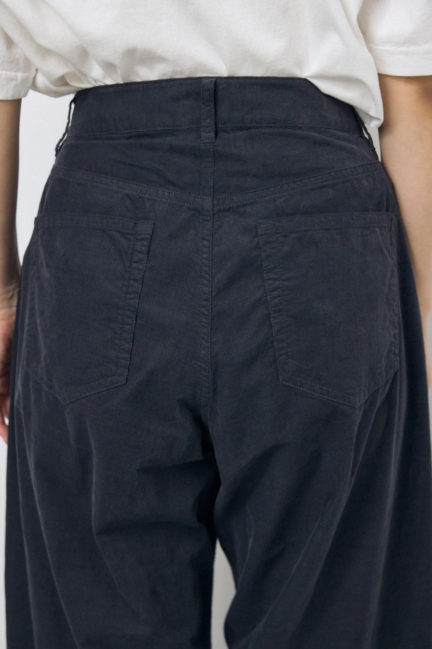 丸みのあるカーブシルエットが特徴の、存在感のある細コーデュロイワイドパンツ。