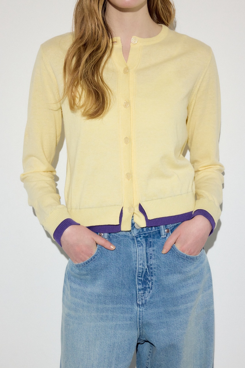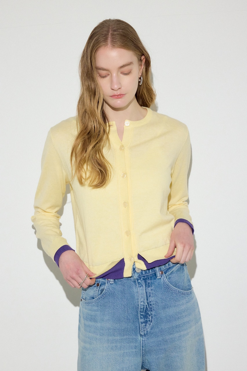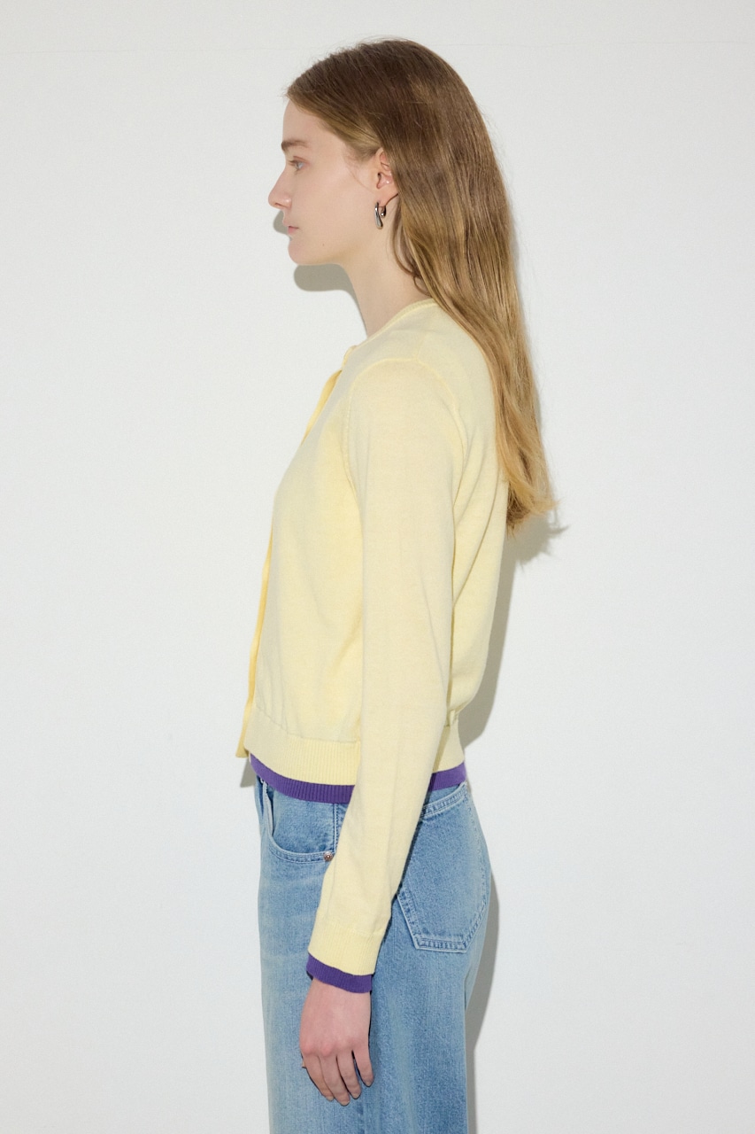 カシミヤ混素材の上品な風合いに、袖口と裾のフェイクレイヤードディテールがアクセントになったクルーネックカーディガン。