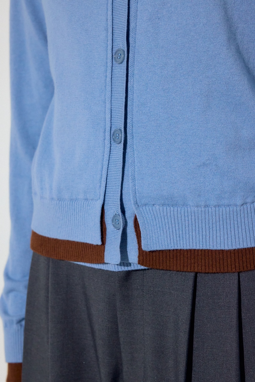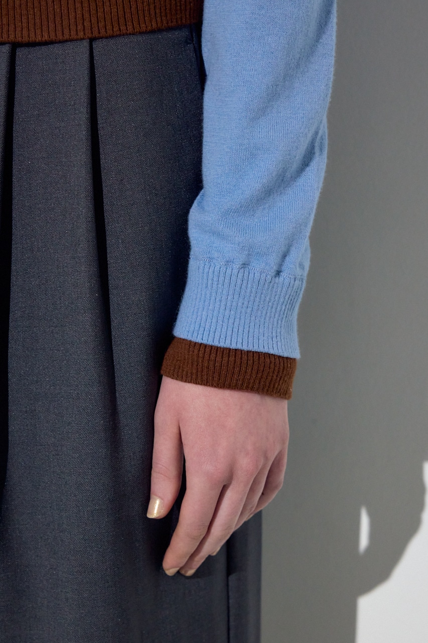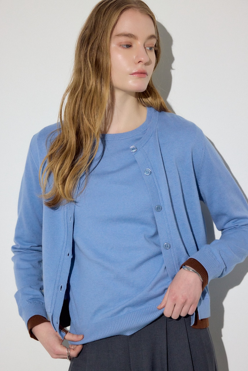 カシミヤ混素材の上品な風合いに、袖口と裾のフェイクレイヤードディテールがアクセントになったクルーネックカーディガン。