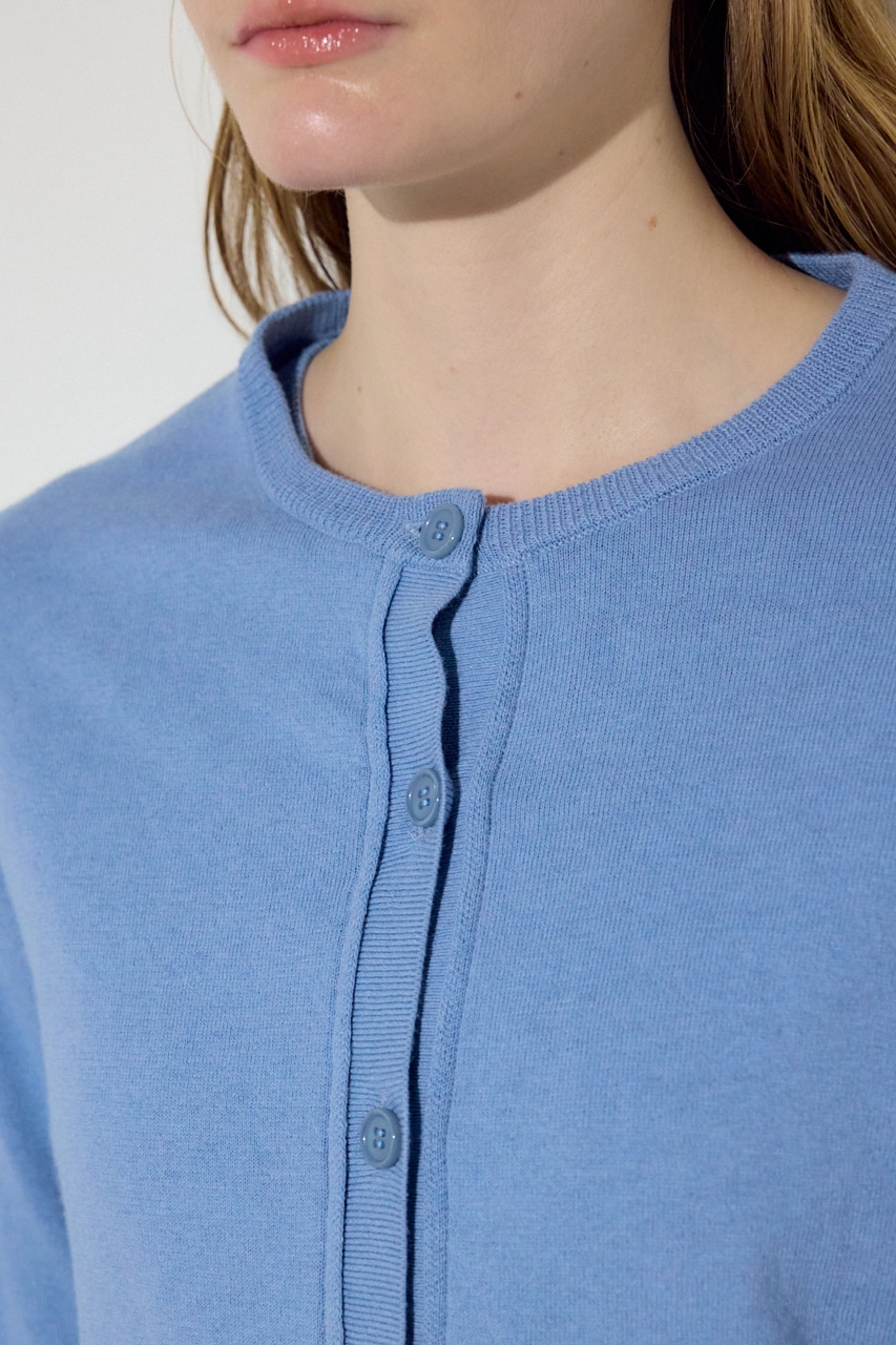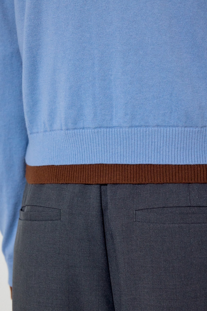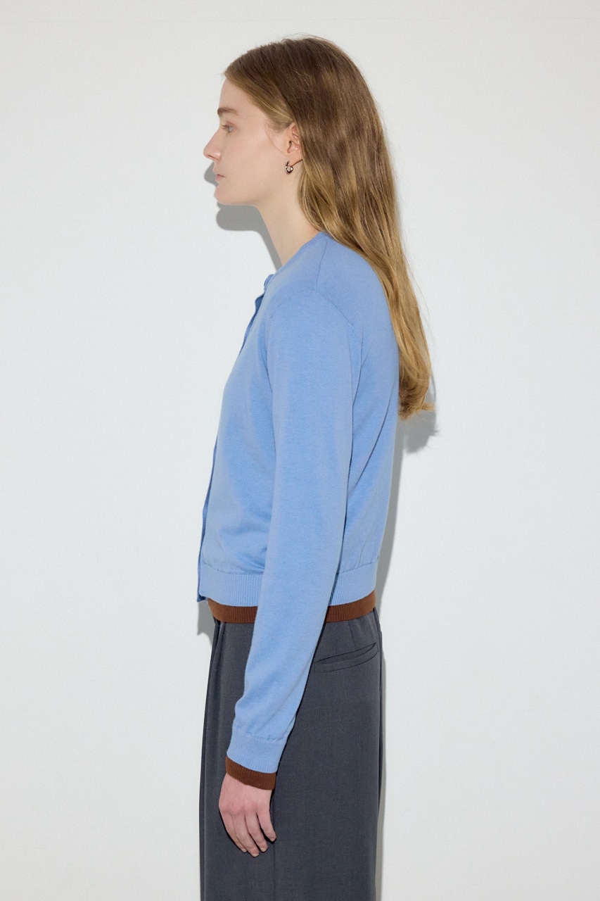 カシミヤ混素材の上品な風合いに、袖口と裾のフェイクレイヤードディテールがアクセントになったクルーネックカーディガン。