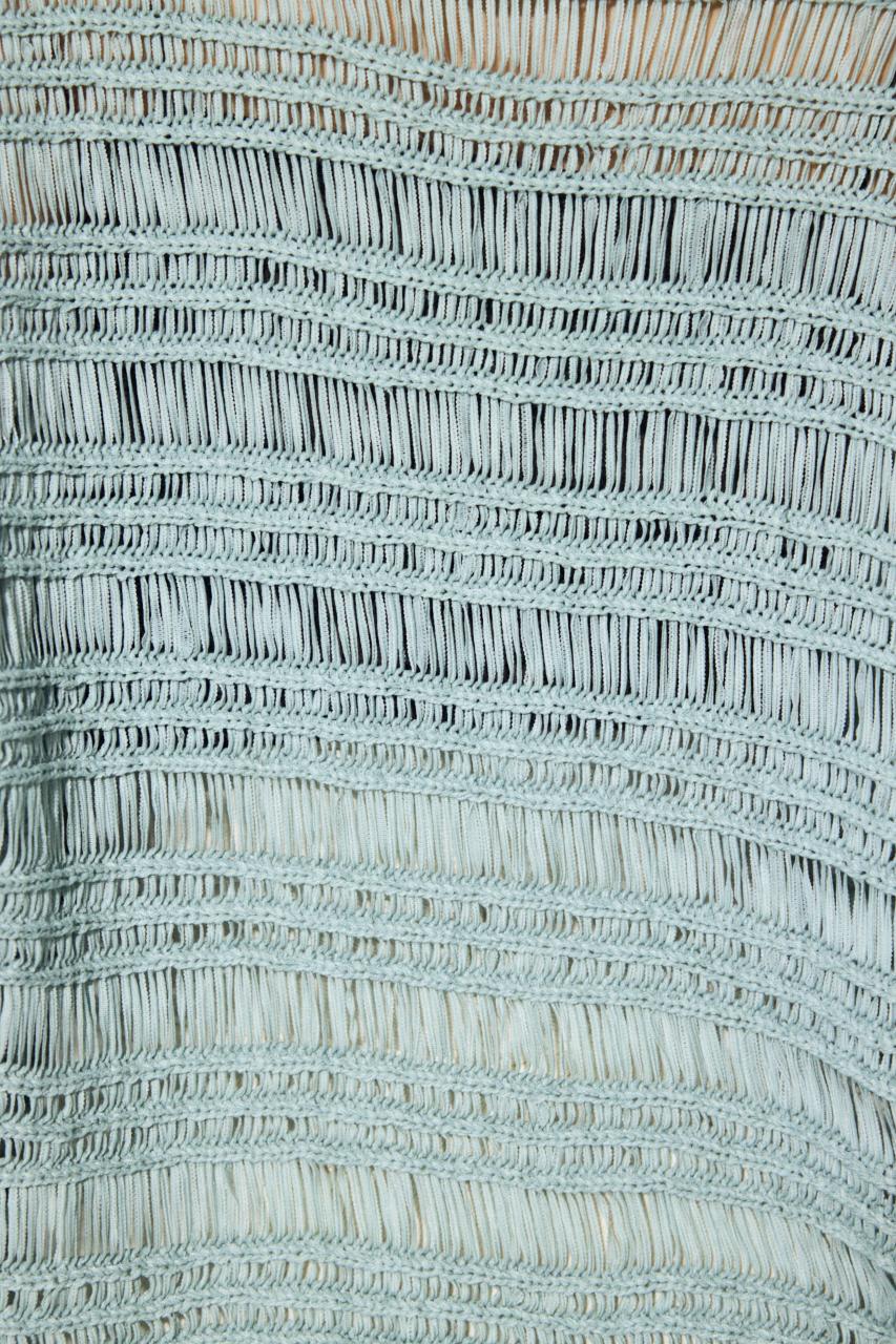 テープ状の糸をボーダー状に透かし編みにしています。