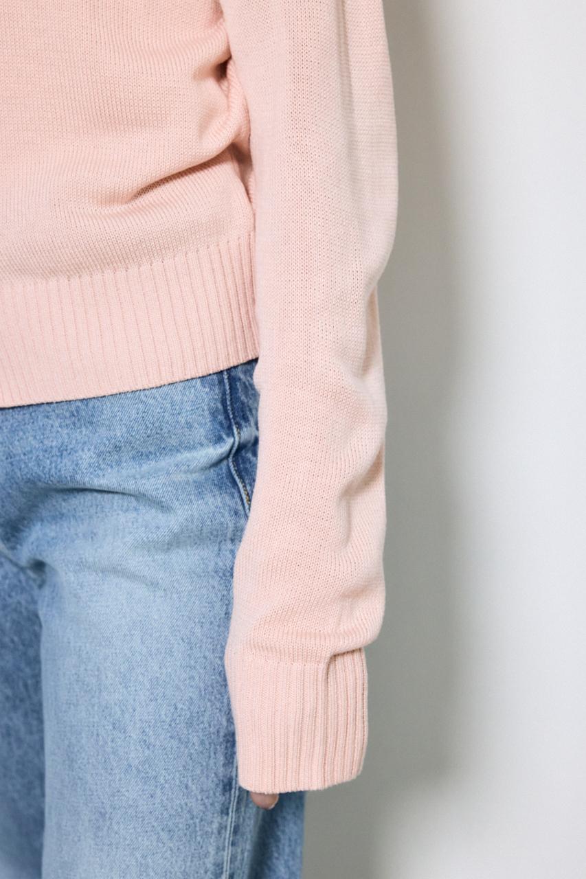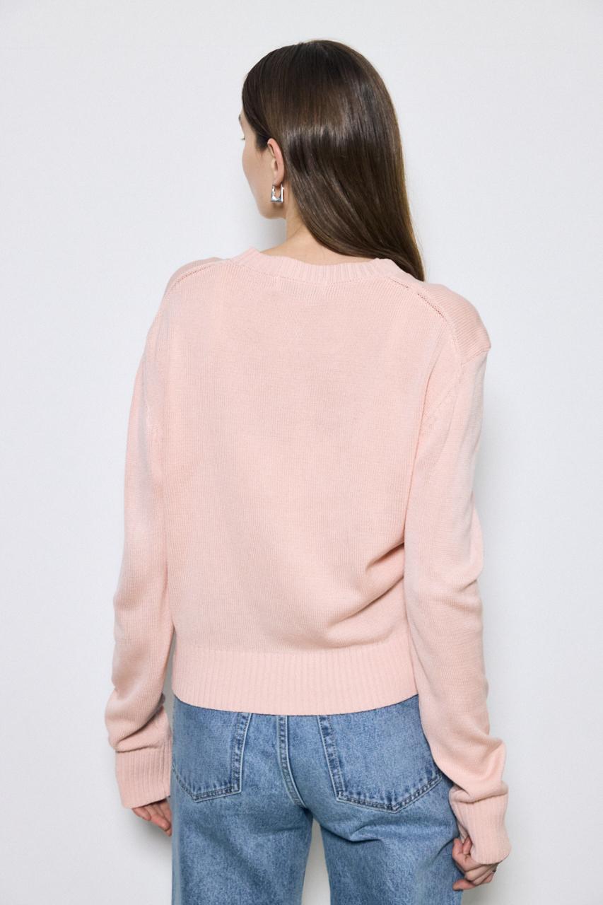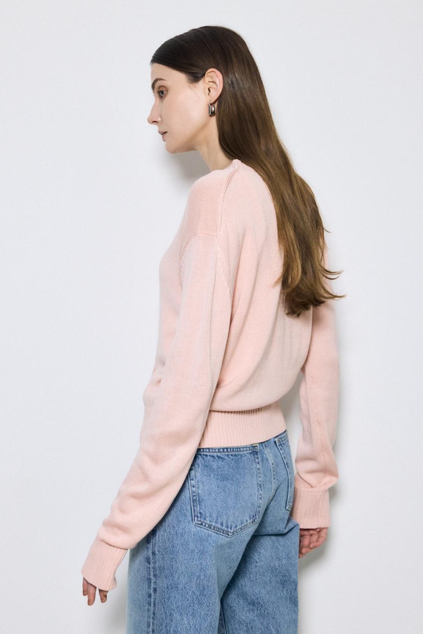 ベーシックなクルーネック仕様で、インナーを選ばず合わせやすいデザイン。