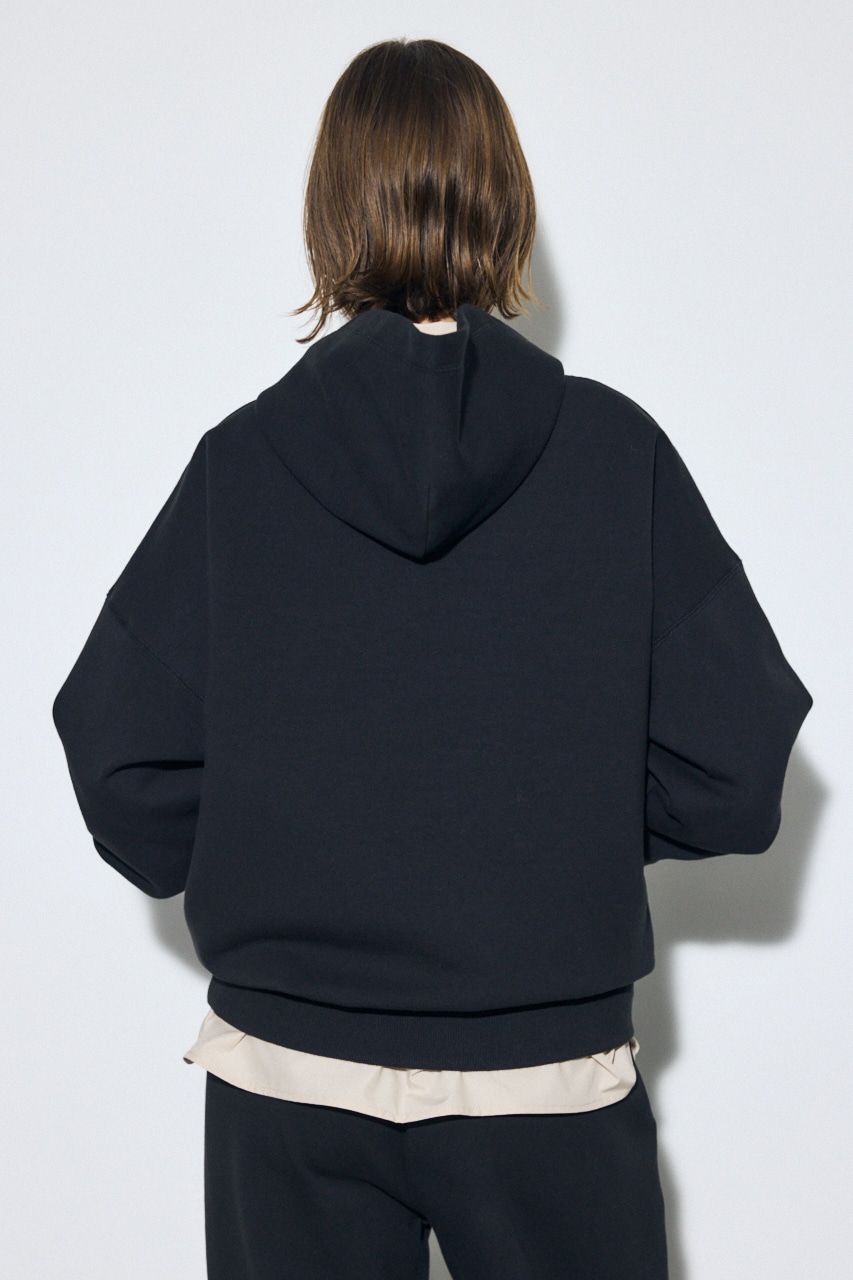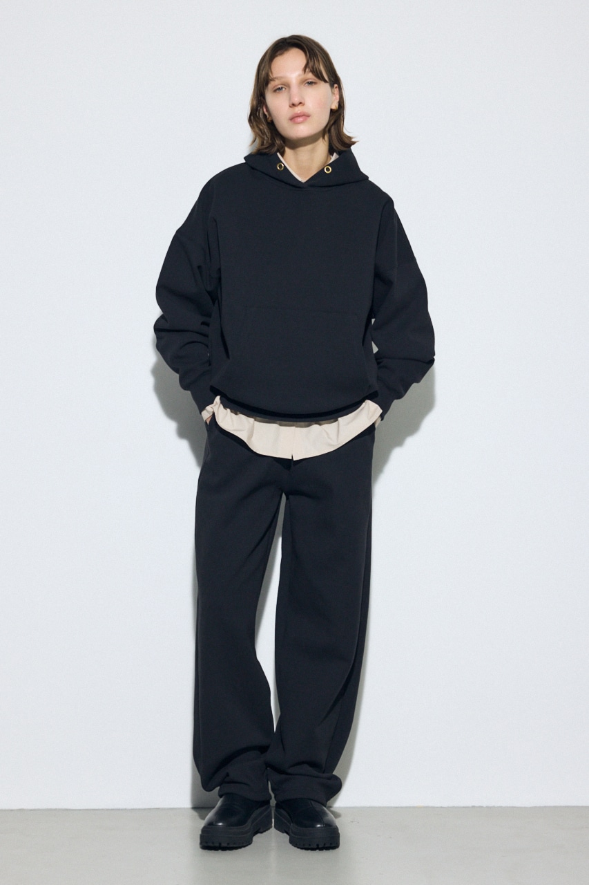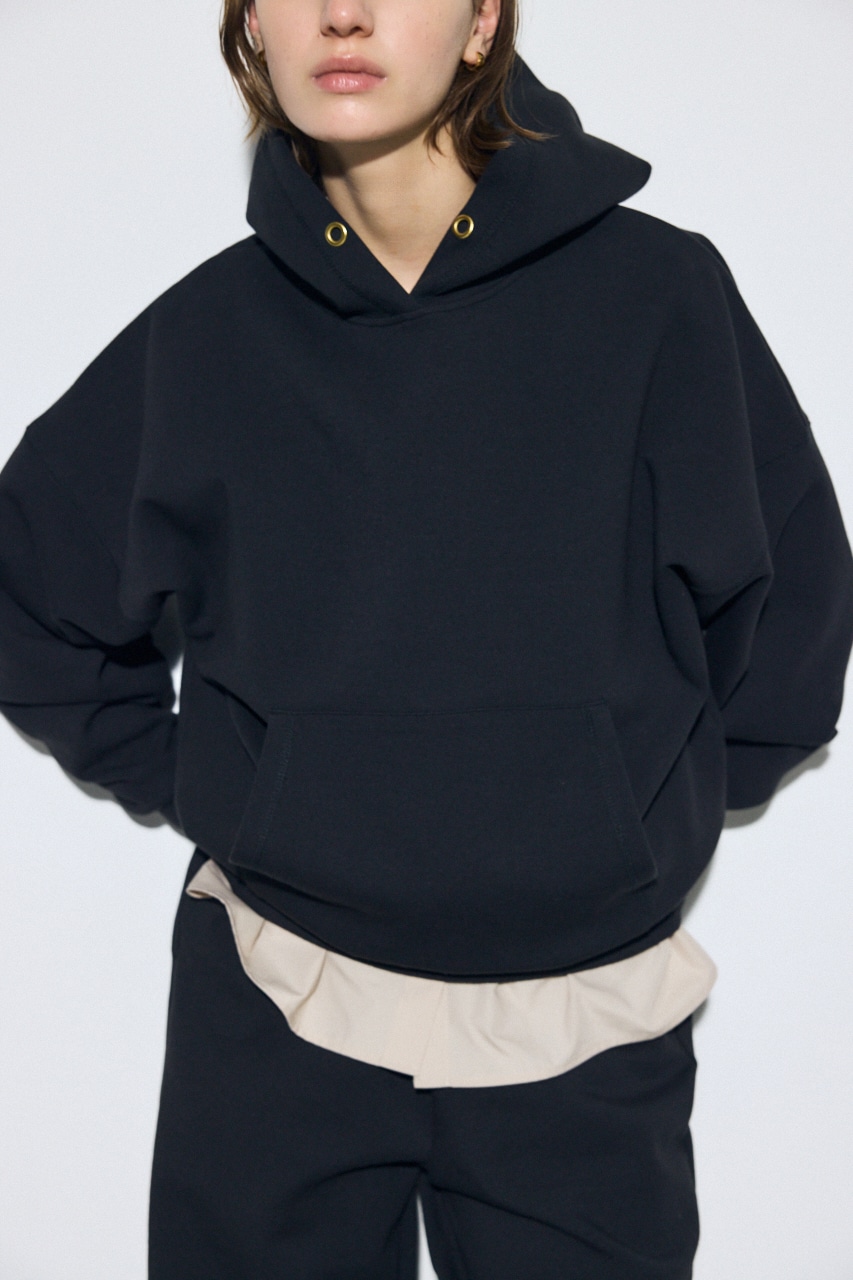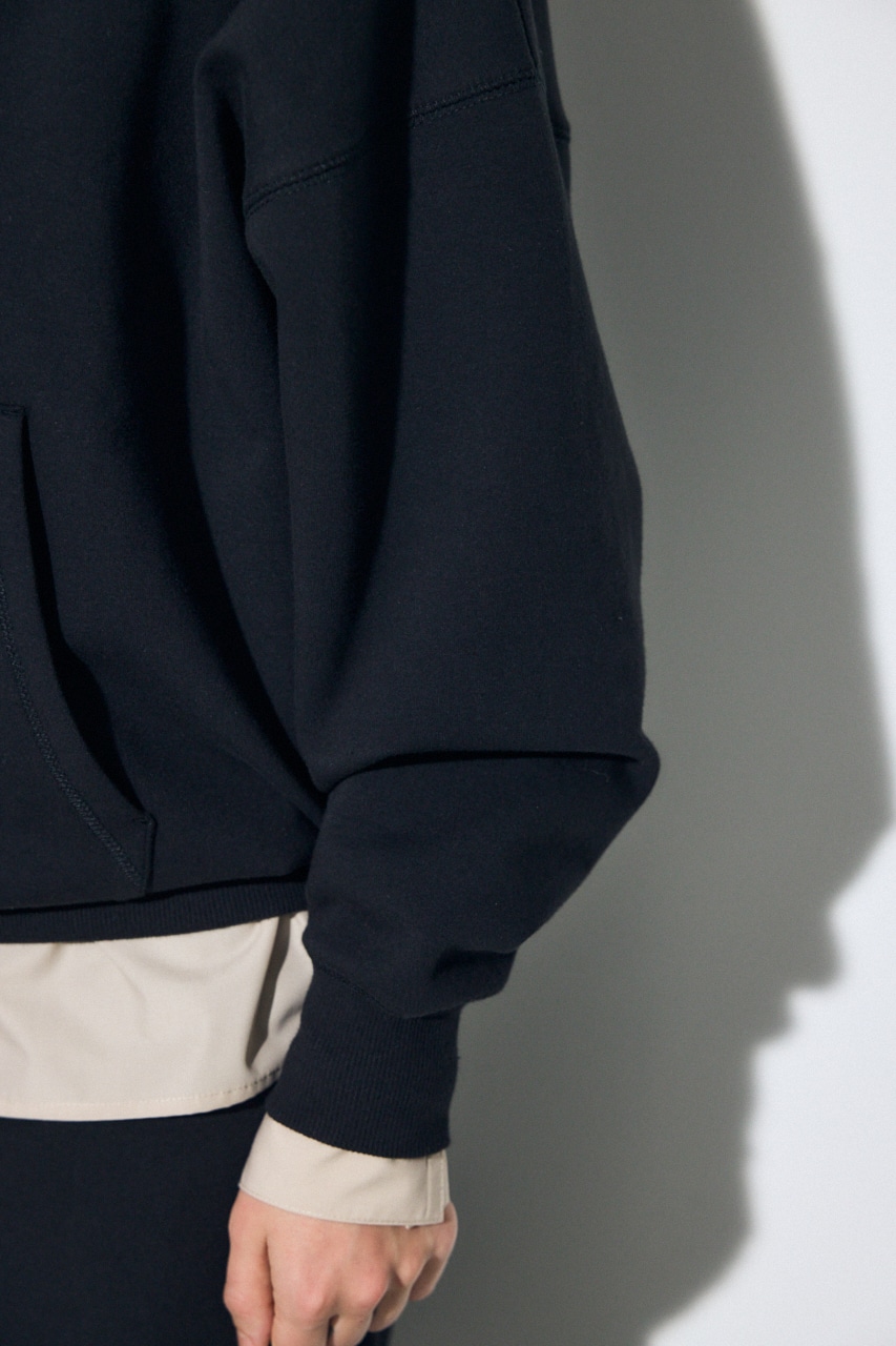 立体感のあるシルエットと、クリーンな表情が魅力のダンボールカット素材パーカー。