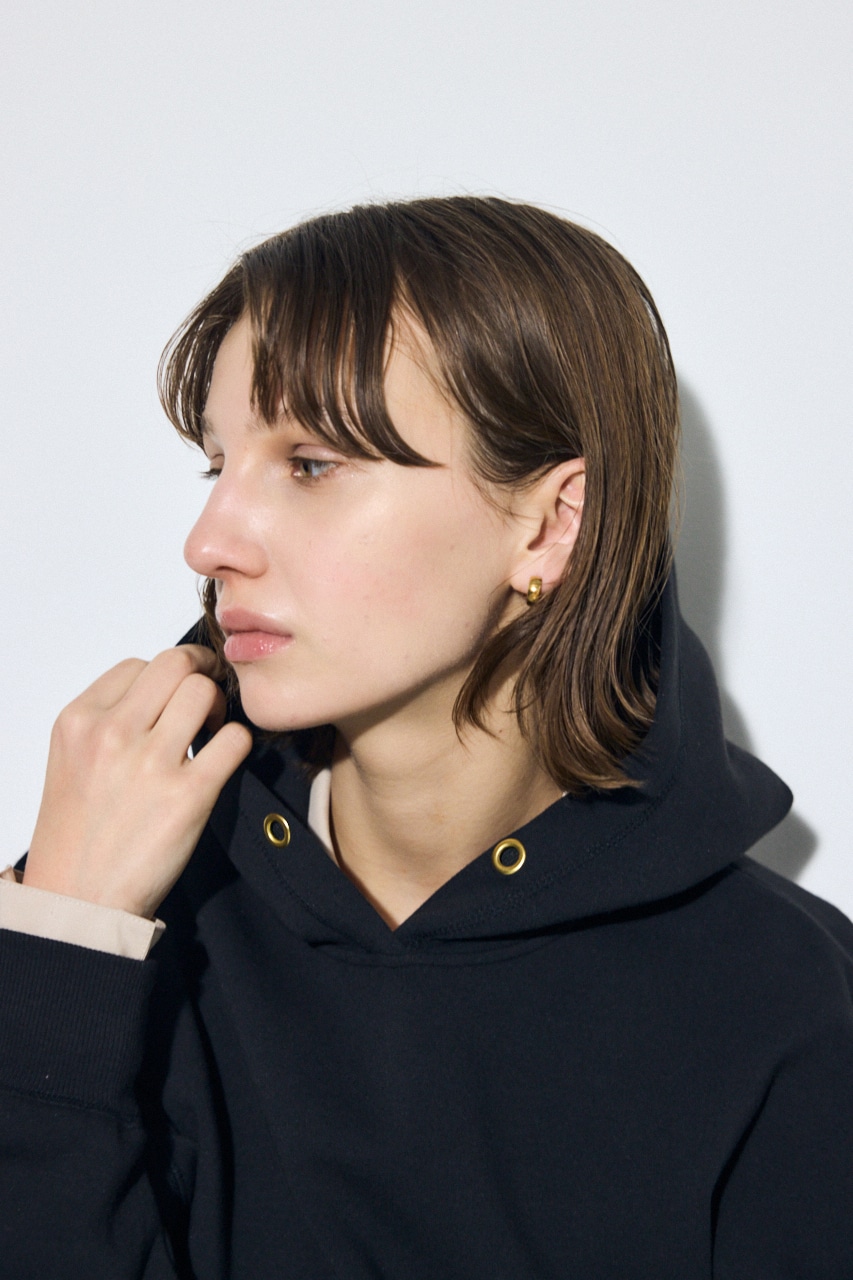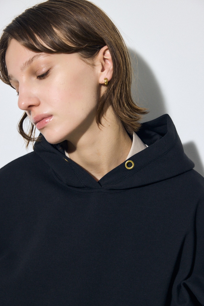 フードは立体的に仕上げ、顔まわりをすっきりと見せるデザイン。
