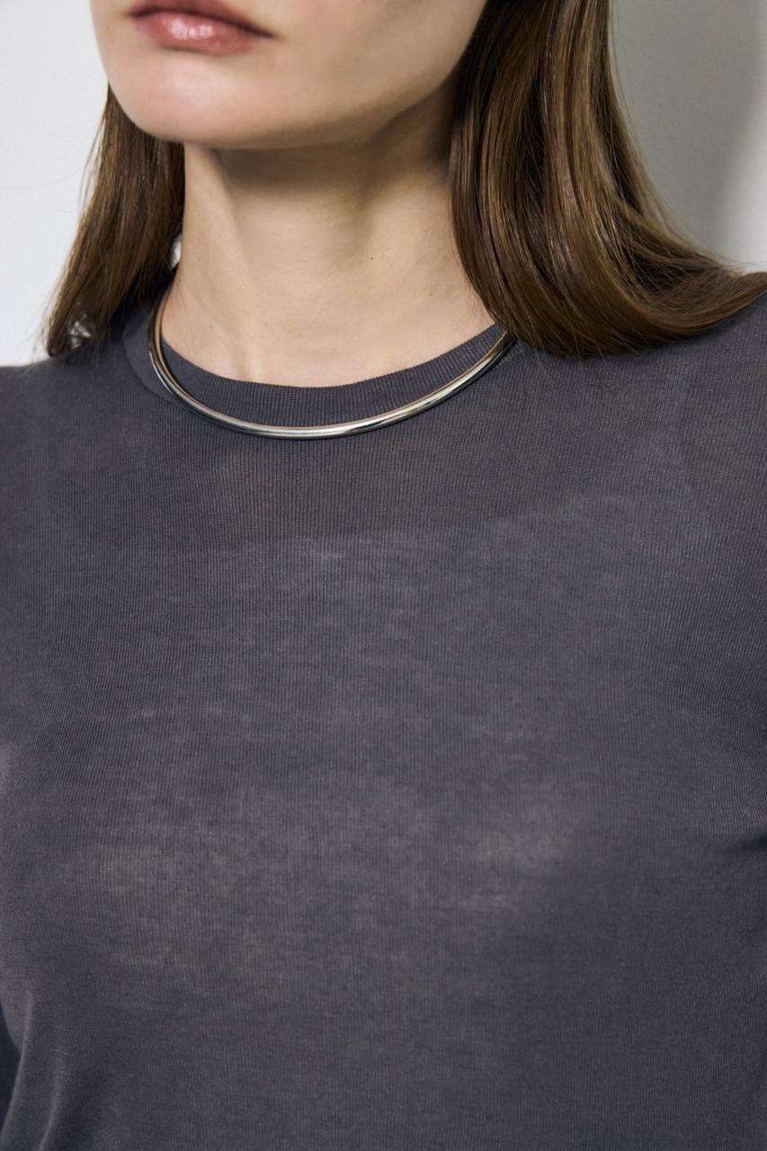 ベーシックなクルーネック仕様で、レイヤードしやすいデザイン。