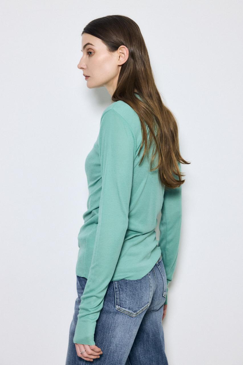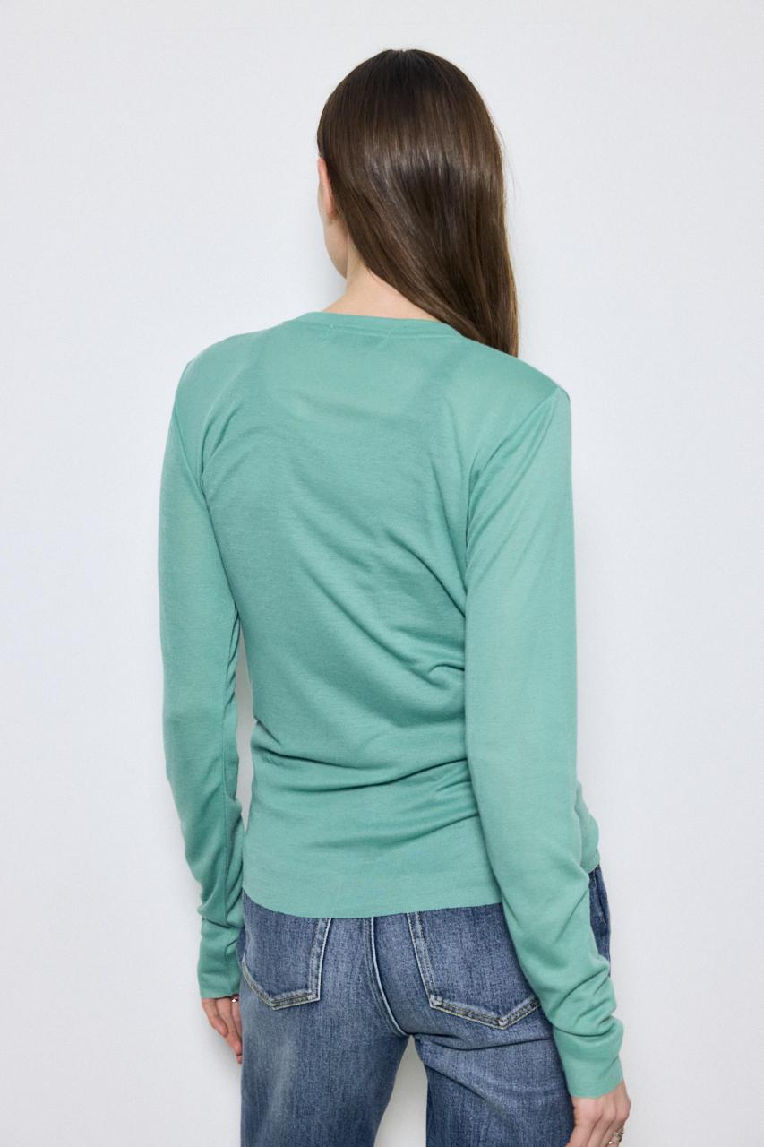 ベーシックなクルーネック仕様で、レイヤードしやすいデザイン。