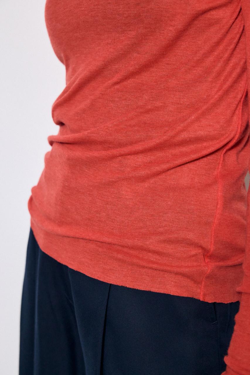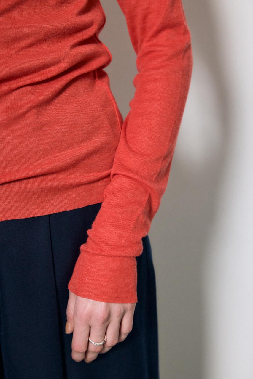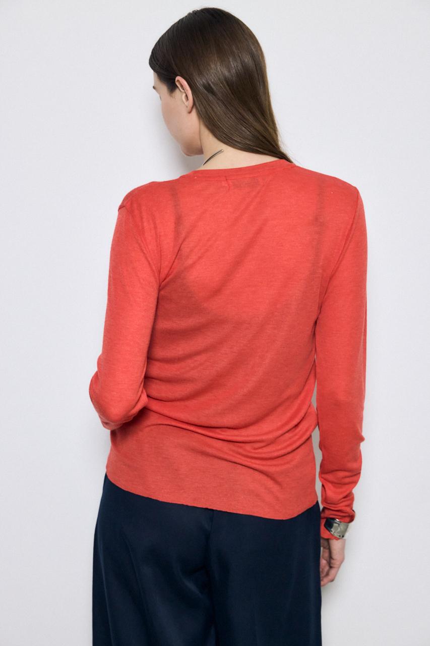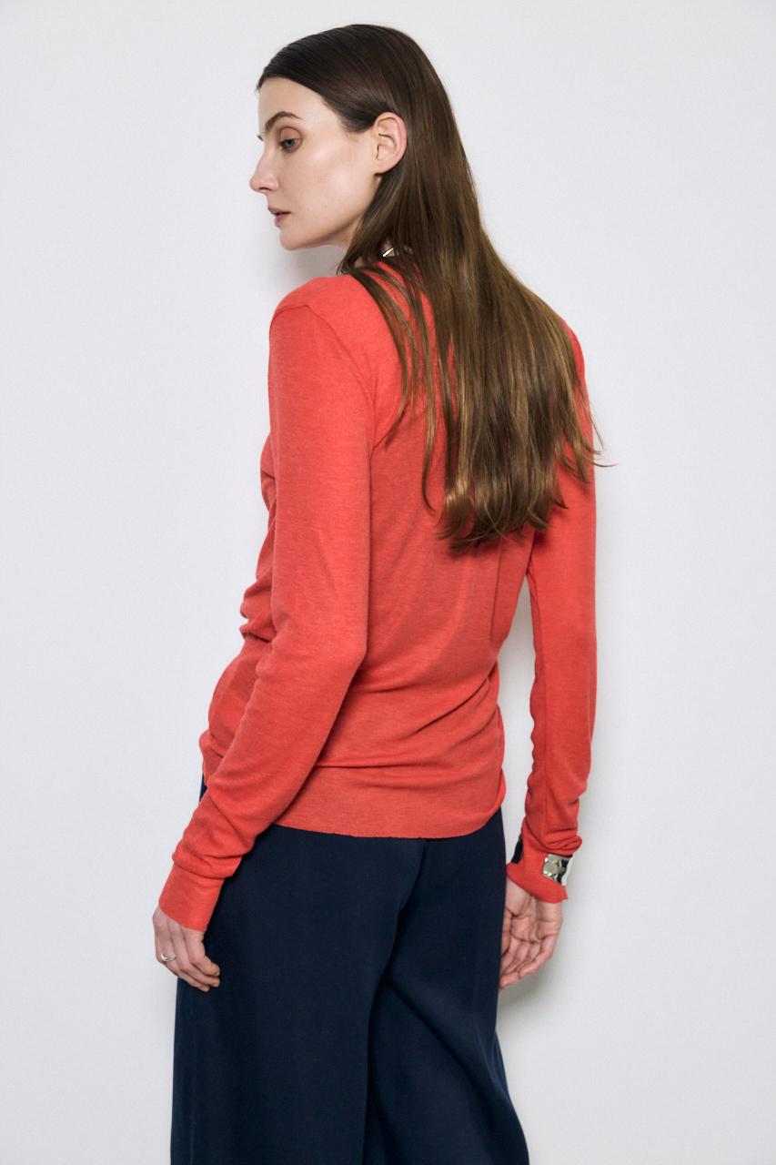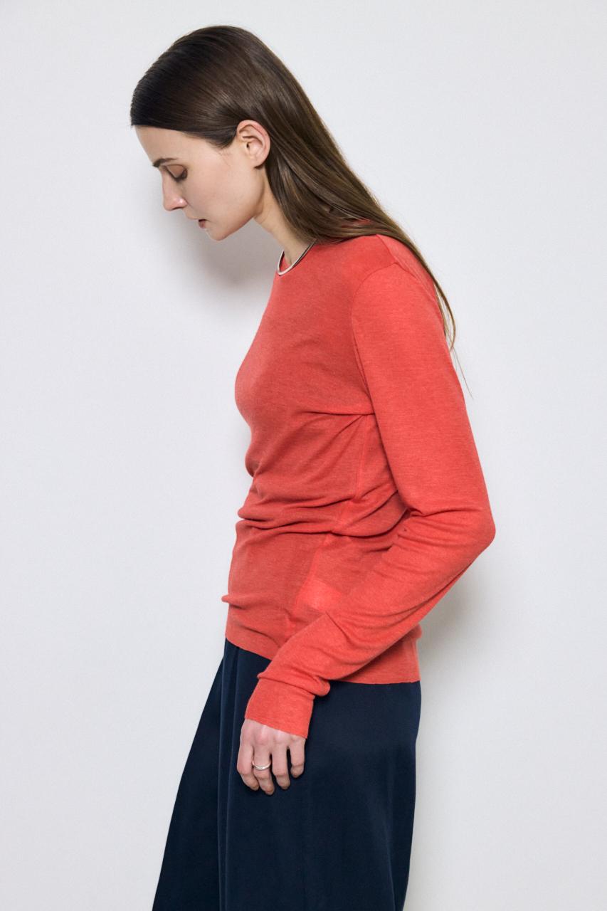 ベーシックなクルーネック仕様で、レイヤードしやすいデザイン。