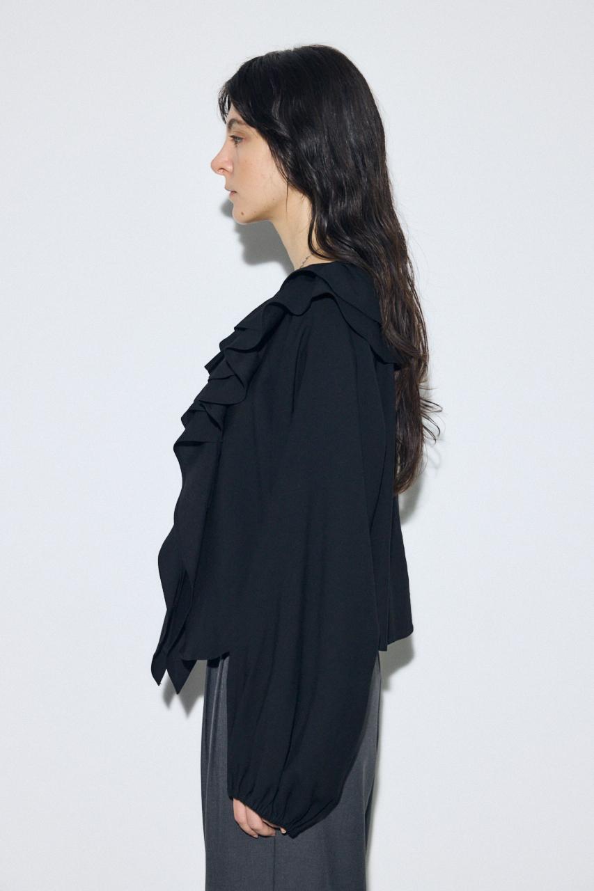 顔まわりを華やかに演出するラッフル襟が印象的なブラウス。