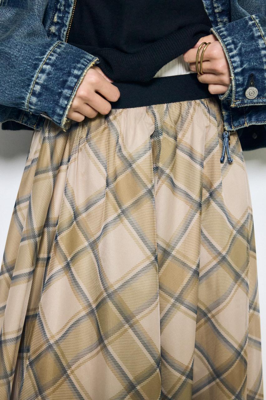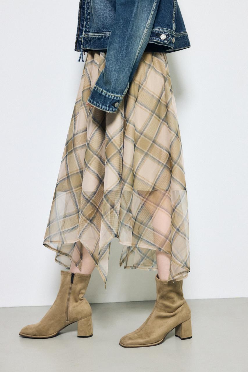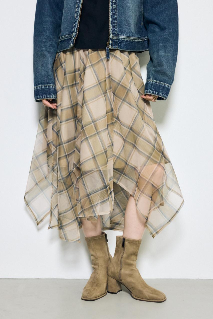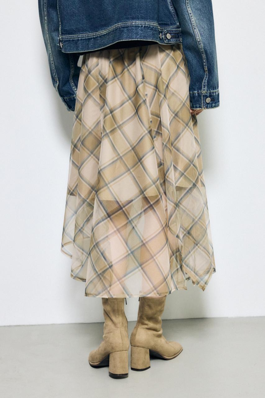 繊細なチェック柄とシフォン素材が軽やかに揺れるフレアスカート。