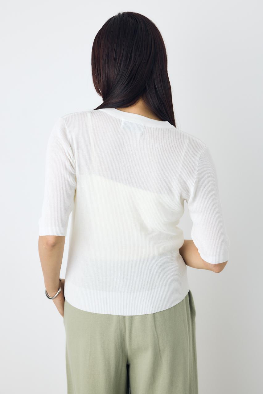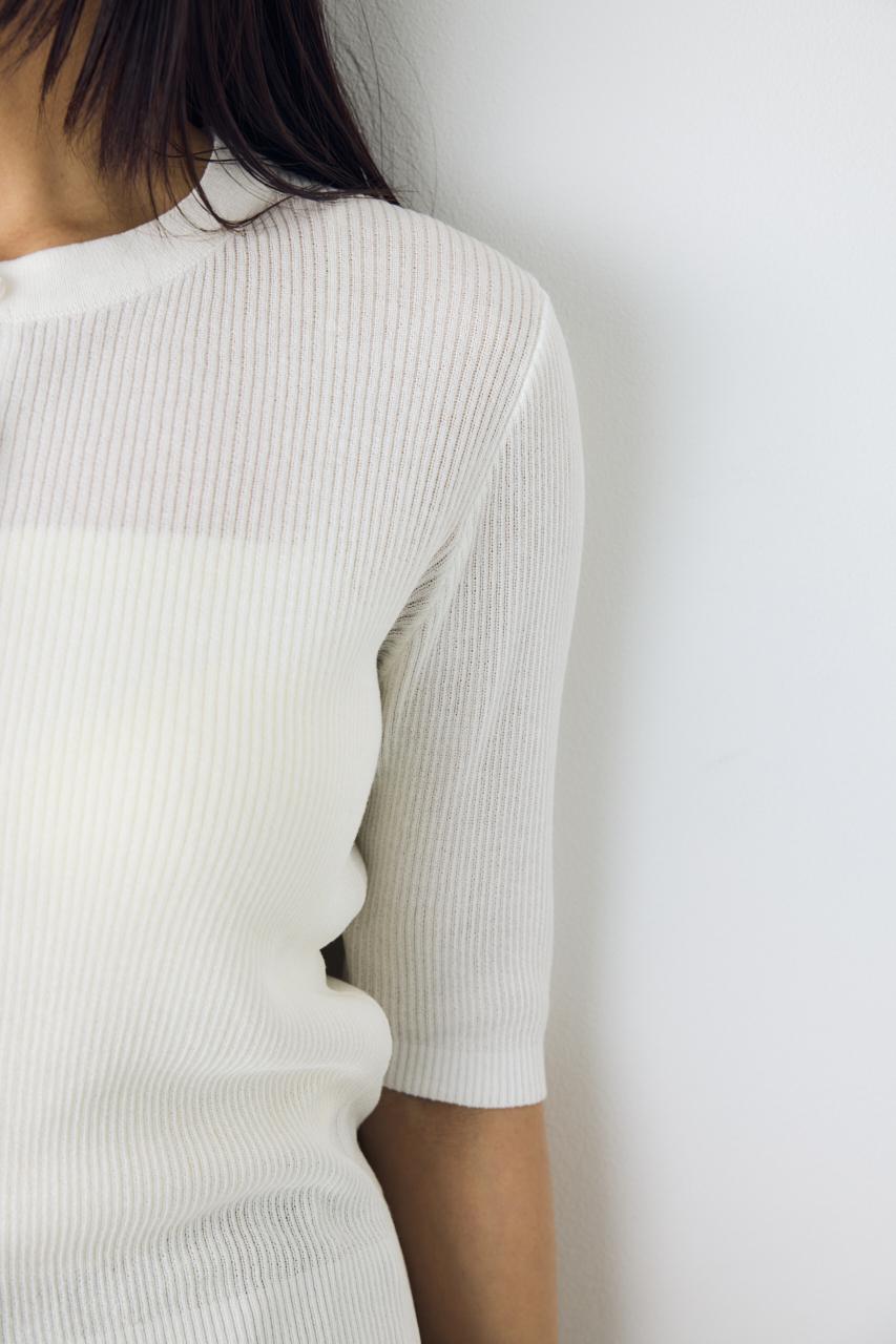 軽やかなシアー素材とリブ編みを組み合わせ、程よいフィット感と抜け感を両立。