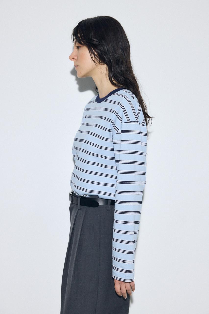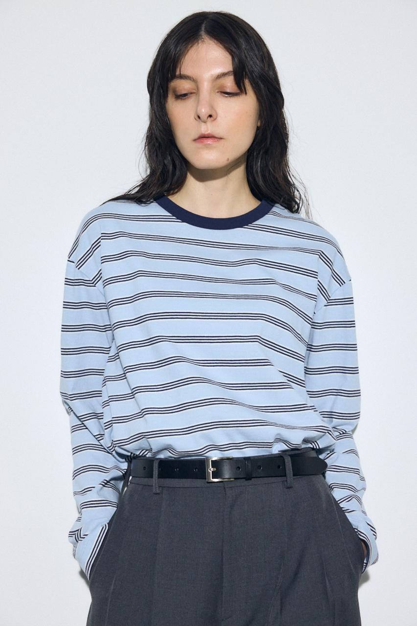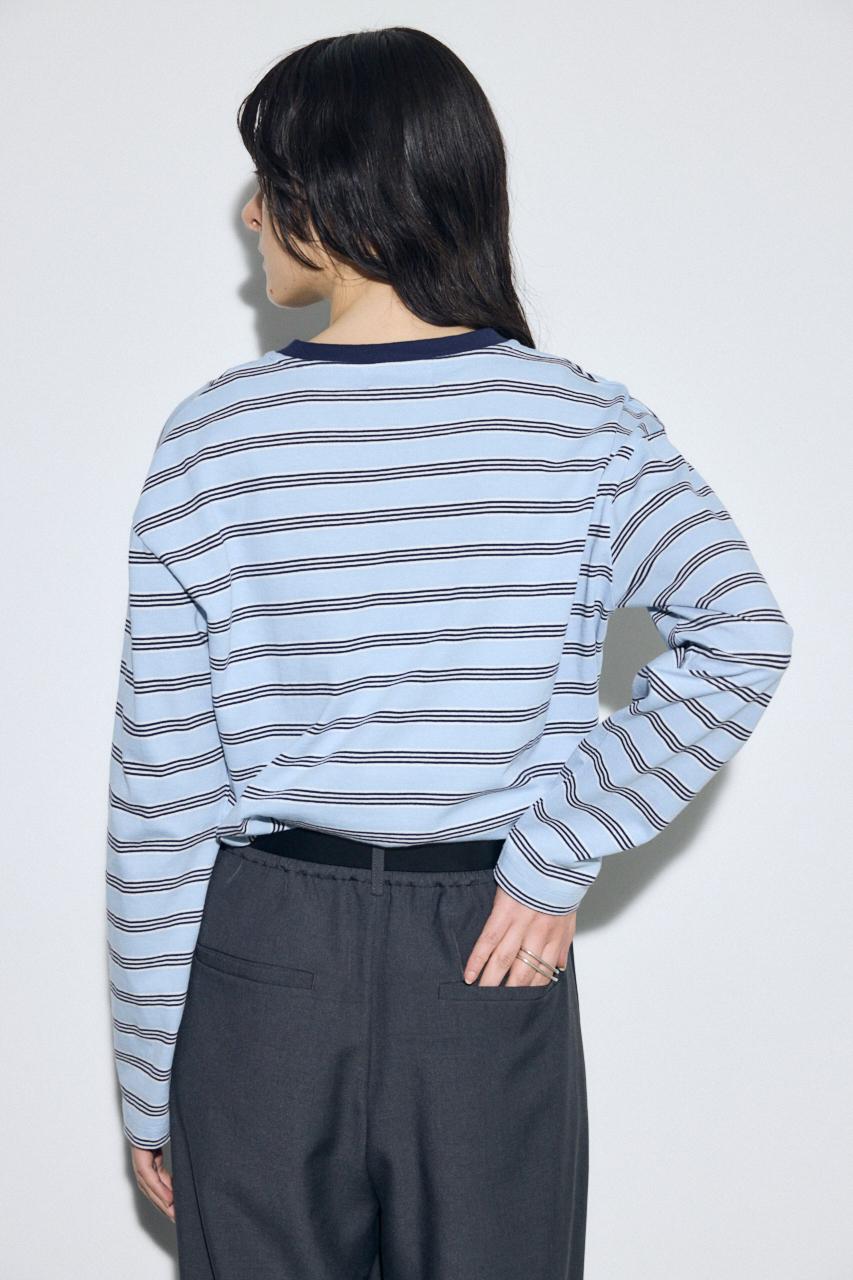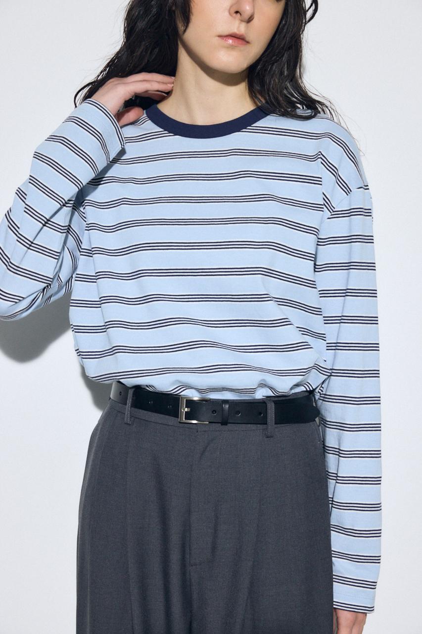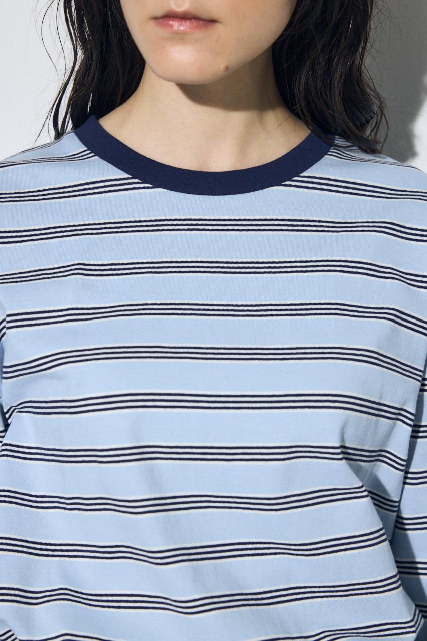 配色バランスにこだわったマルチボーダー柄が目を引く、長袖カットソートップス。