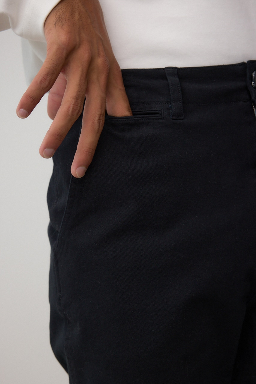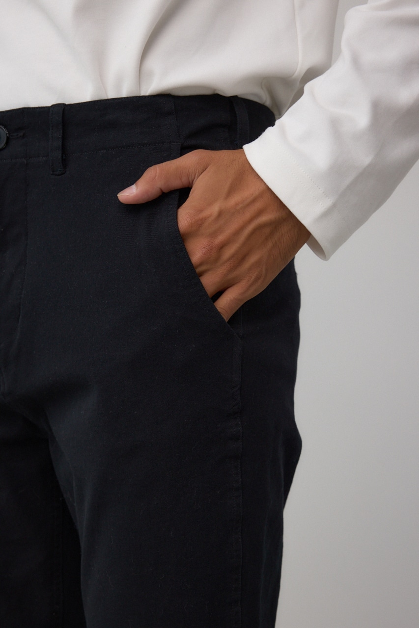 テーパードで清潔感ある細身シルエット、動きやすさときれい見えを両立。