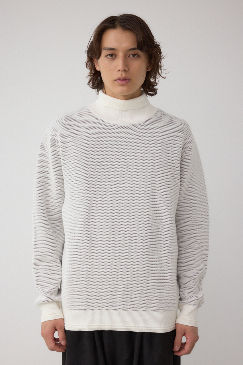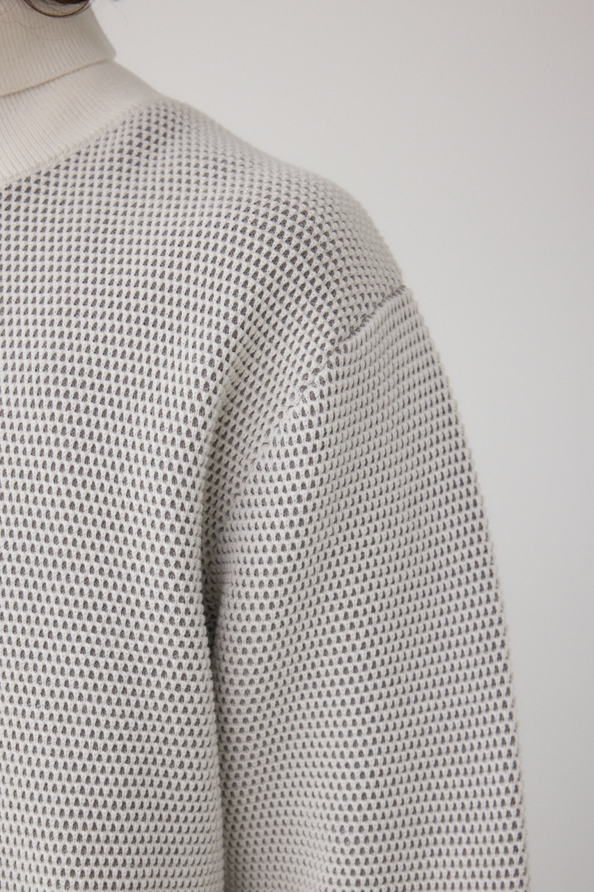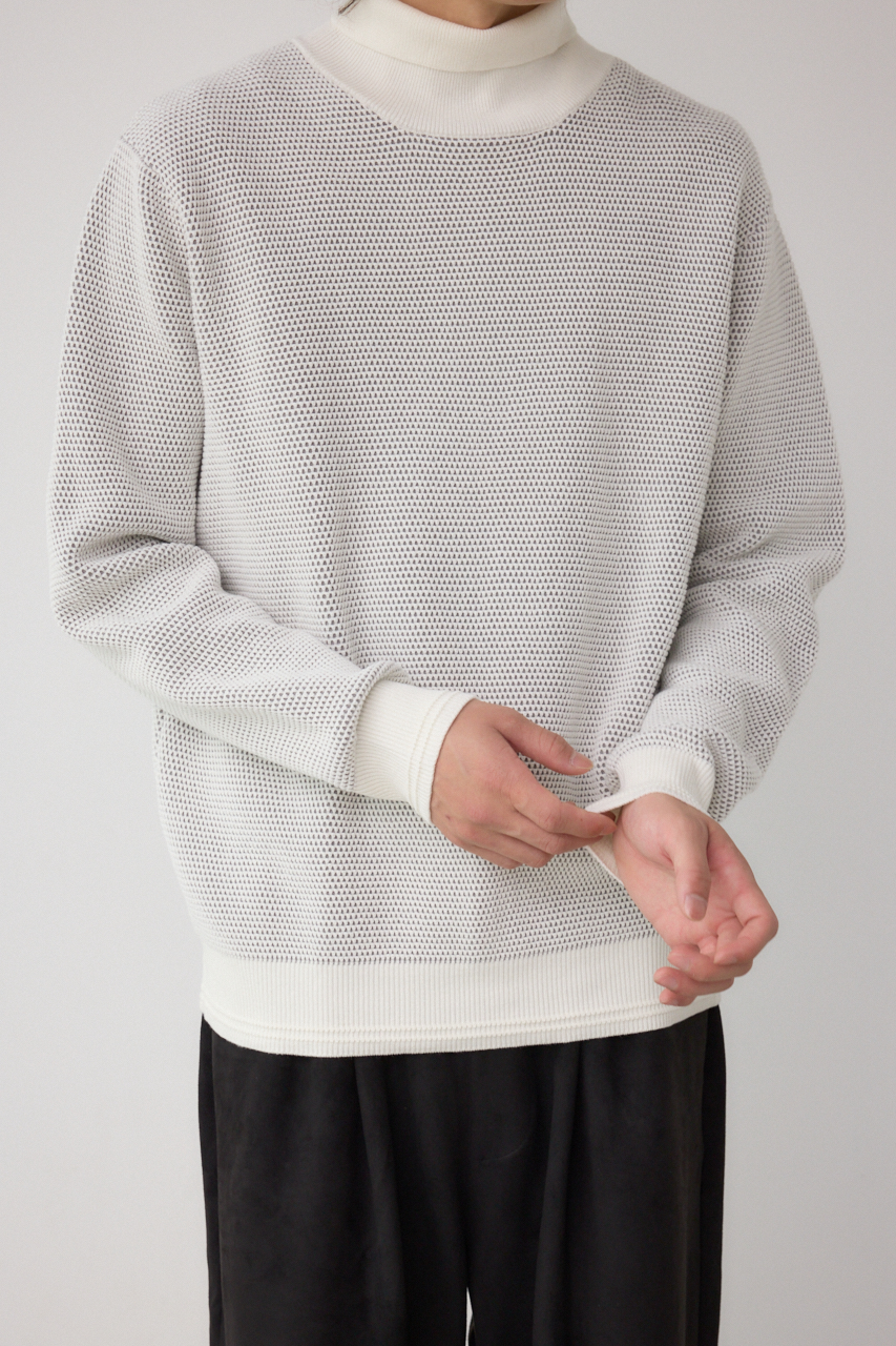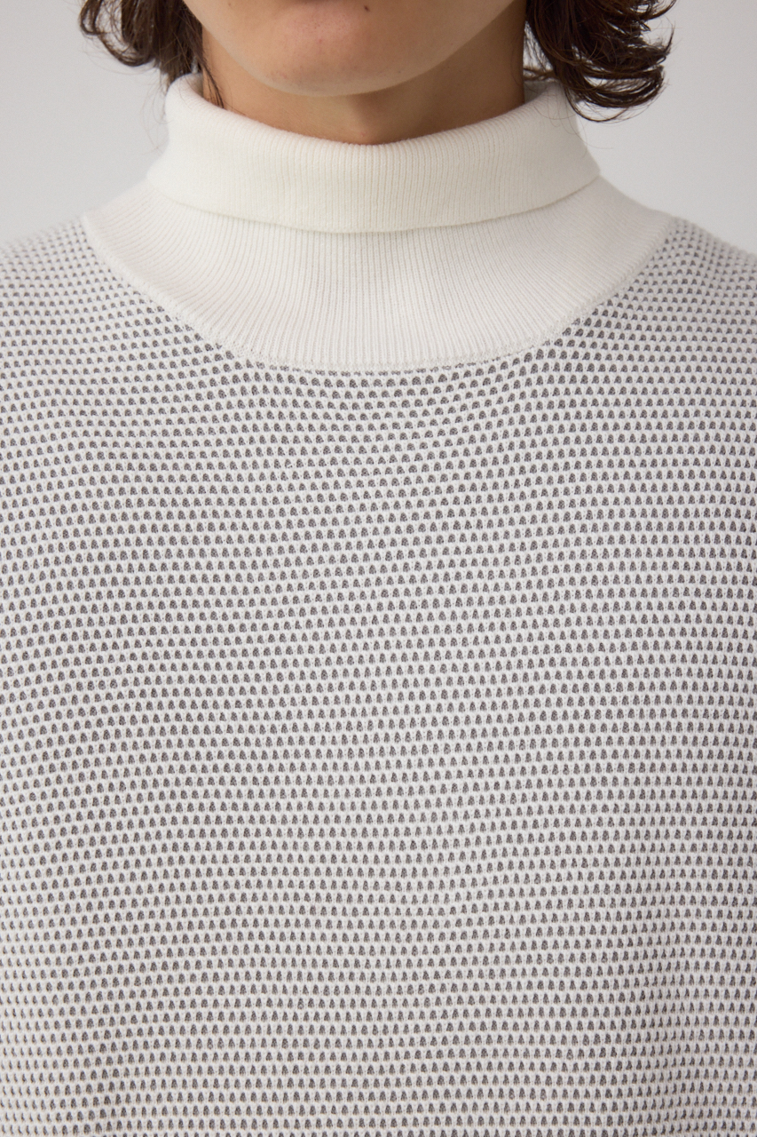 ハニカム編みのしっかりとしたボディに配色の編み柄を効かせたタートルネックニットです。