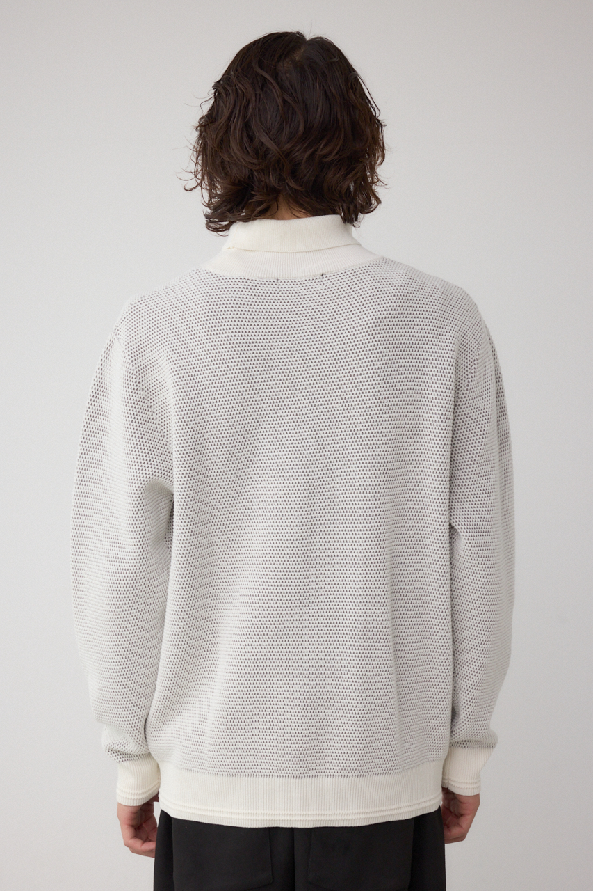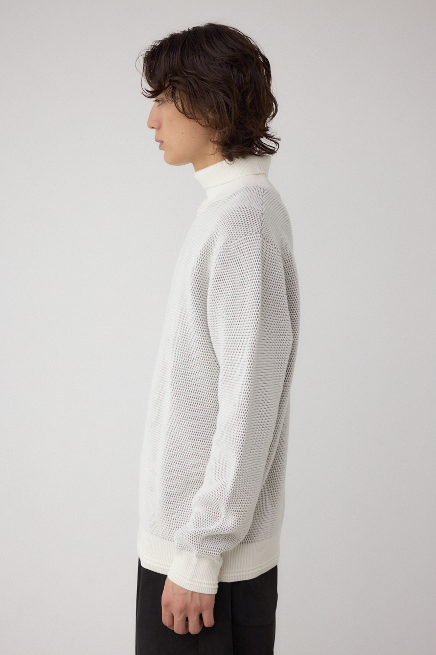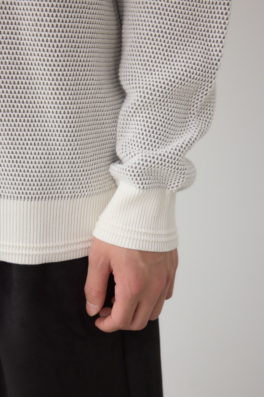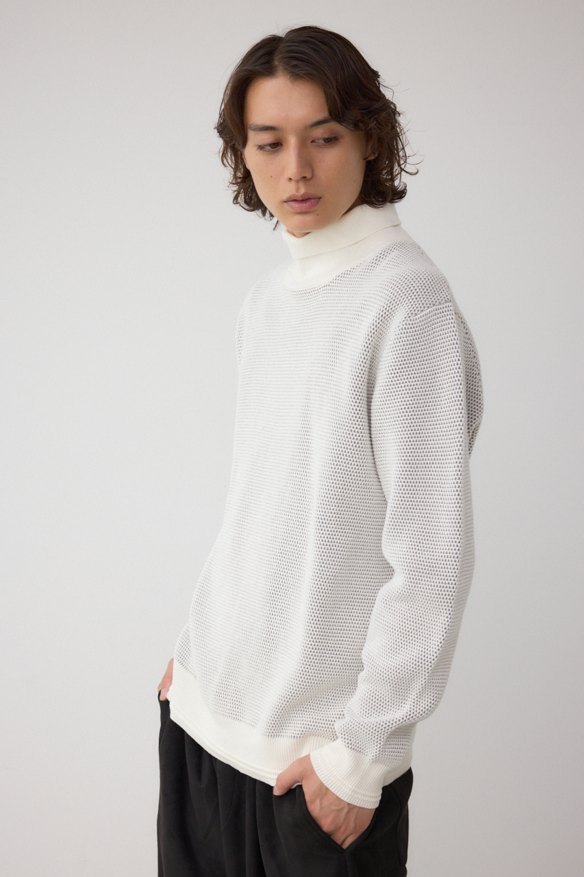 ハニカム編みのしっかりとしたボディに配色の編み柄を効かせたタートルネックニットです。