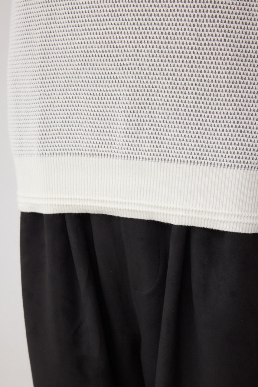 詰まったネックで防寒性が高く、ミニマルながら編地の表情がポイントになる一着。
