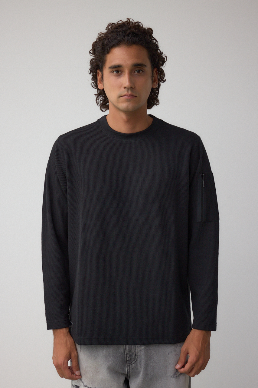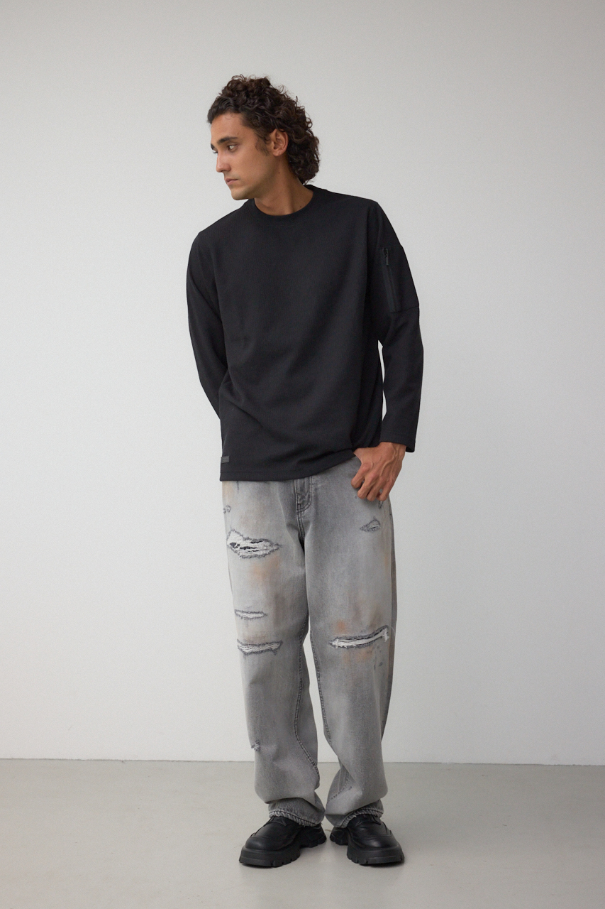 袖のスリーブポケットがアクセント兼実用的なディテールとなり、シンプルながらこなれた印象に。