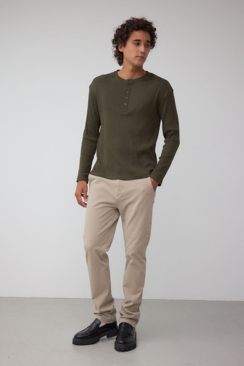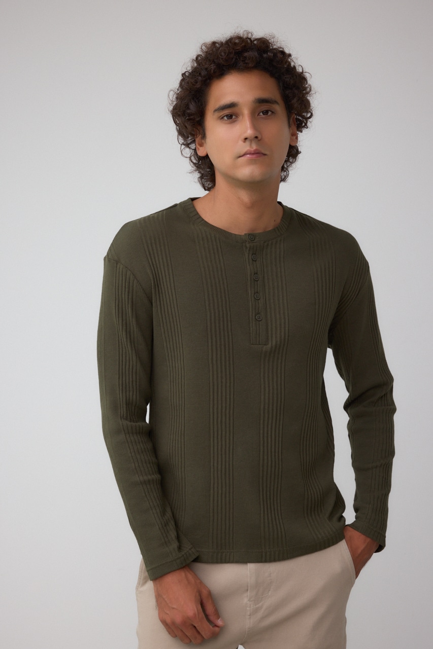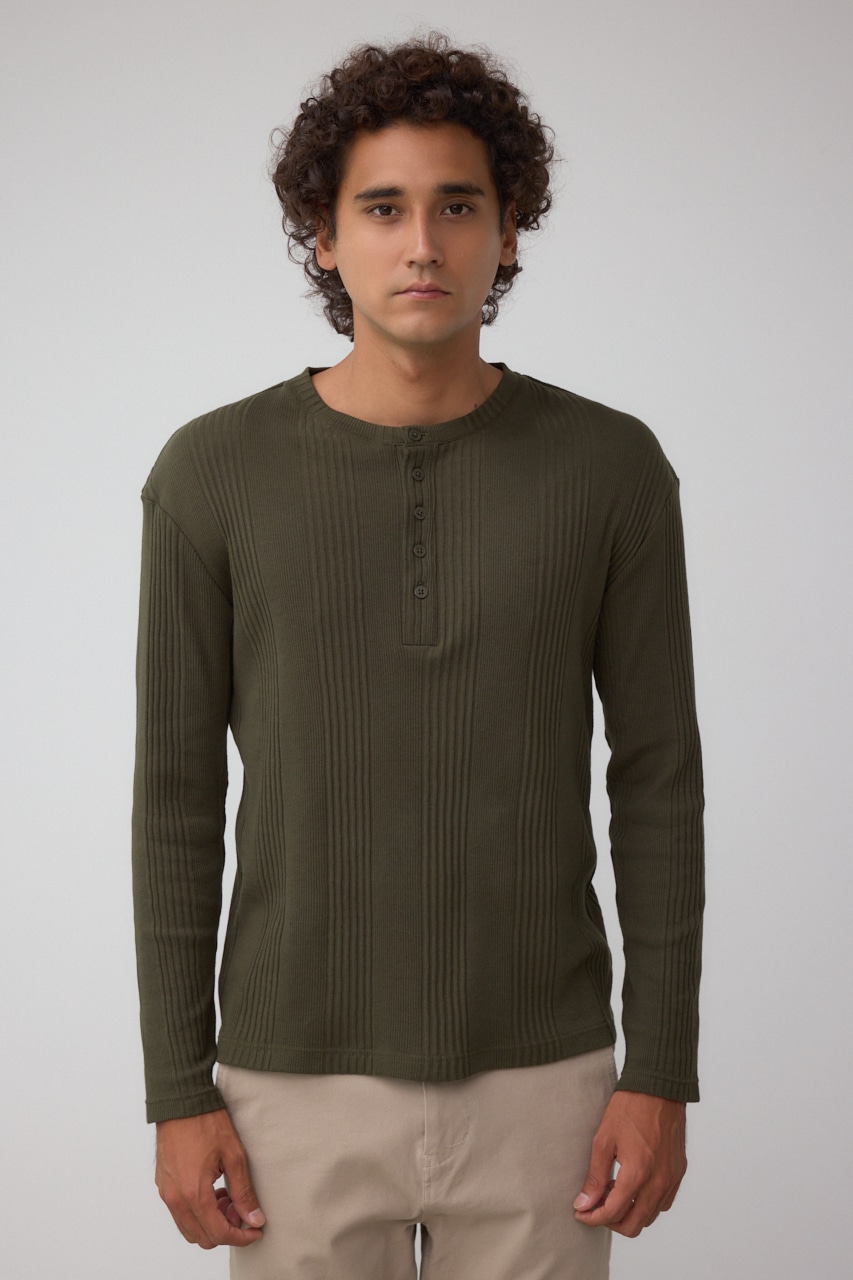 ランダムリブデザインのヘンリーネックTシャツになります。