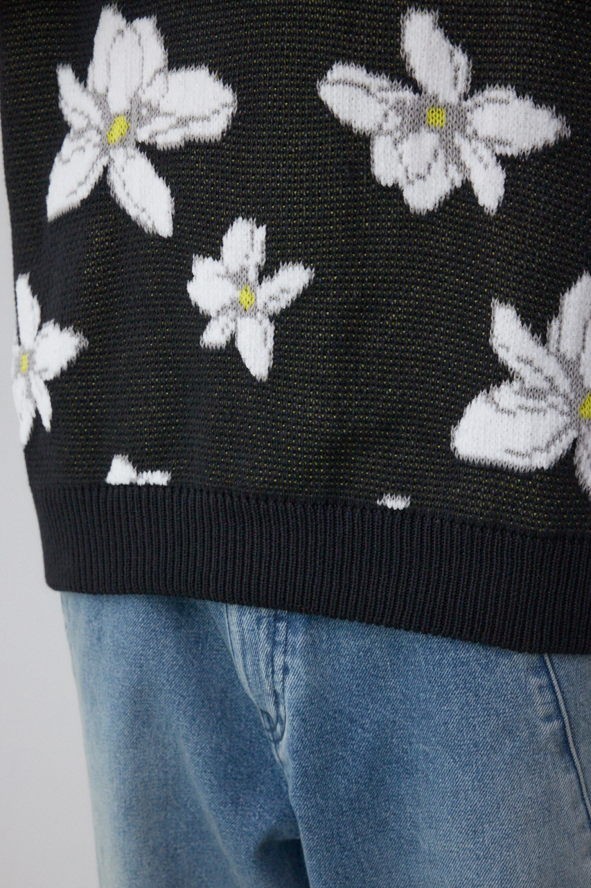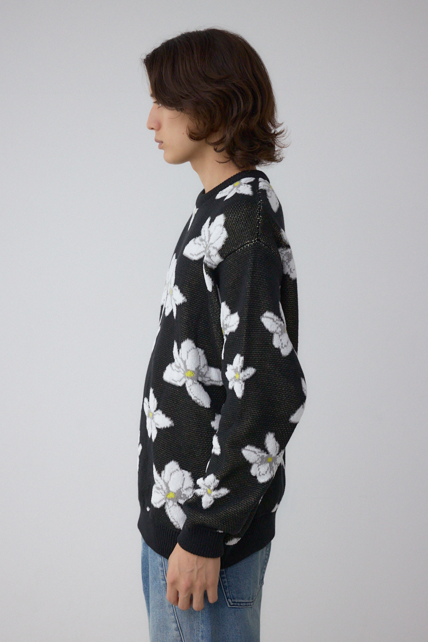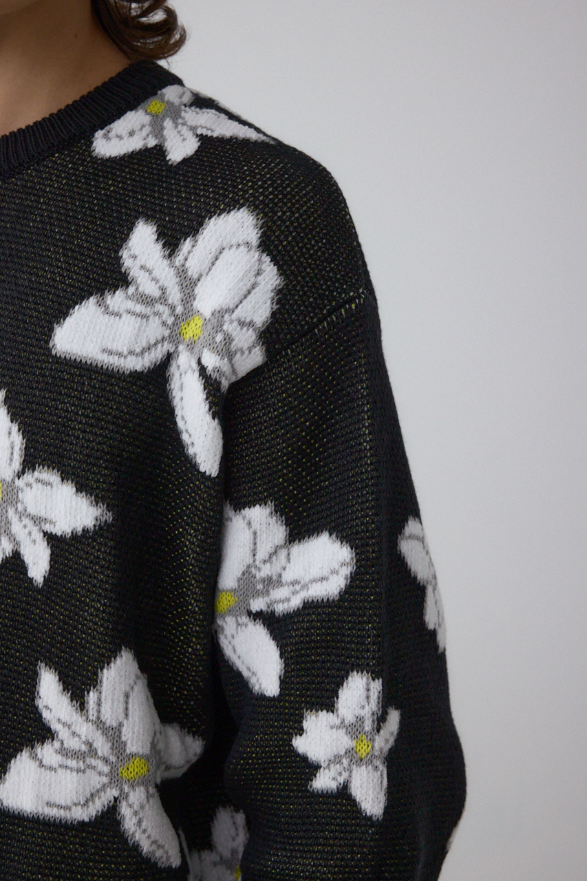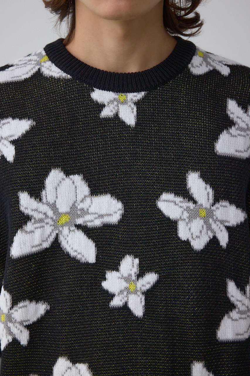 モール糸とコットンタッチのポリエステルを組み合わせた花柄ダブルジャガードニットです。