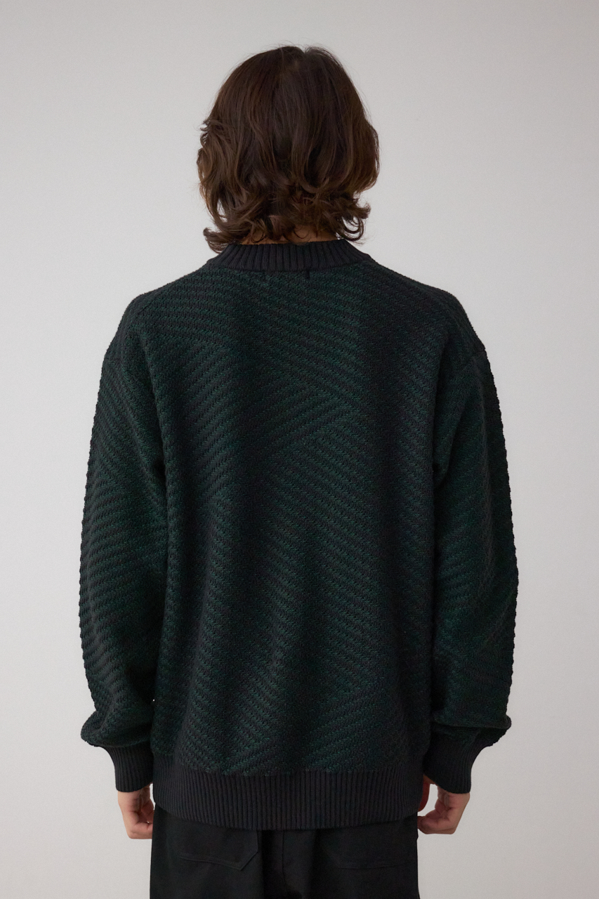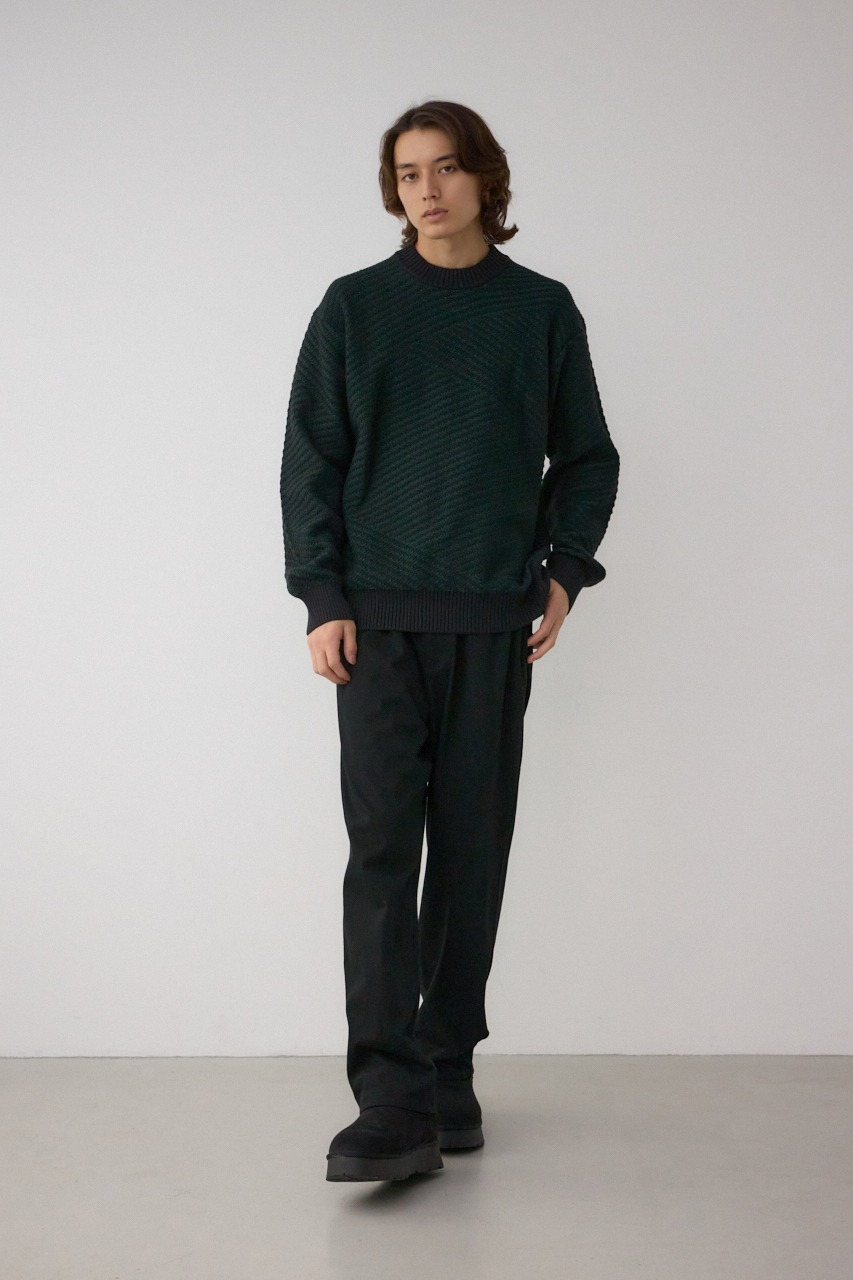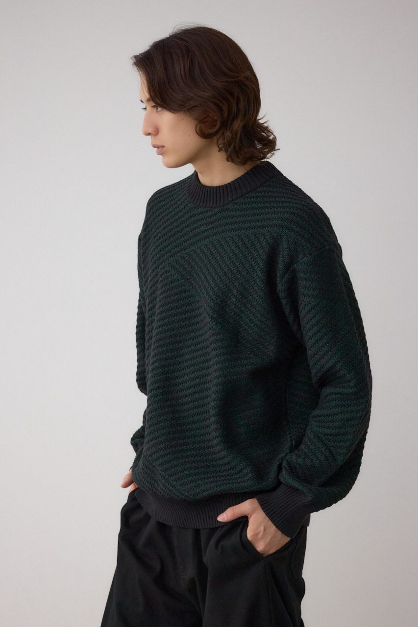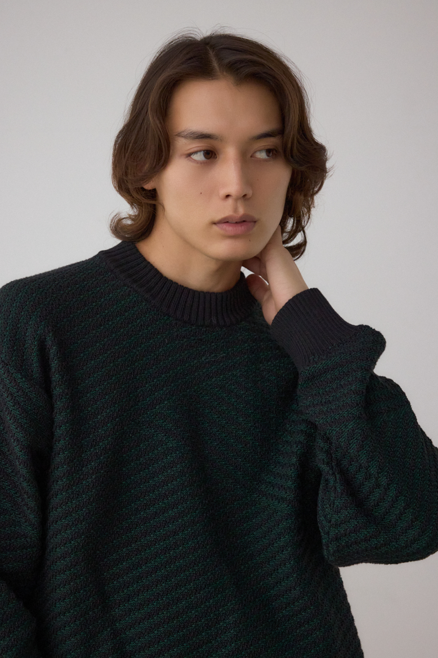 幾何学的な切り替えとジグトーンのダブルジャガードで立体感と存在感を出したニットトップスです。