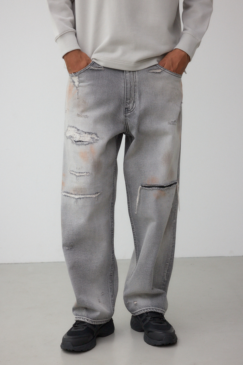 ヴィンテージ風のダメージ加工が特徴的なワイドデニムになります。
