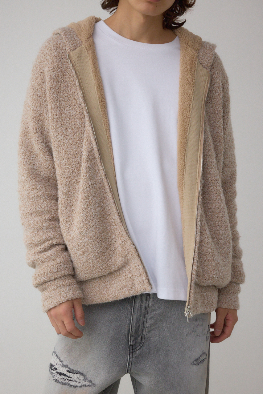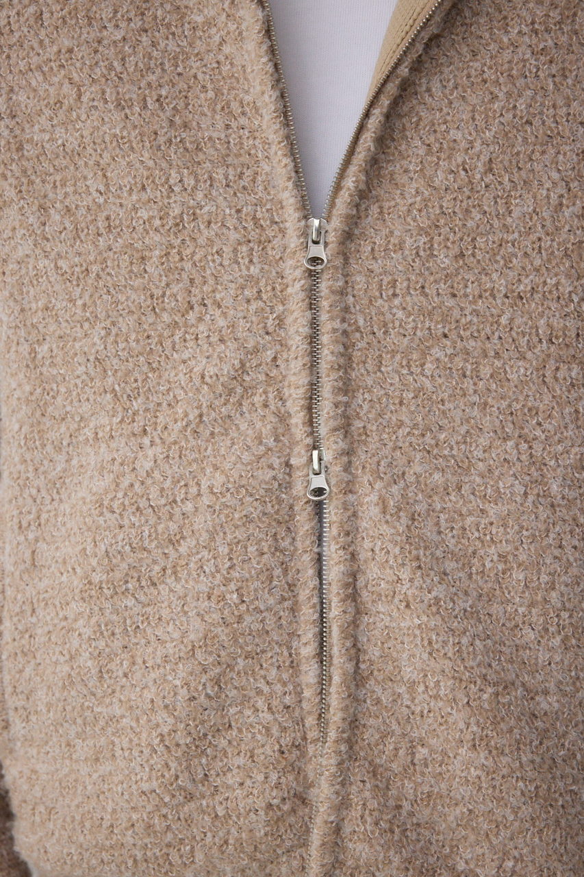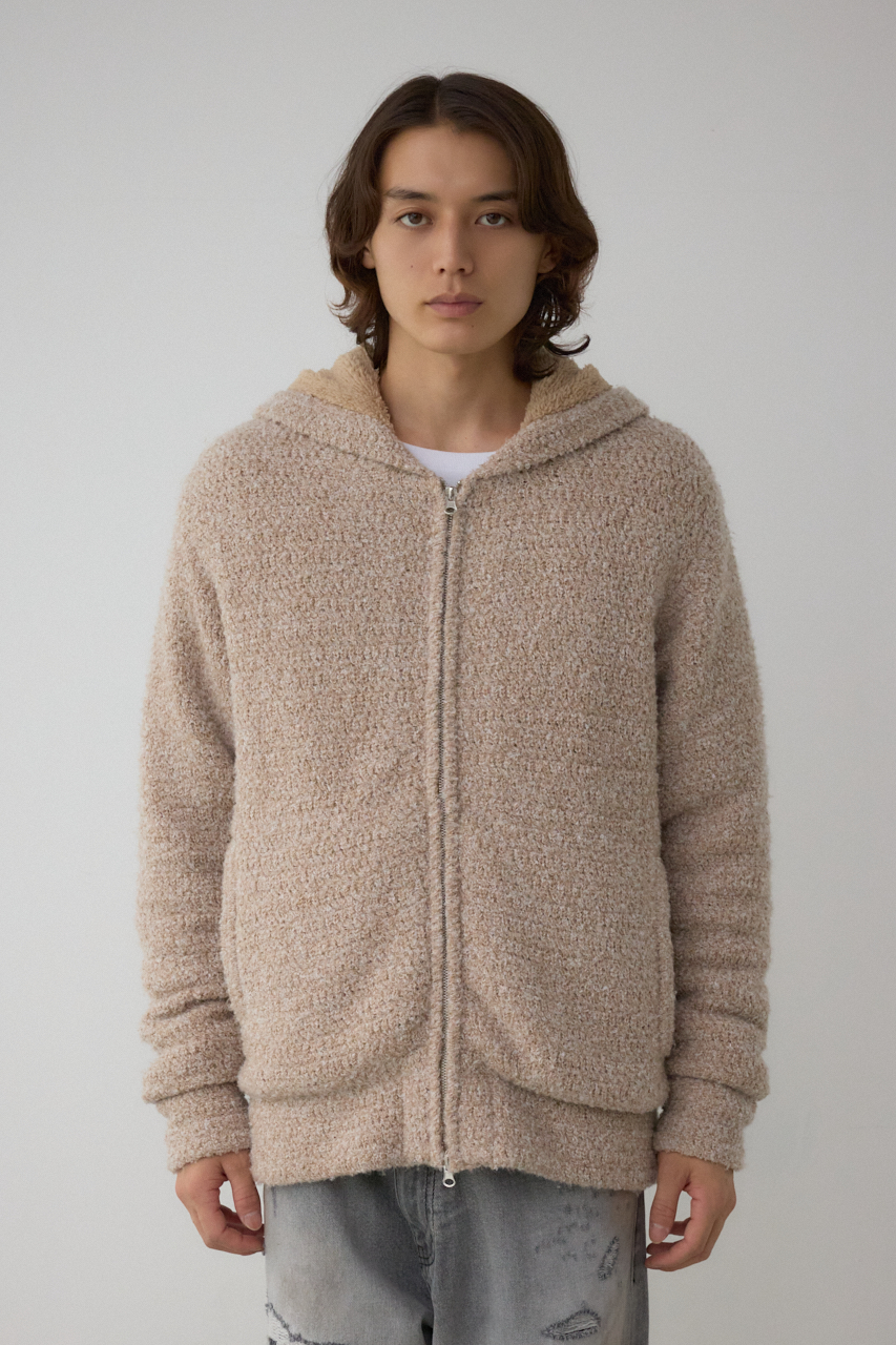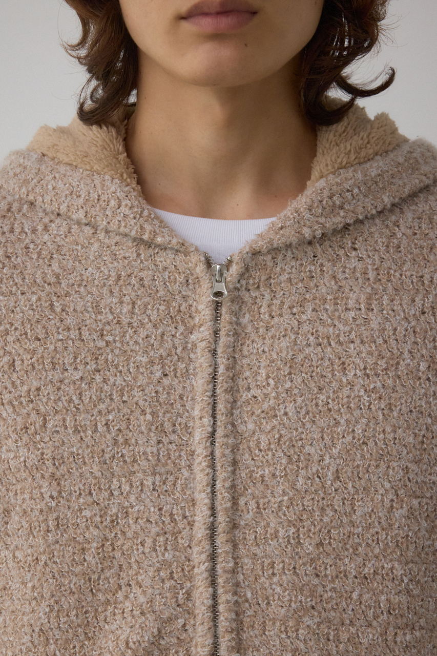 ブークレー糸のミドルゲージ柄編みでミックス感と温もりを演出したジップパーカーです。