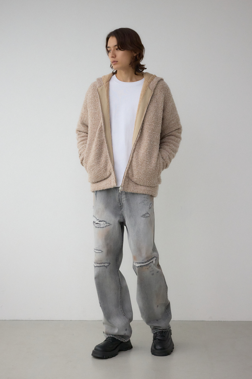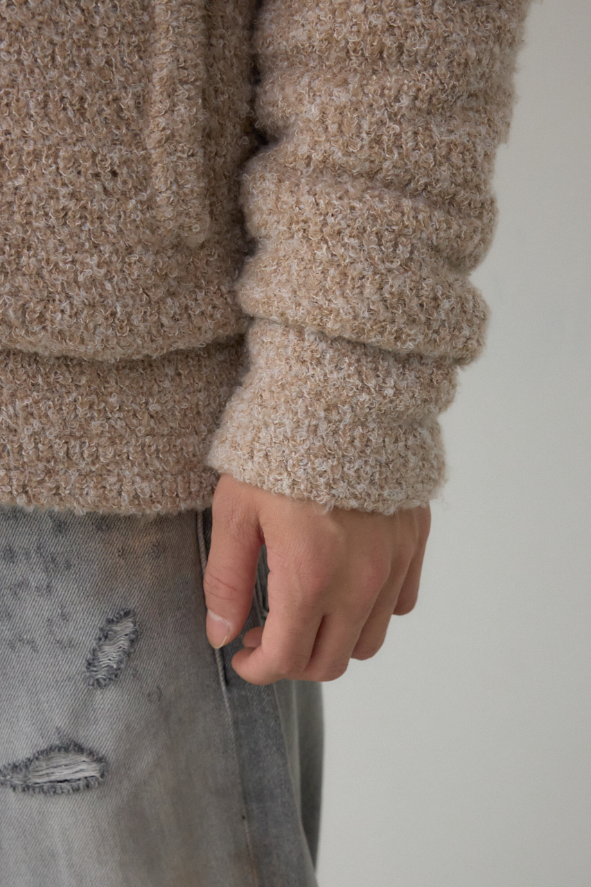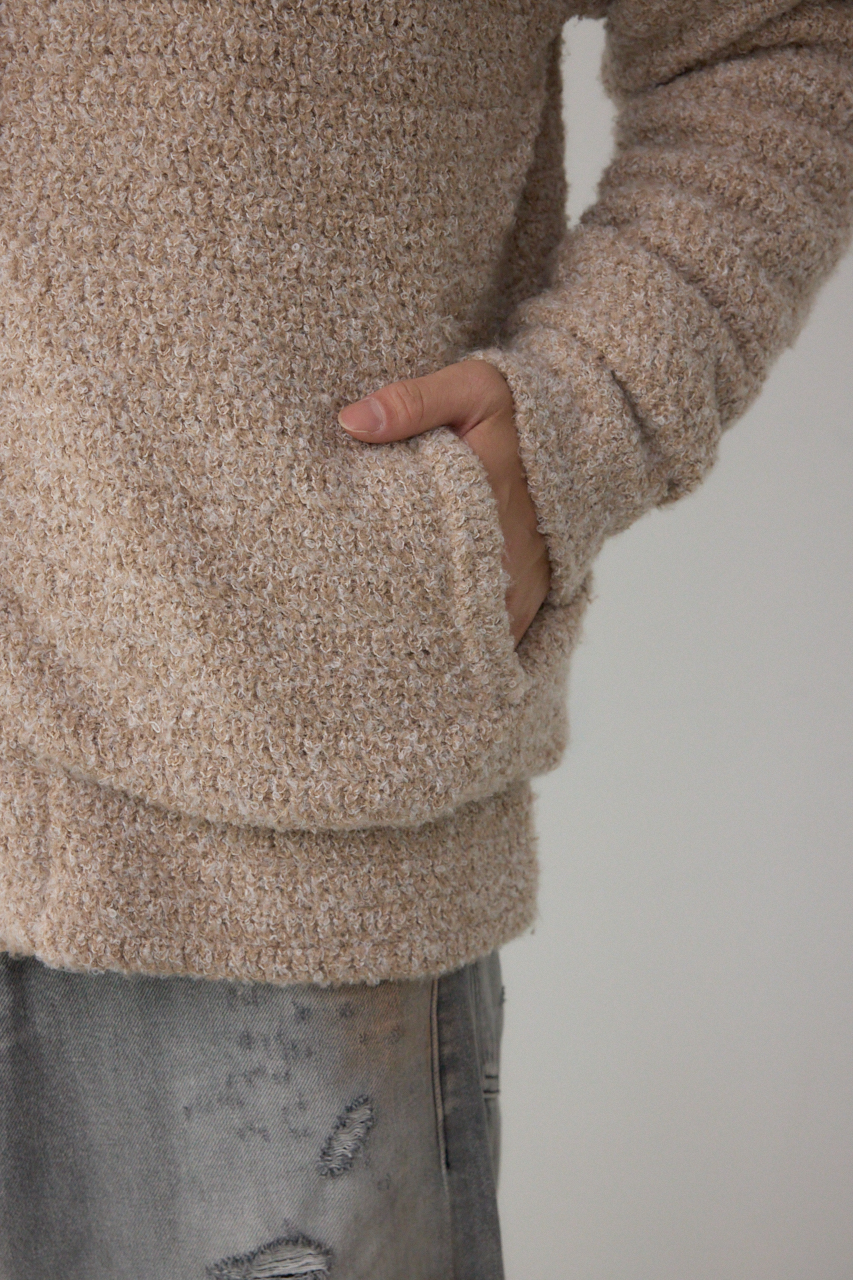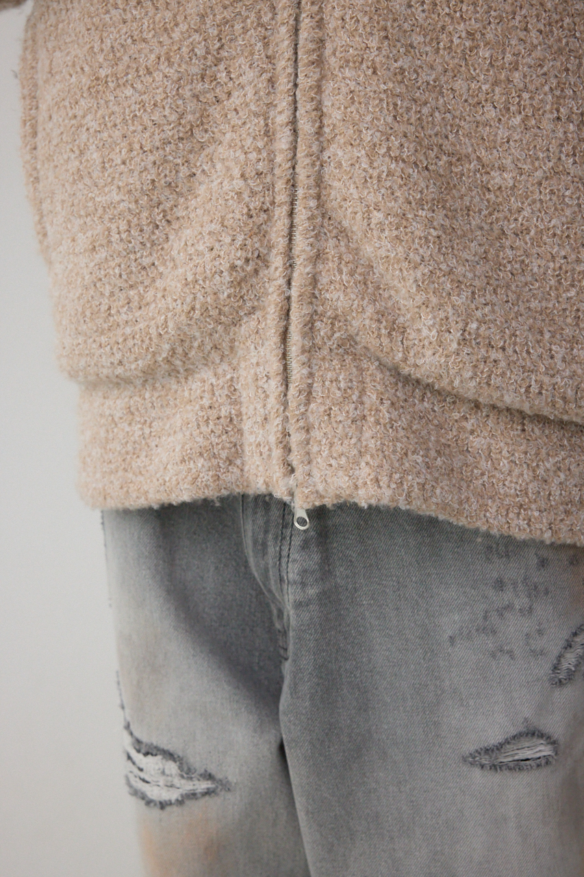 ブークレー糸のミドルゲージ柄編みでミックス感と温もりを演出したジップパーカーです。