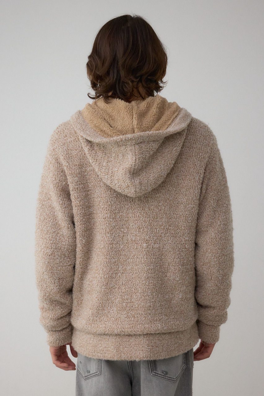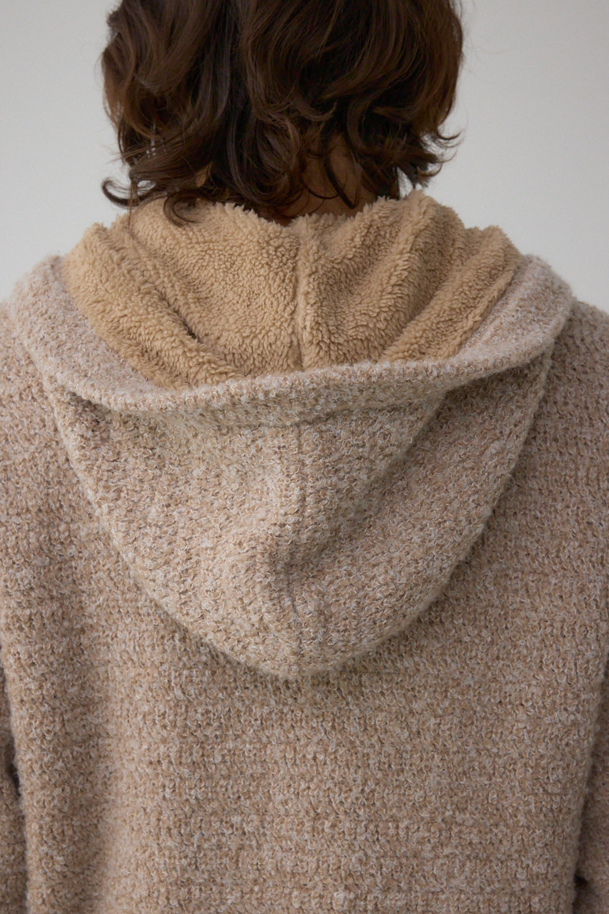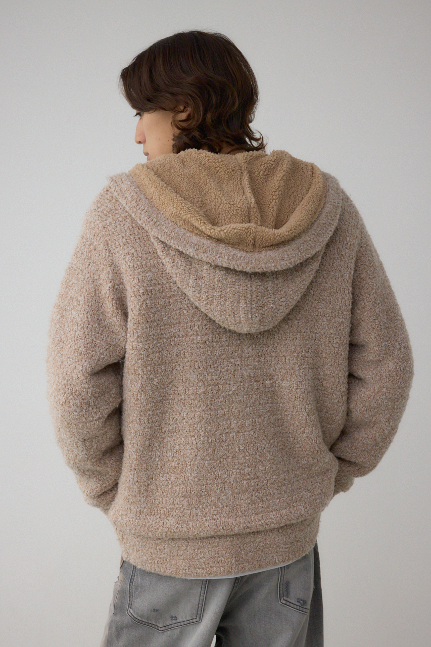 程よい厚みのあるニット身頃とフード裏には裏ボアを施しています。