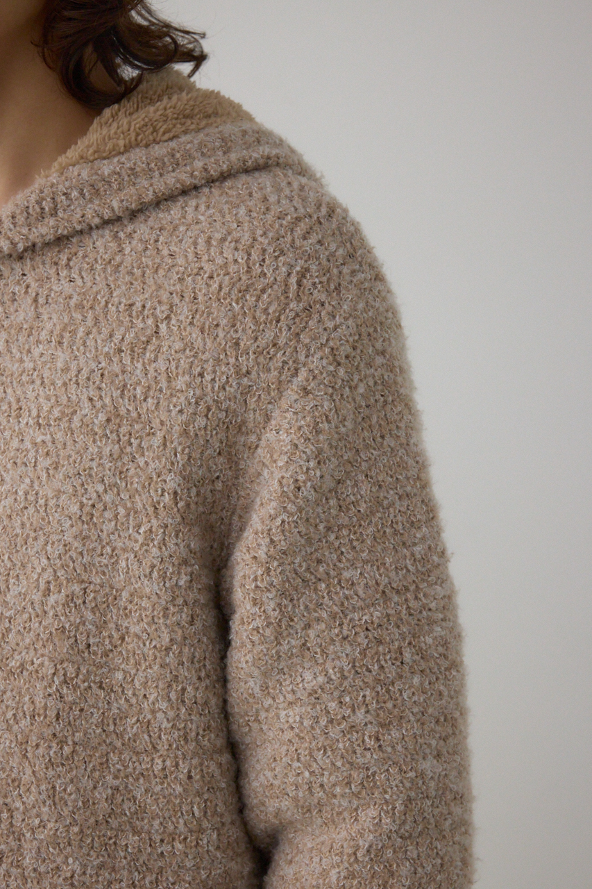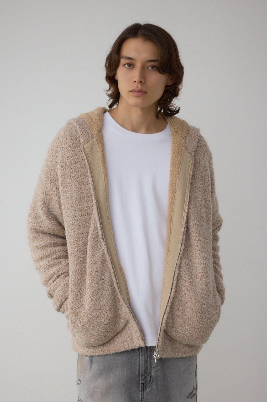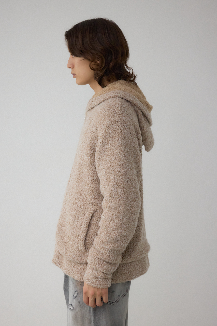 程よい厚みのあるニット身頃とフード裏には裏ボアを施しています。