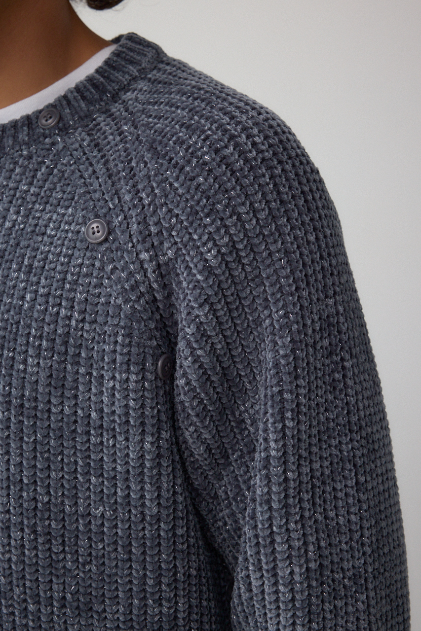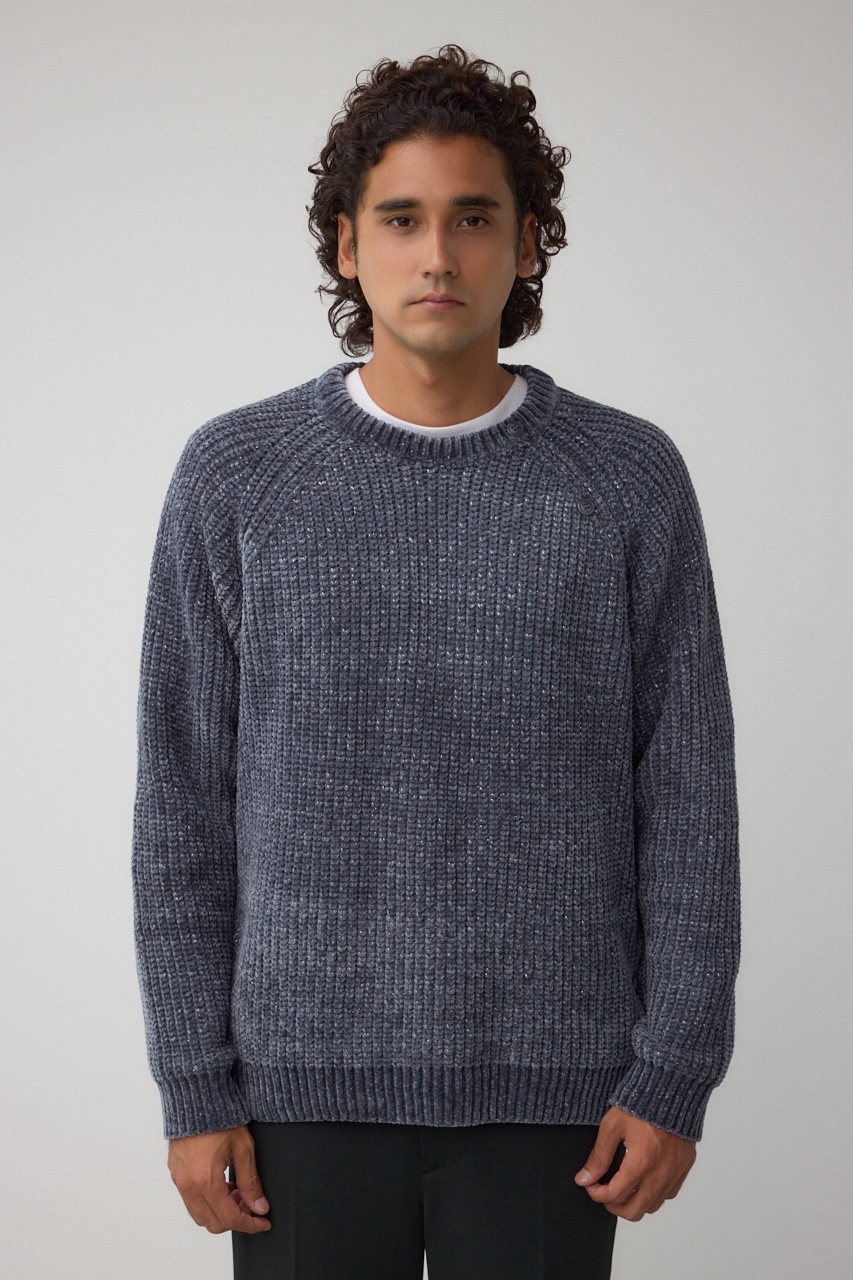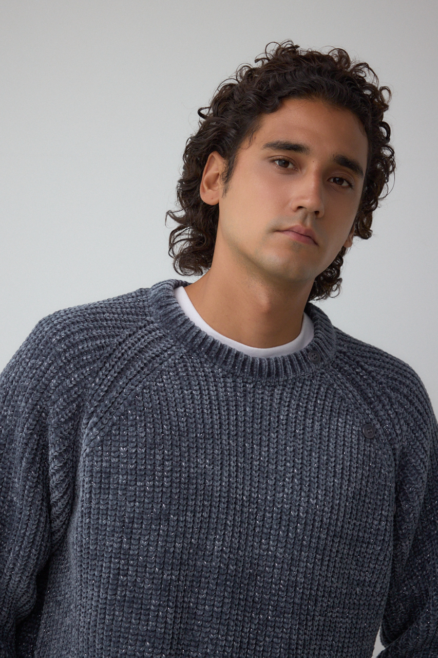 モールヤーンを使用し、軽く、柔らかくモチモチした風合いとラメの光沢感の対比のミックス感が特徴です。