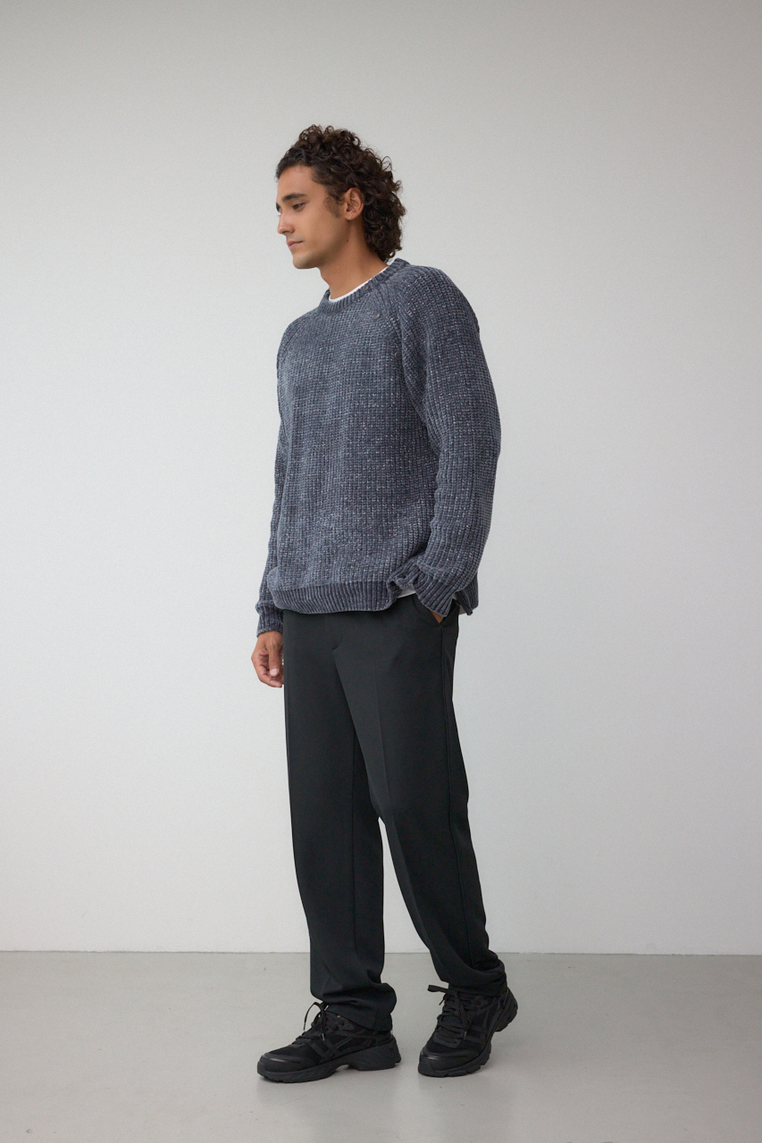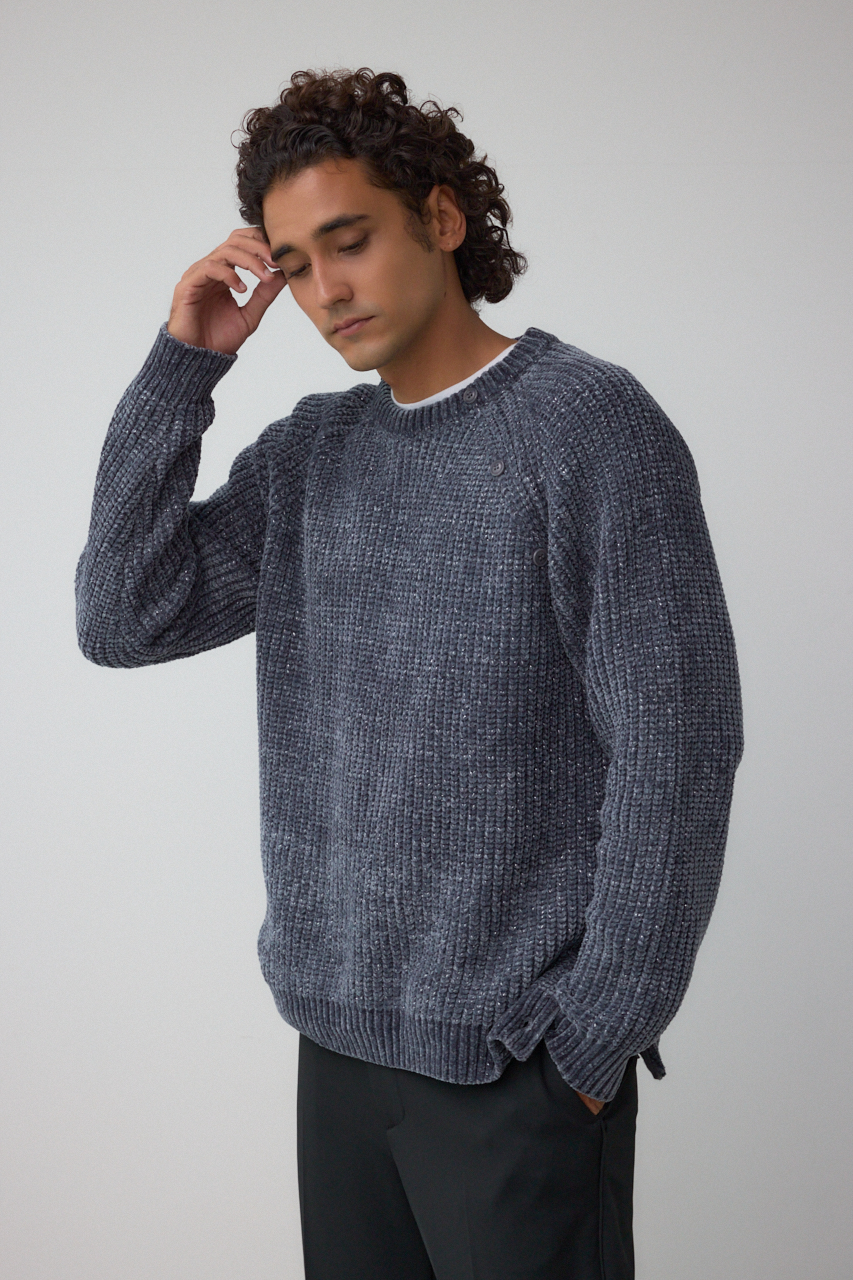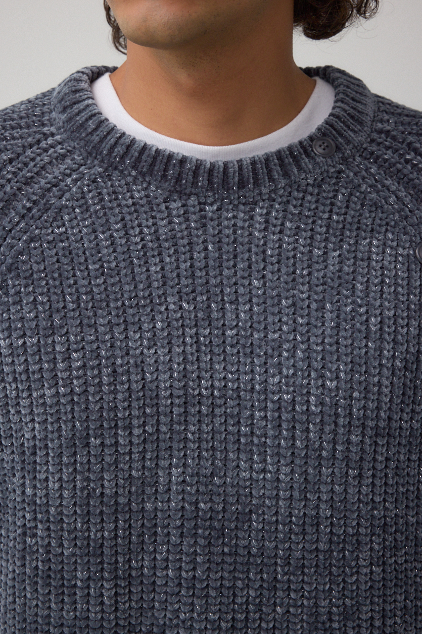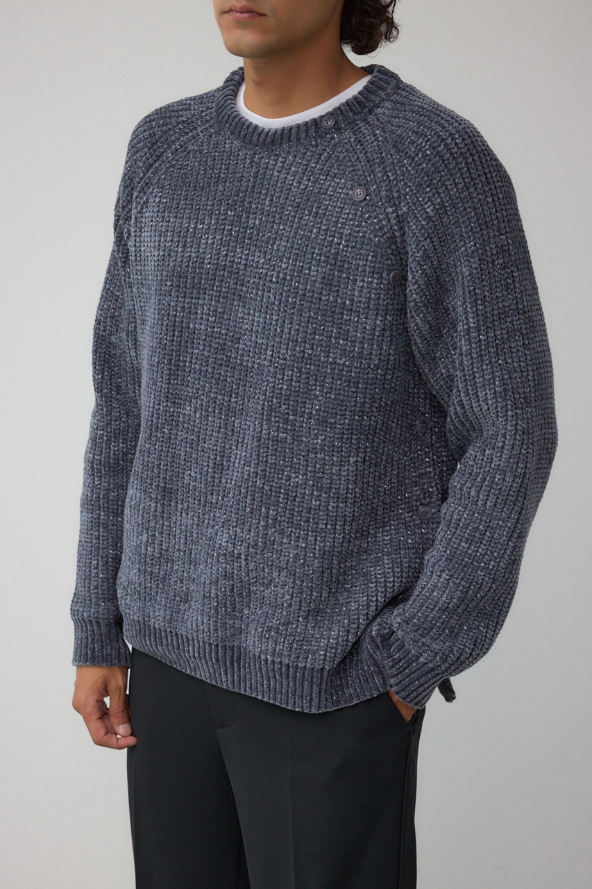 モールヤーンを使用し、軽く、柔らかくモチモチした風合いとラメの光沢感の対比のミックス感が特徴です。
