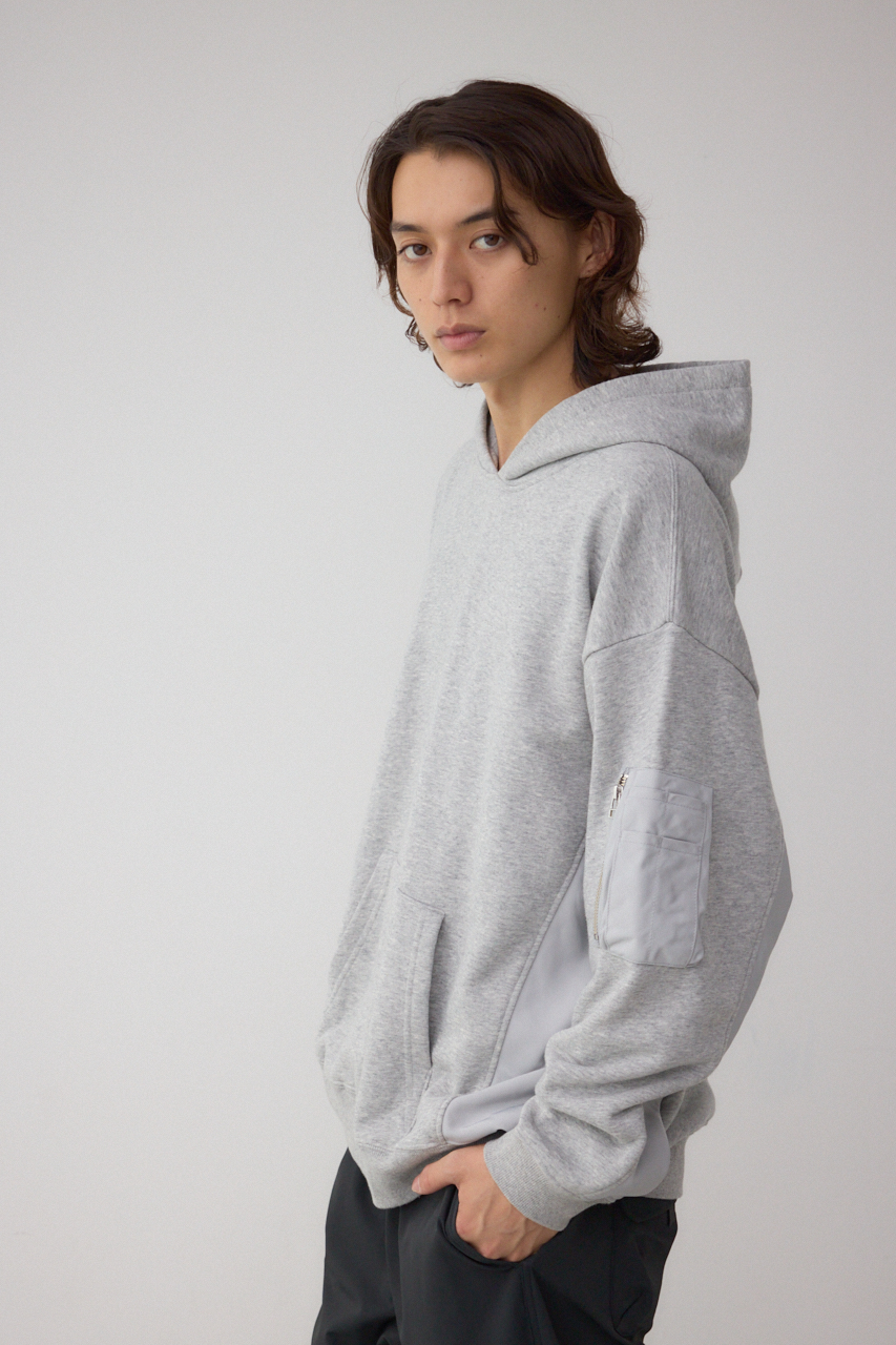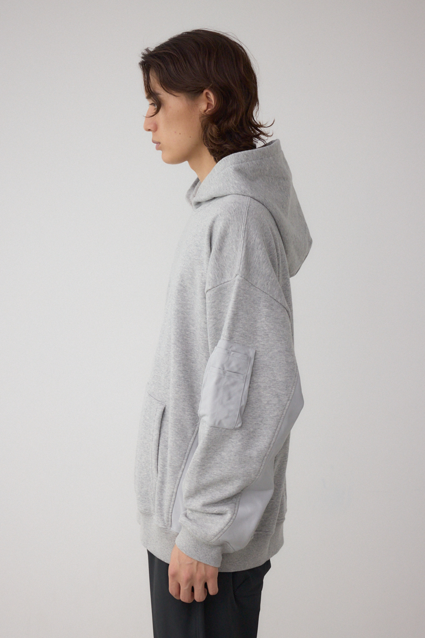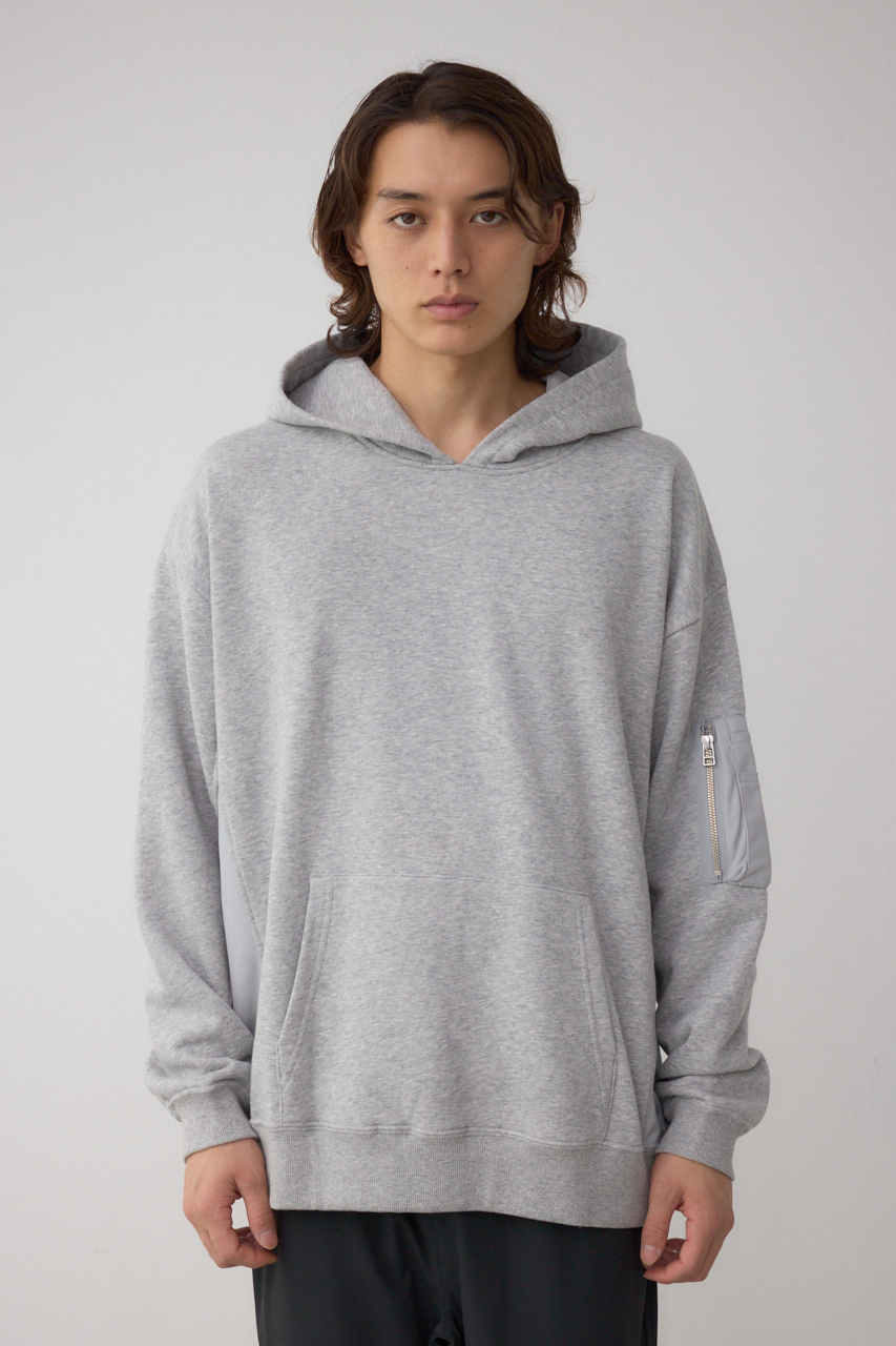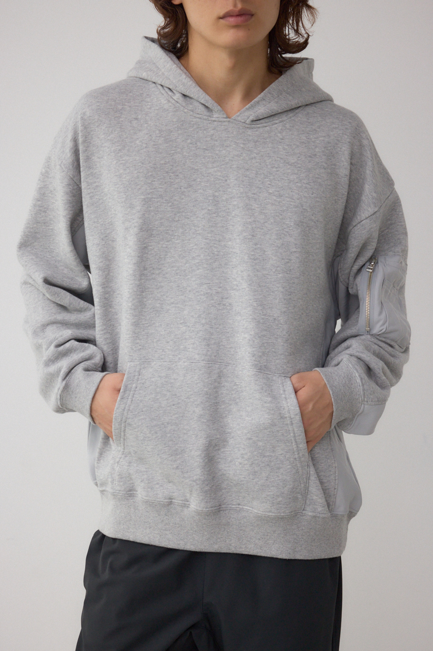 裏毛のカジュアル感に光沢のある布帛をドッキングし、程よいモード感をプラス。