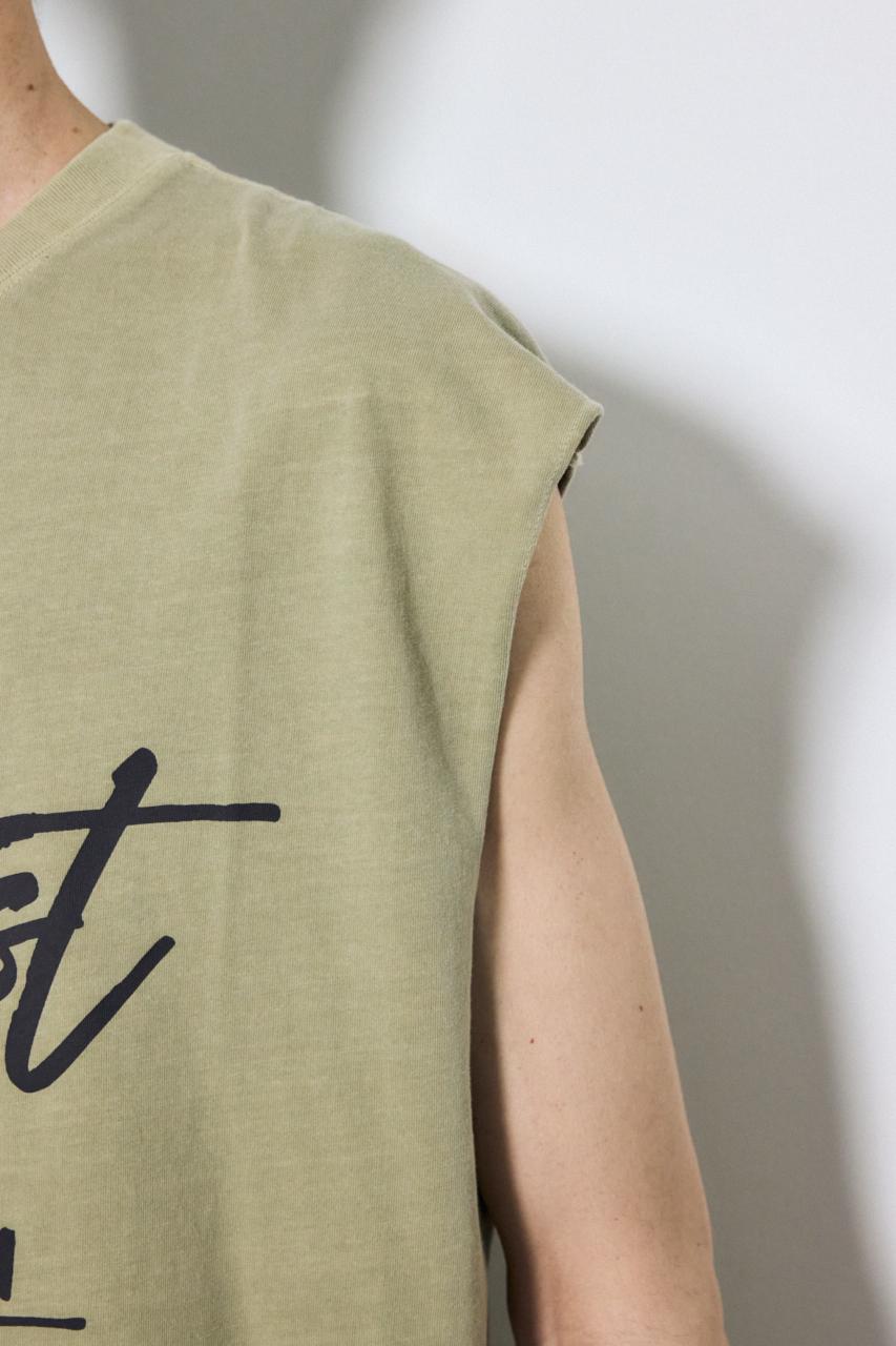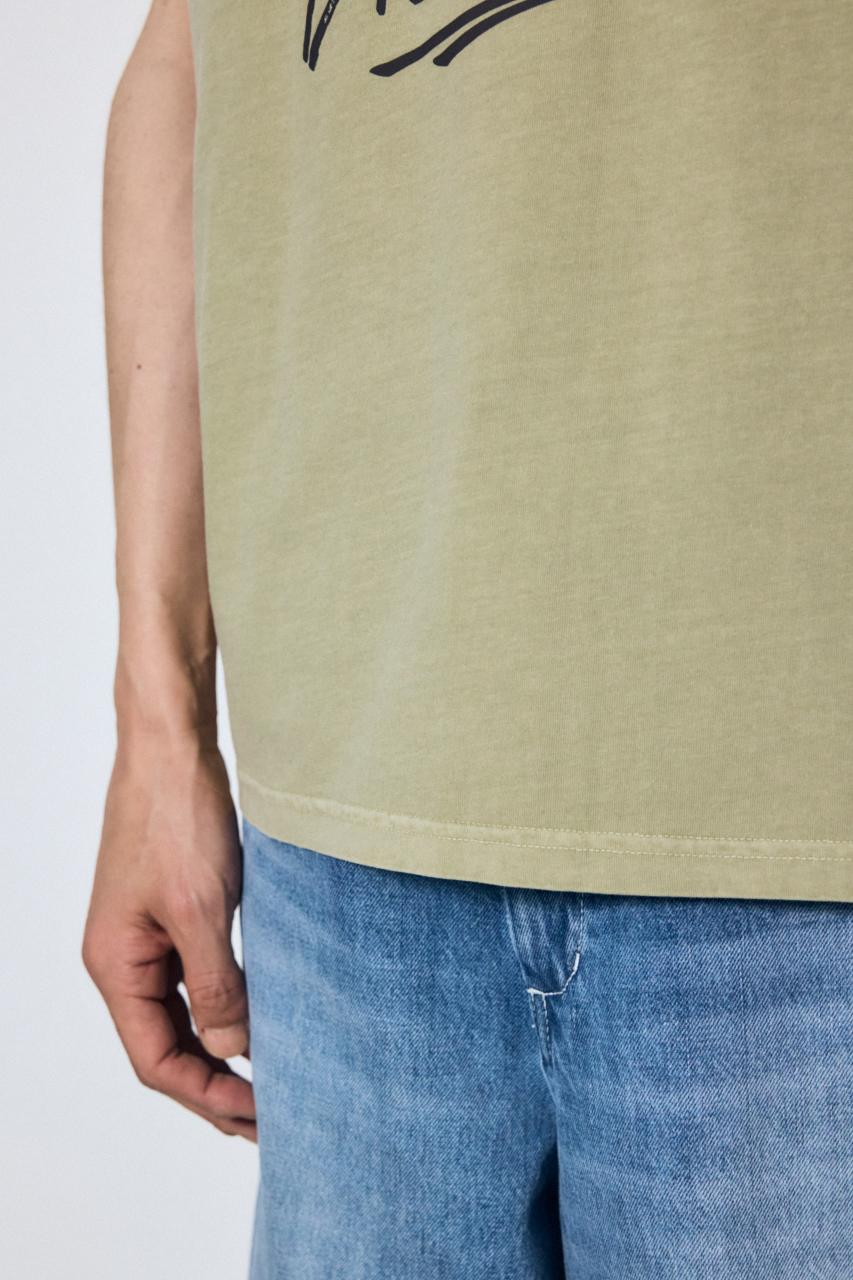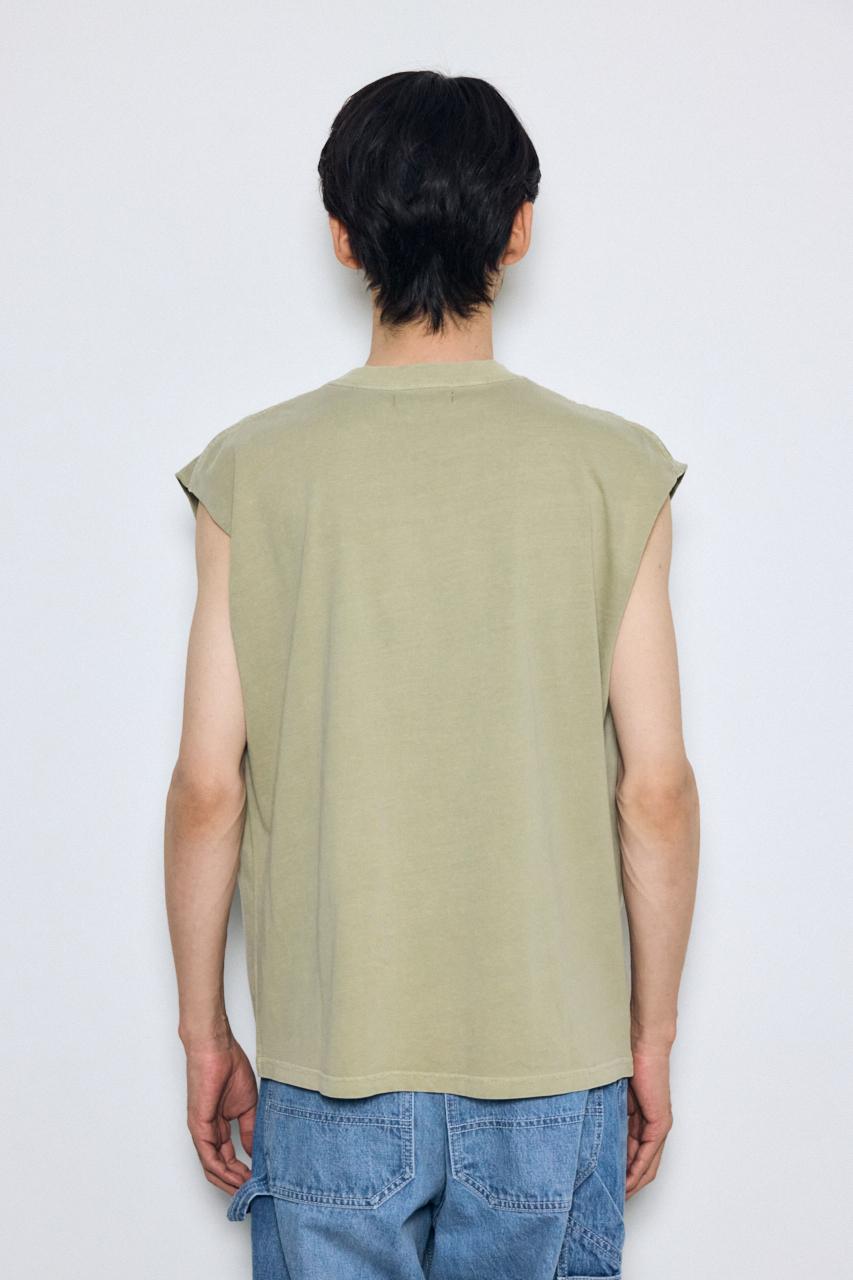 ピグメント加工によるムラ感と、白っぽいアタリが特徴のノースリーブトップスです。