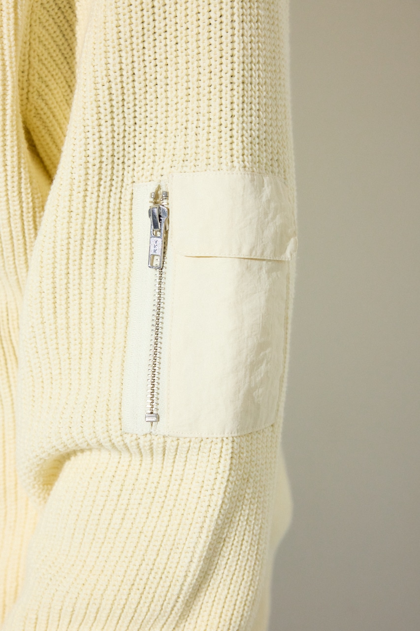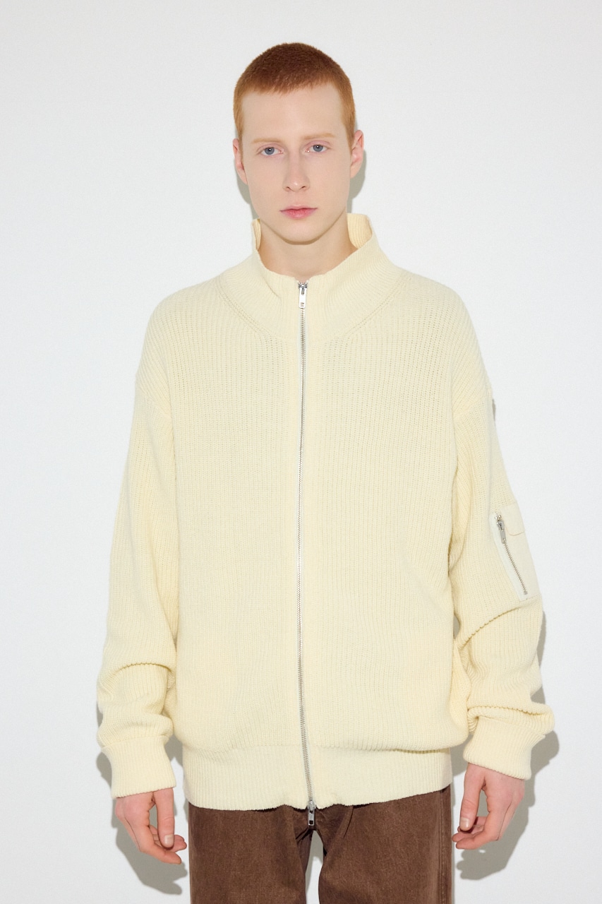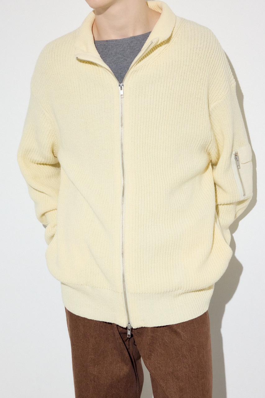 スタンドカラーのWジップ仕様で首元にボリュームを持たせたドライバーズニットです。