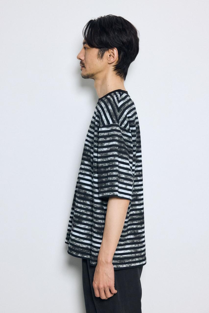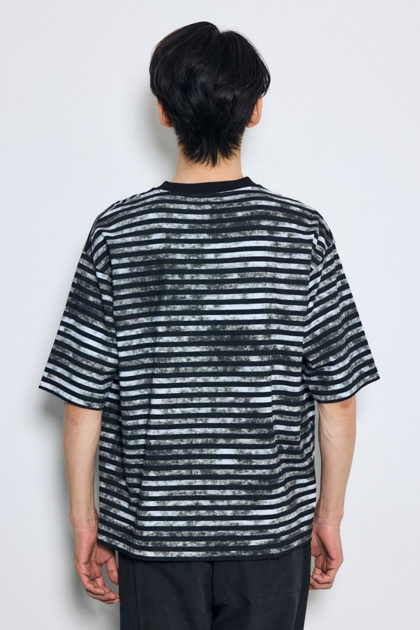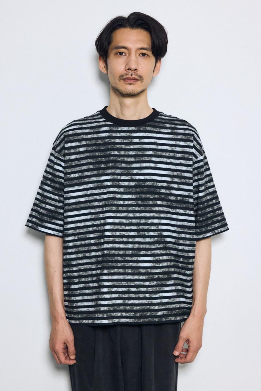ベーシックなボーダーに、かすれた総柄プリントを重ねたユニークな表情のTシャツです。