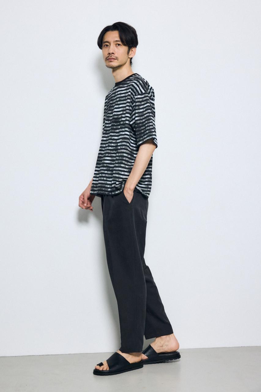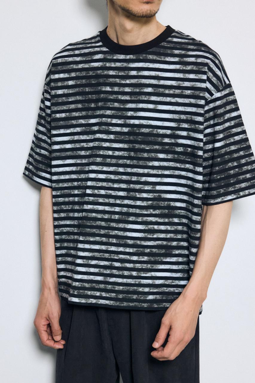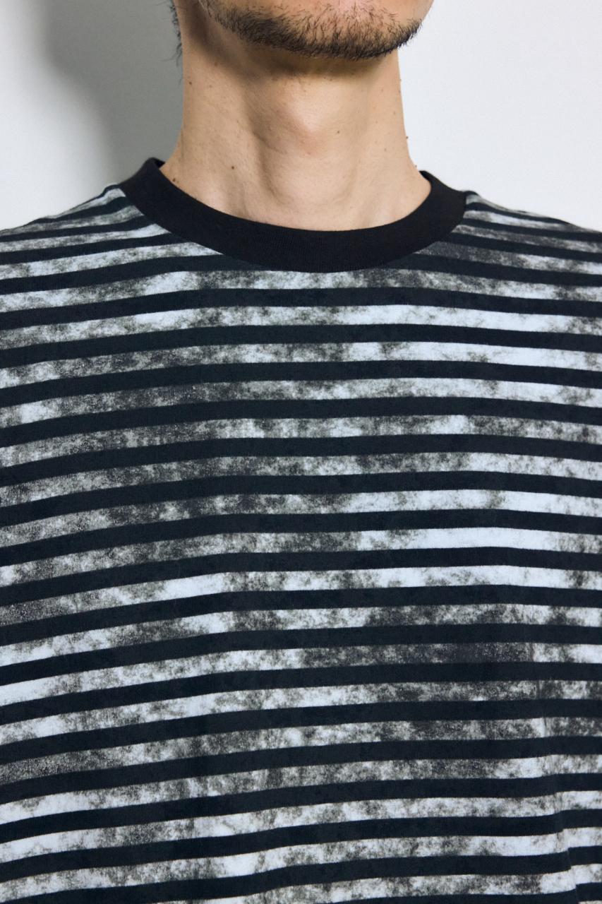 ベーシックなボーダーに、かすれた総柄プリントを重ねたユニークな表情のTシャツです。