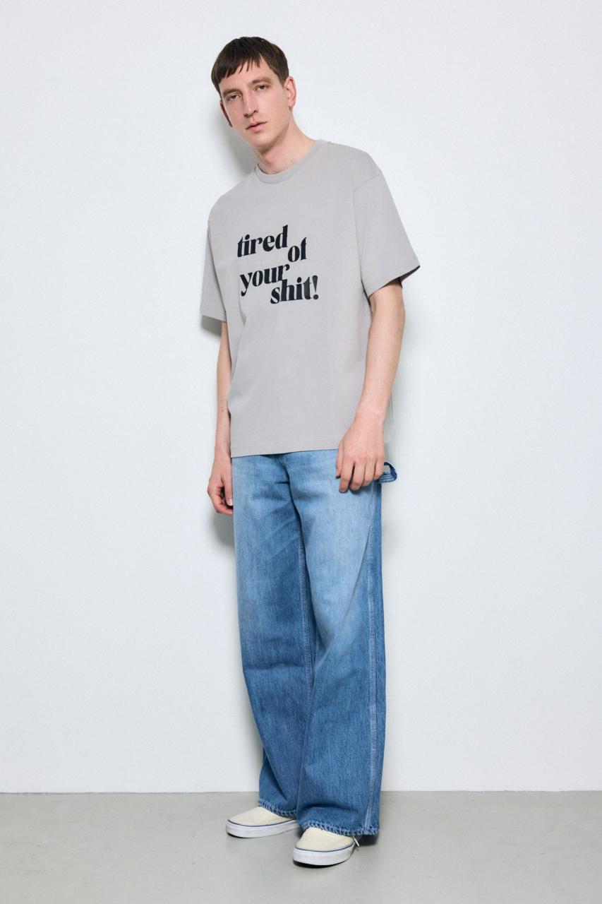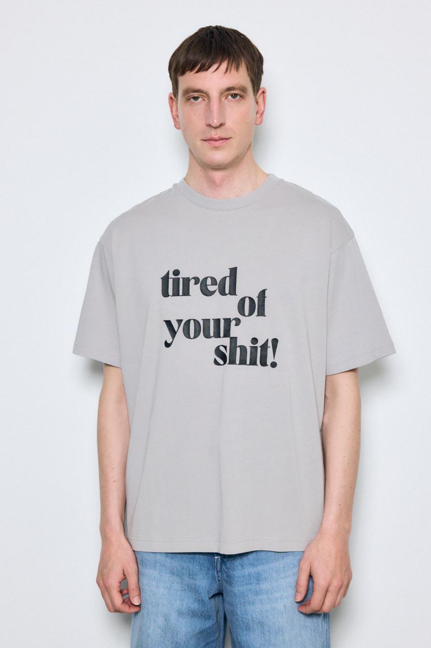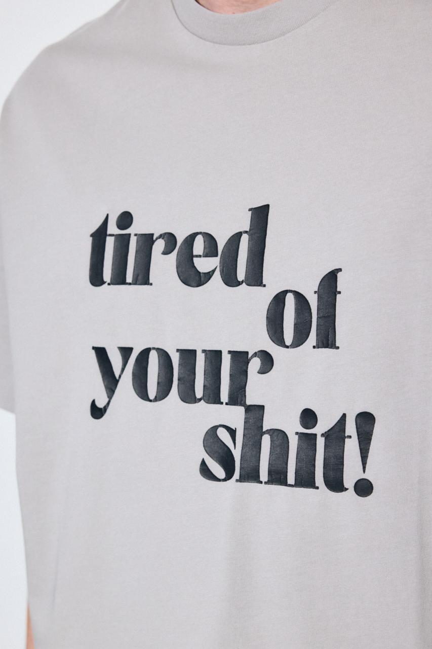 「tired of your shit」のロゴを大胆に配した、メッセージ性のあるTシャツ。