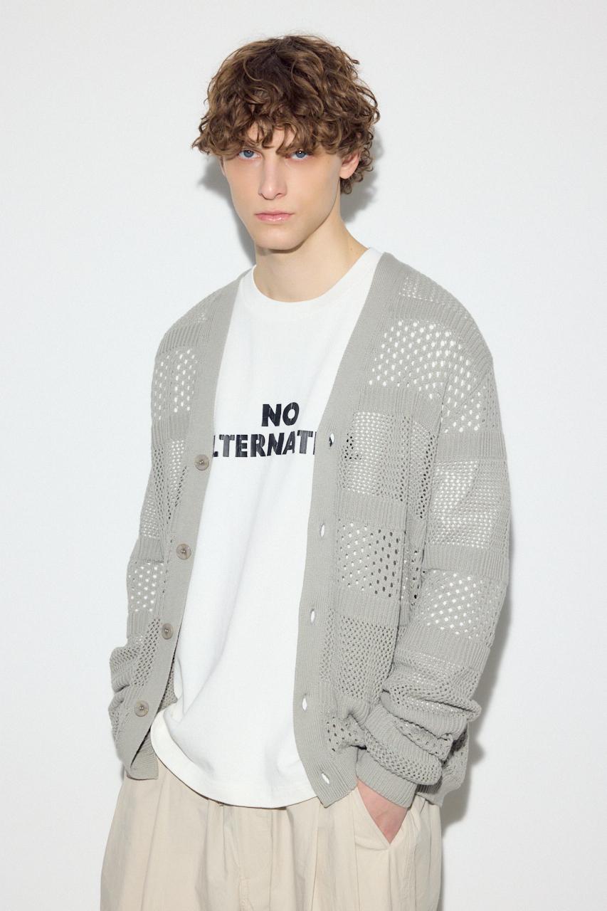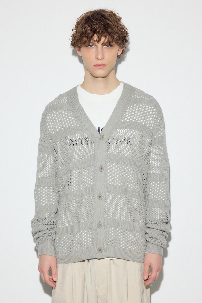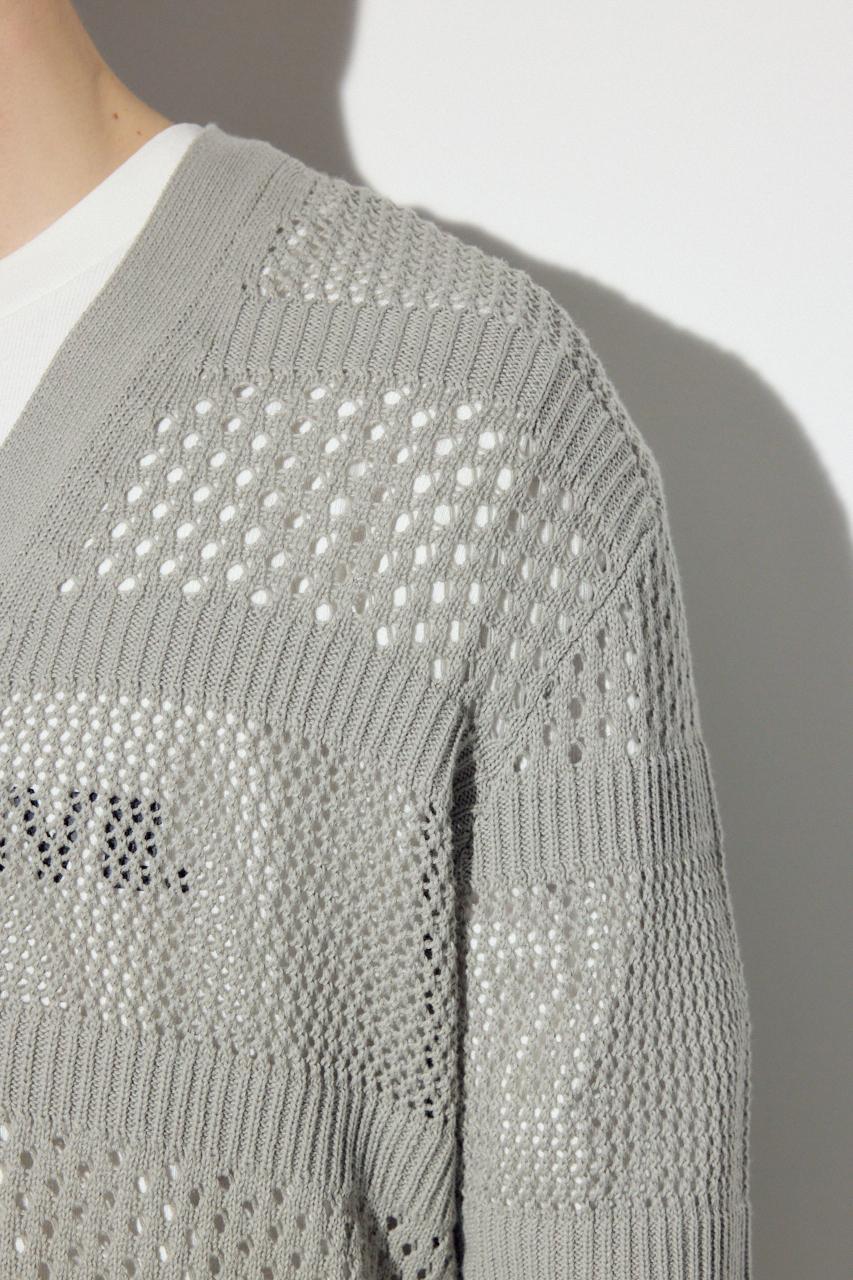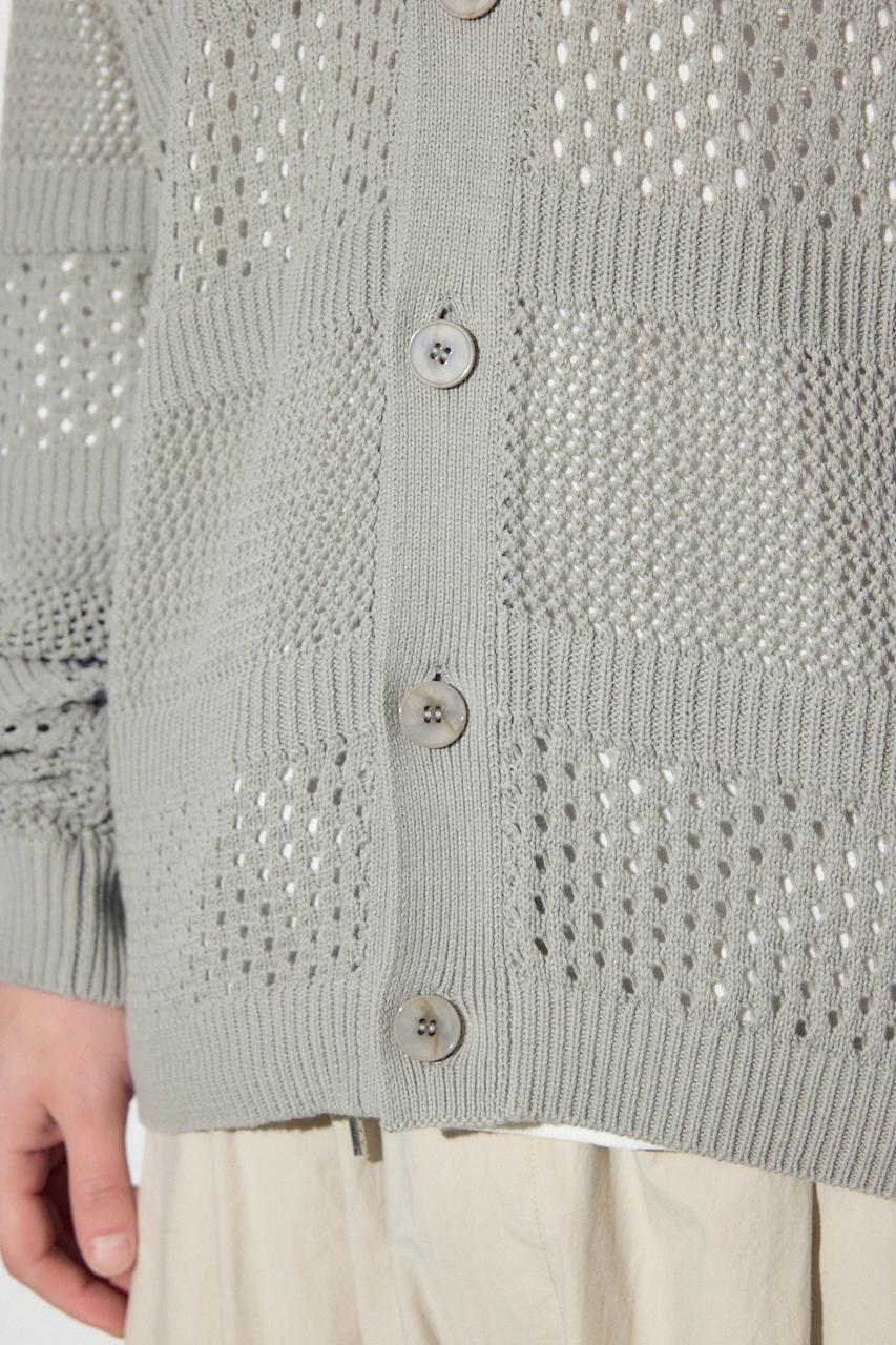 透かし編みで表情を出した、ミドルゲージのニットカーディガンです。