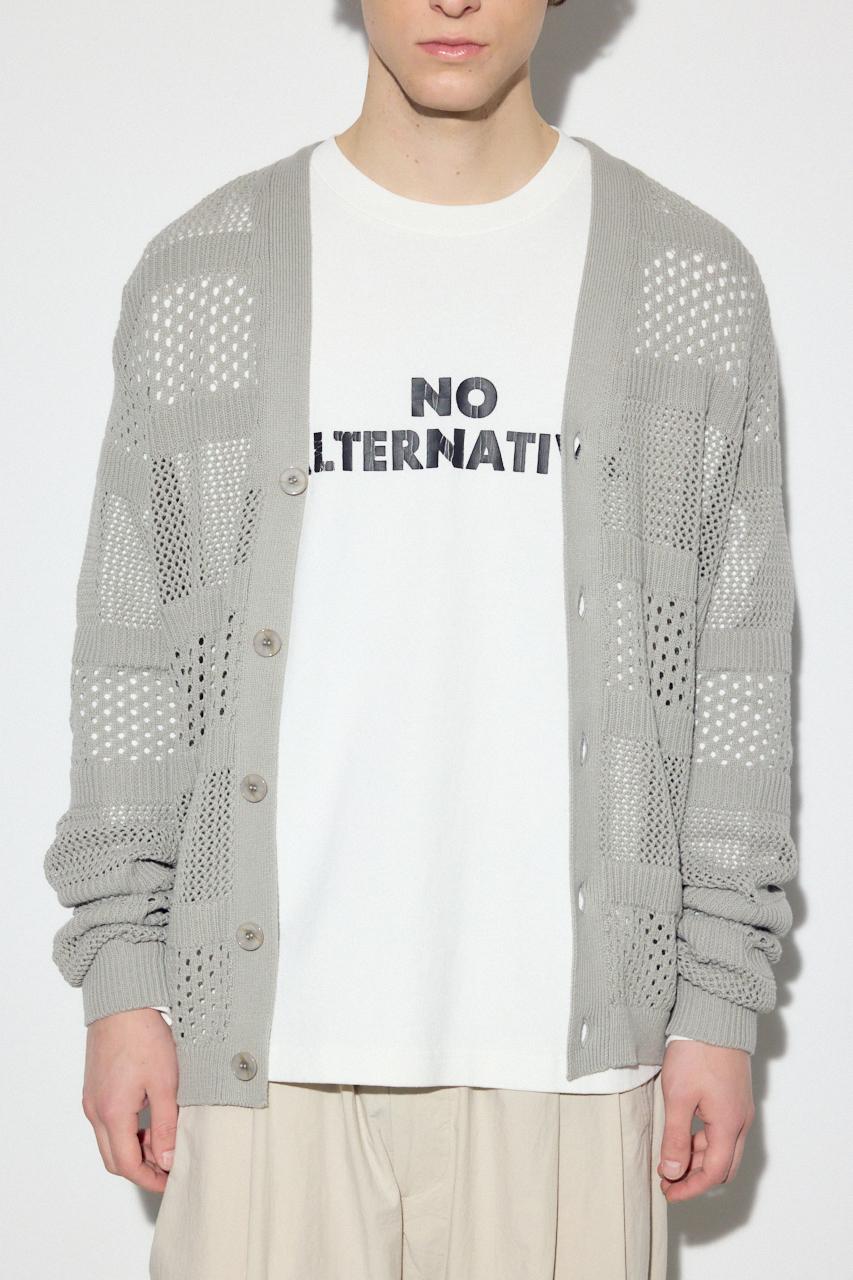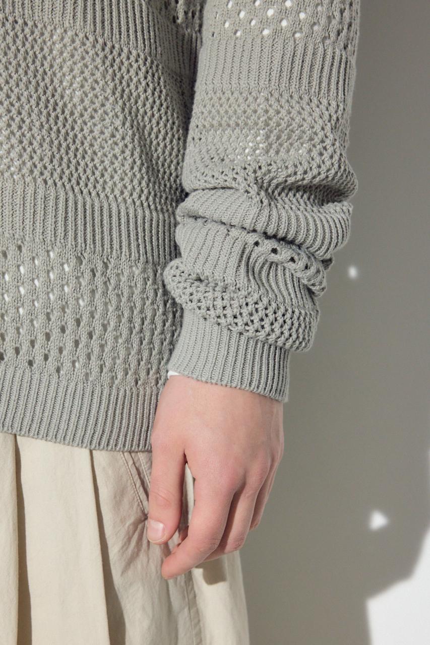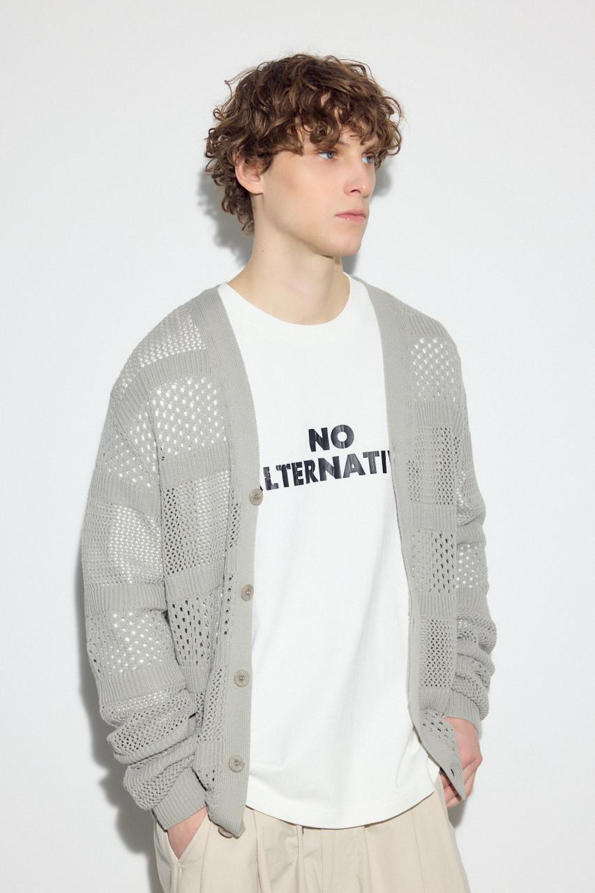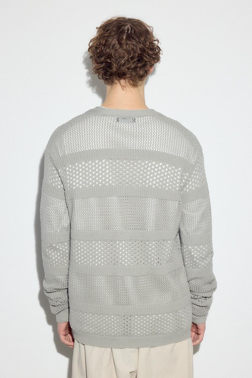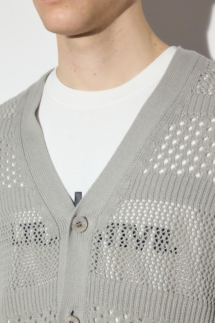 透かし編みで表情を出した、ミドルゲージのニットカーディガンです。