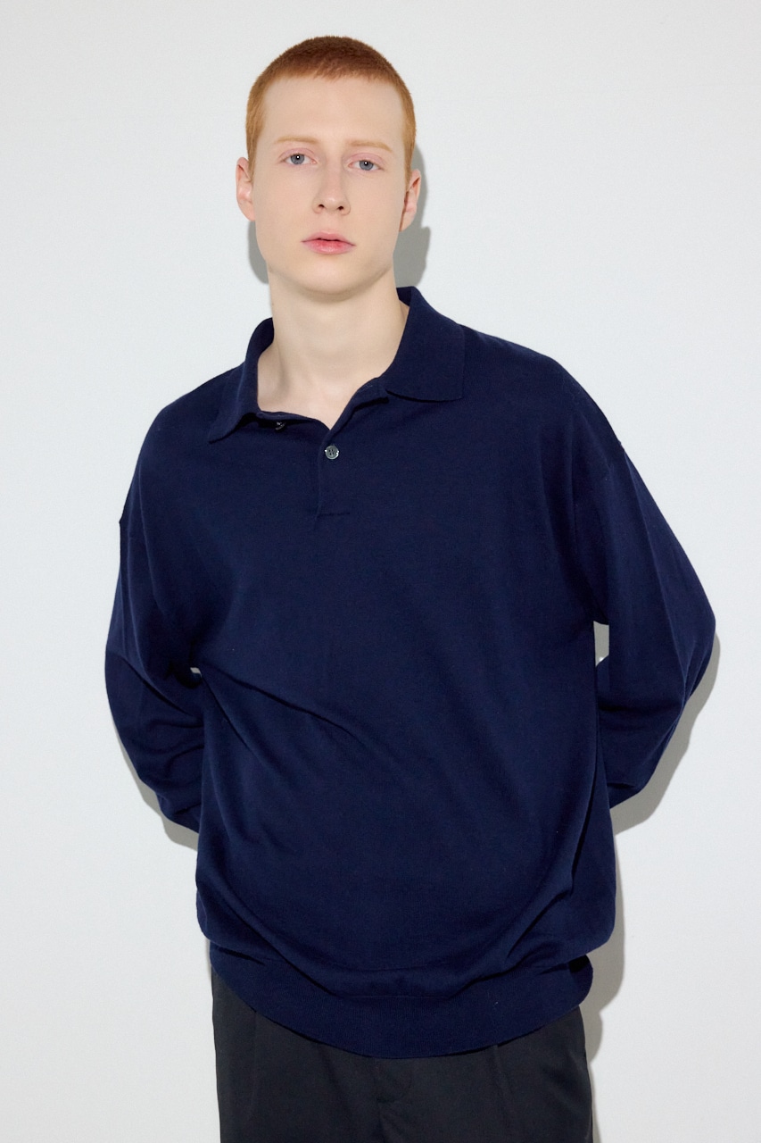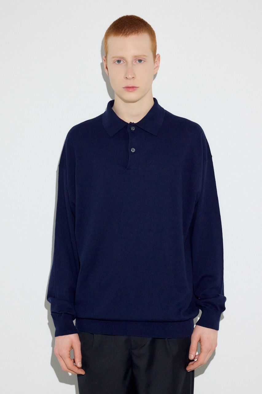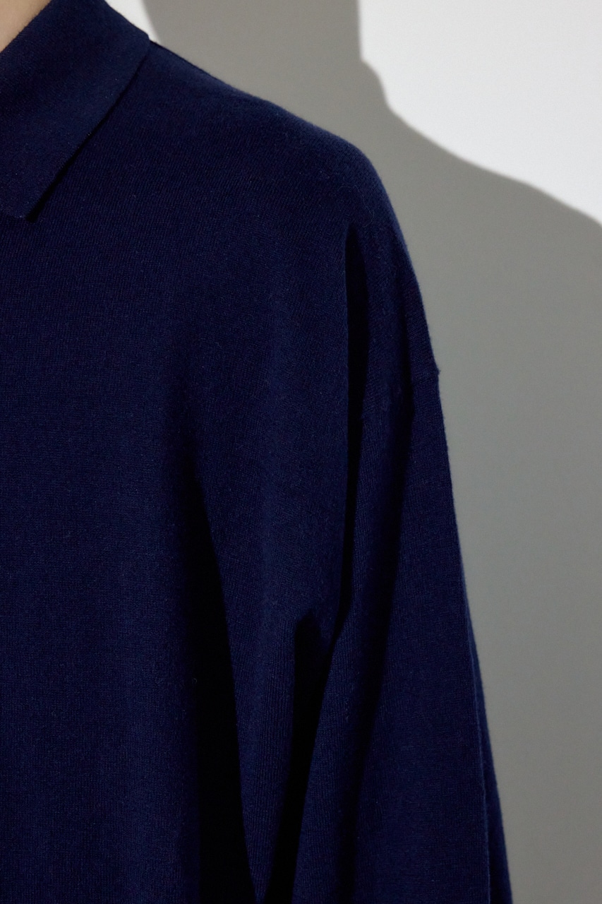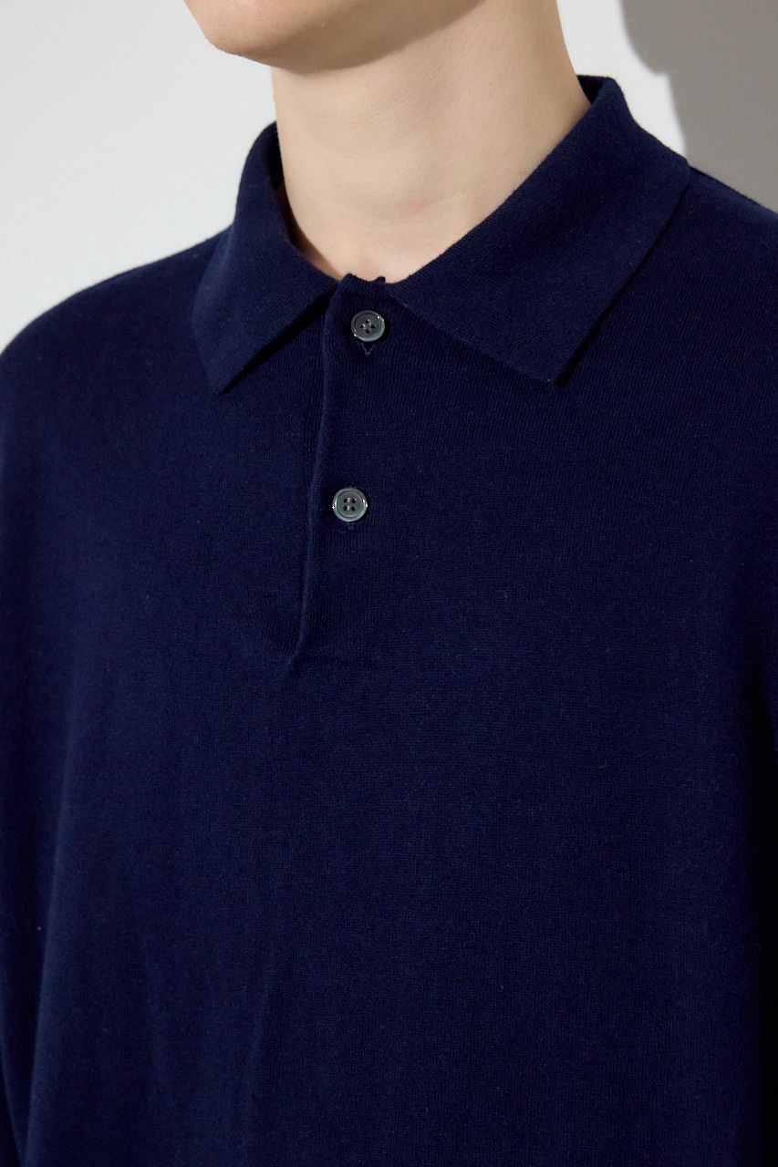 細番手のコットン×カシミヤ混でハイゲージに編み上げたことで、ニットの上質感とシャープなポロ襟の佇まいを両立。