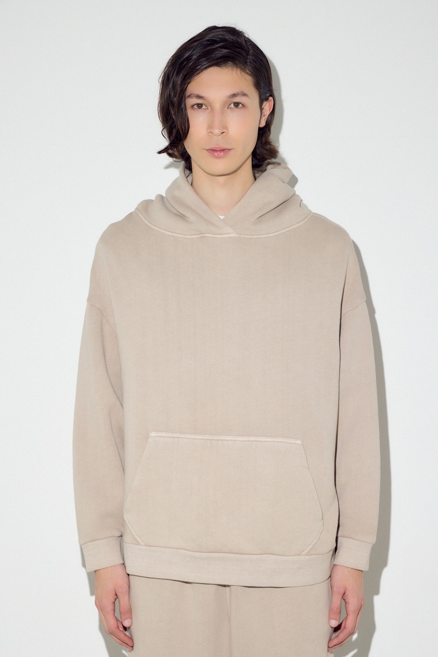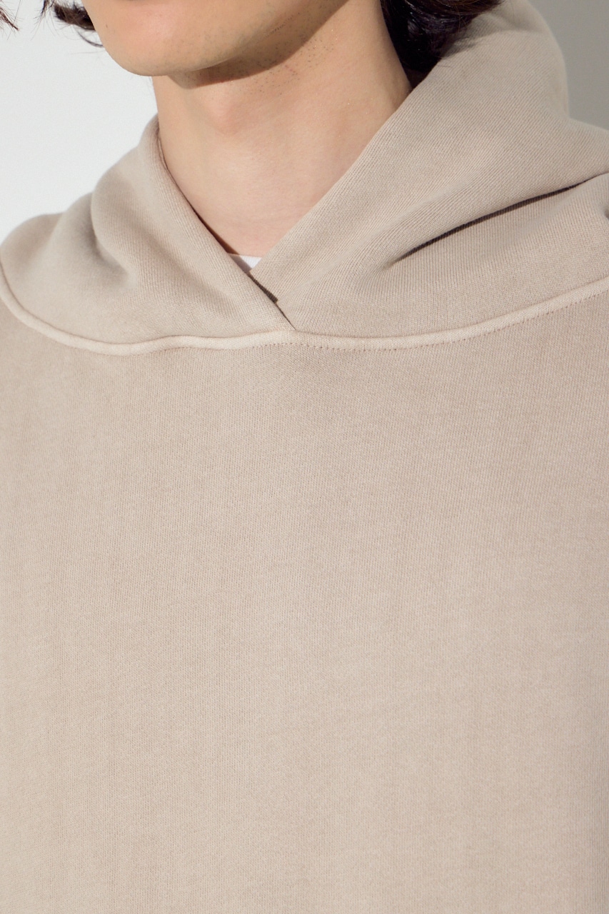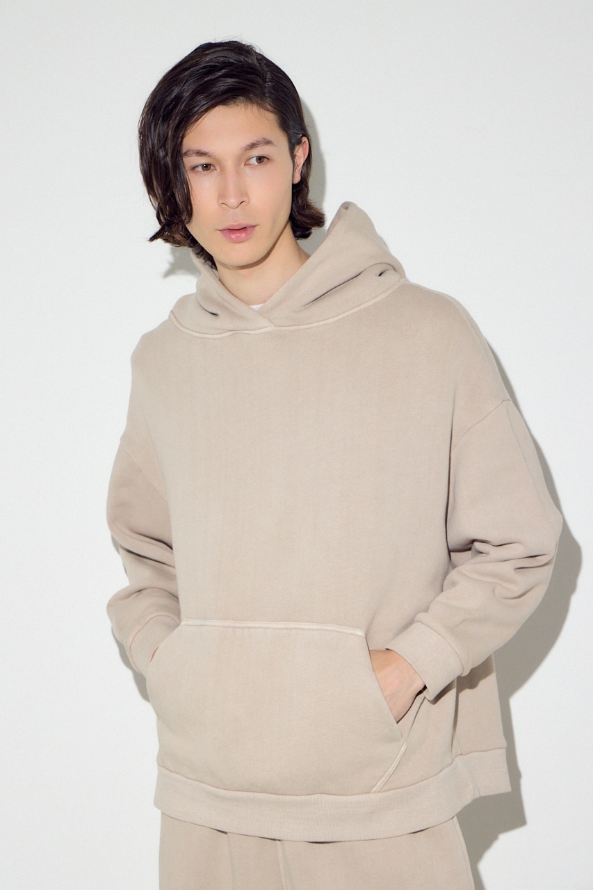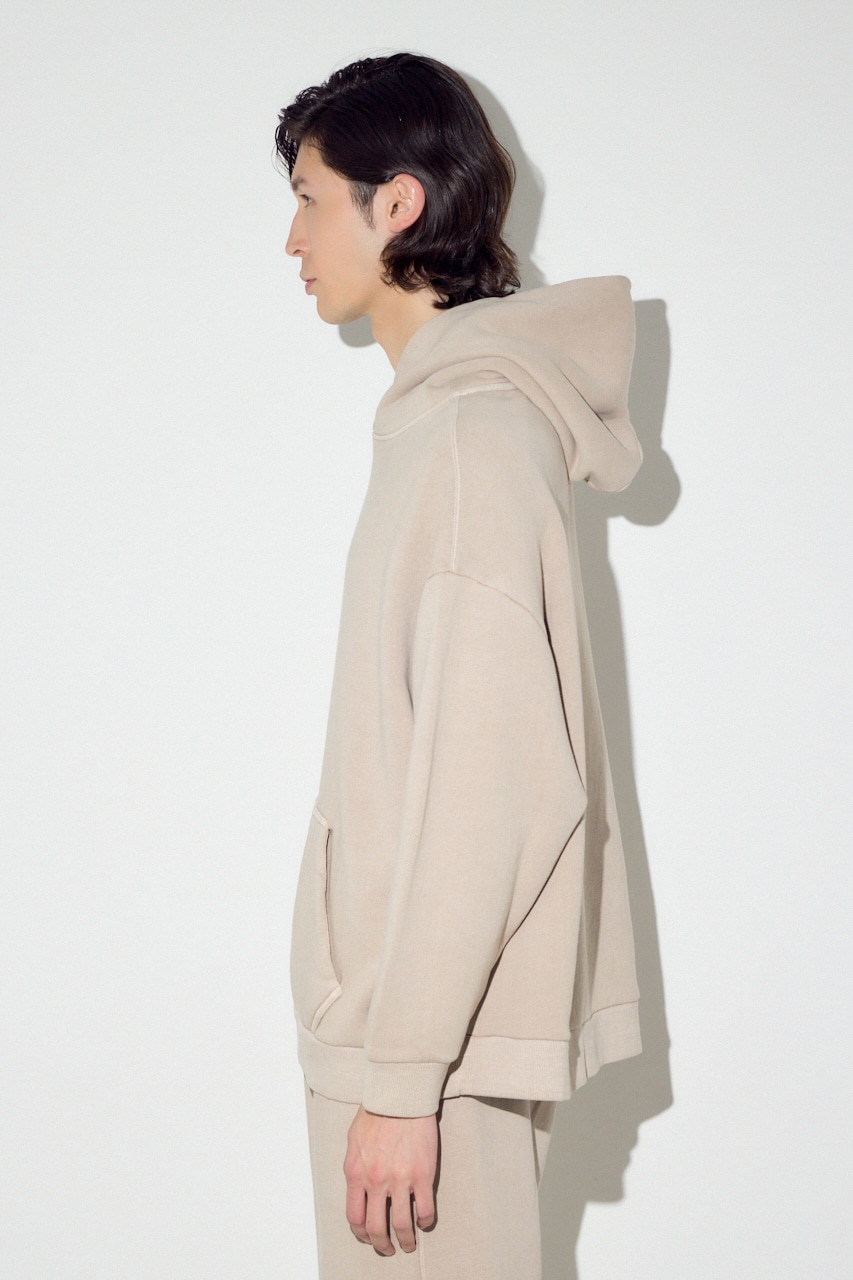 吊り裏毛を起毛・ピグメント加工したワイドフーディーです。