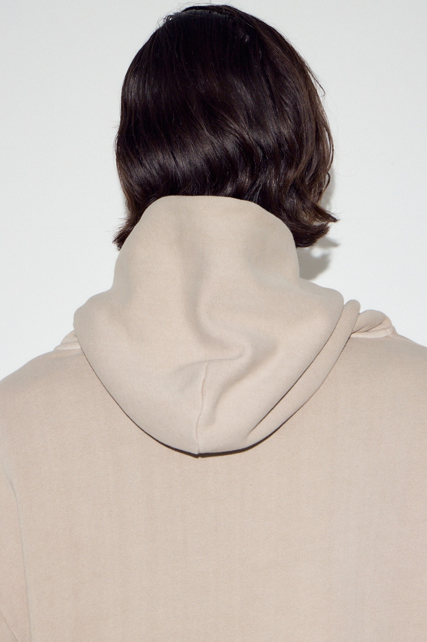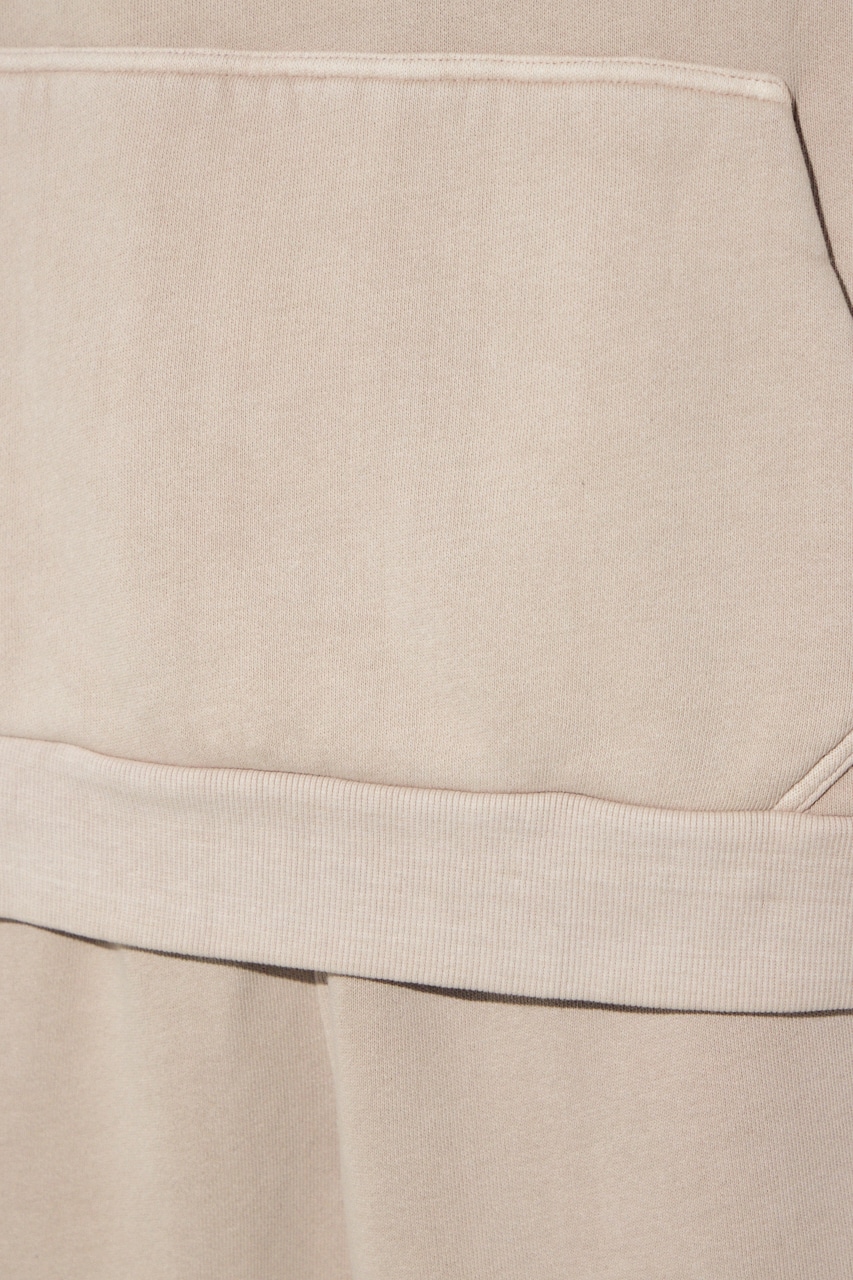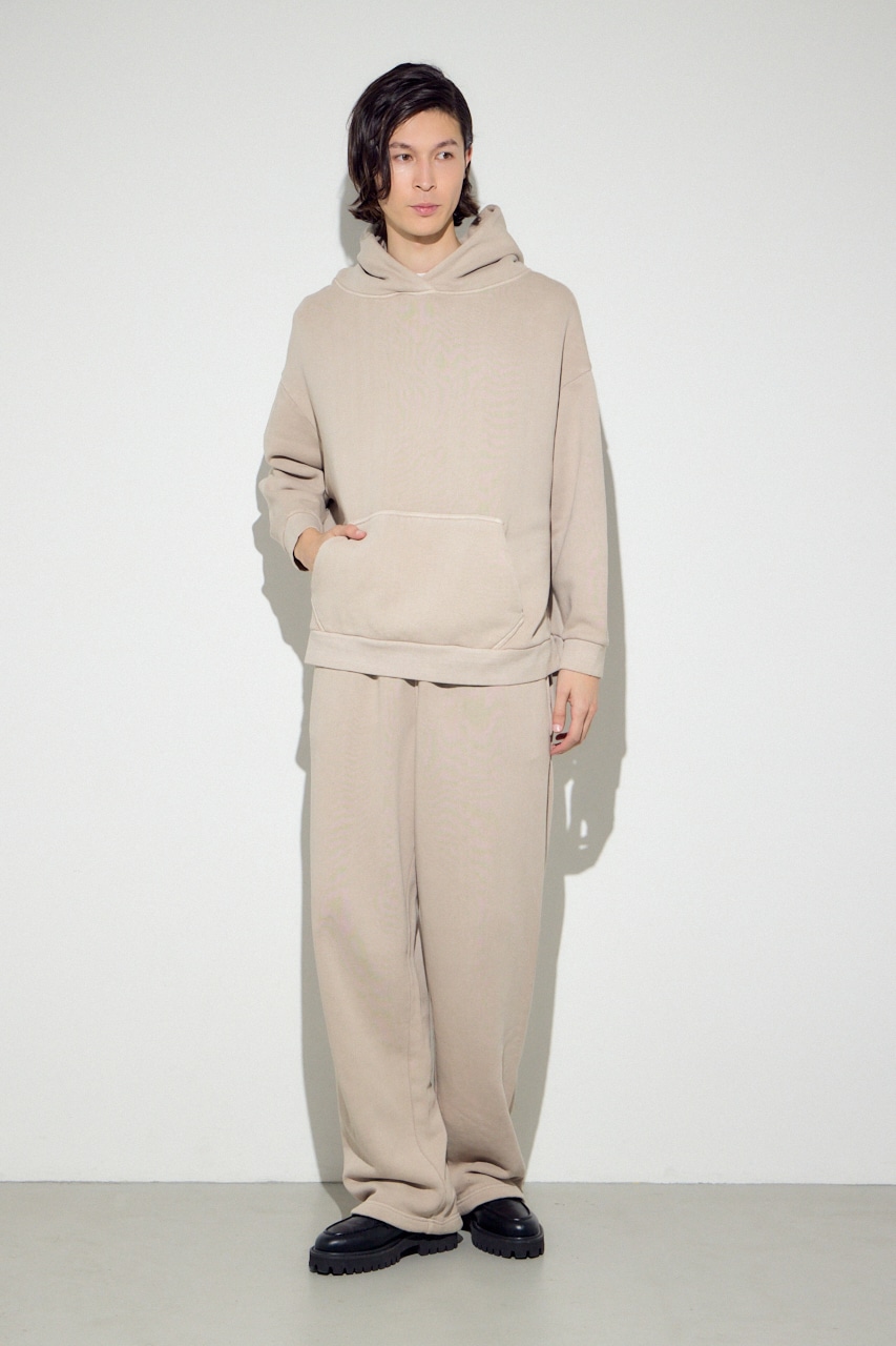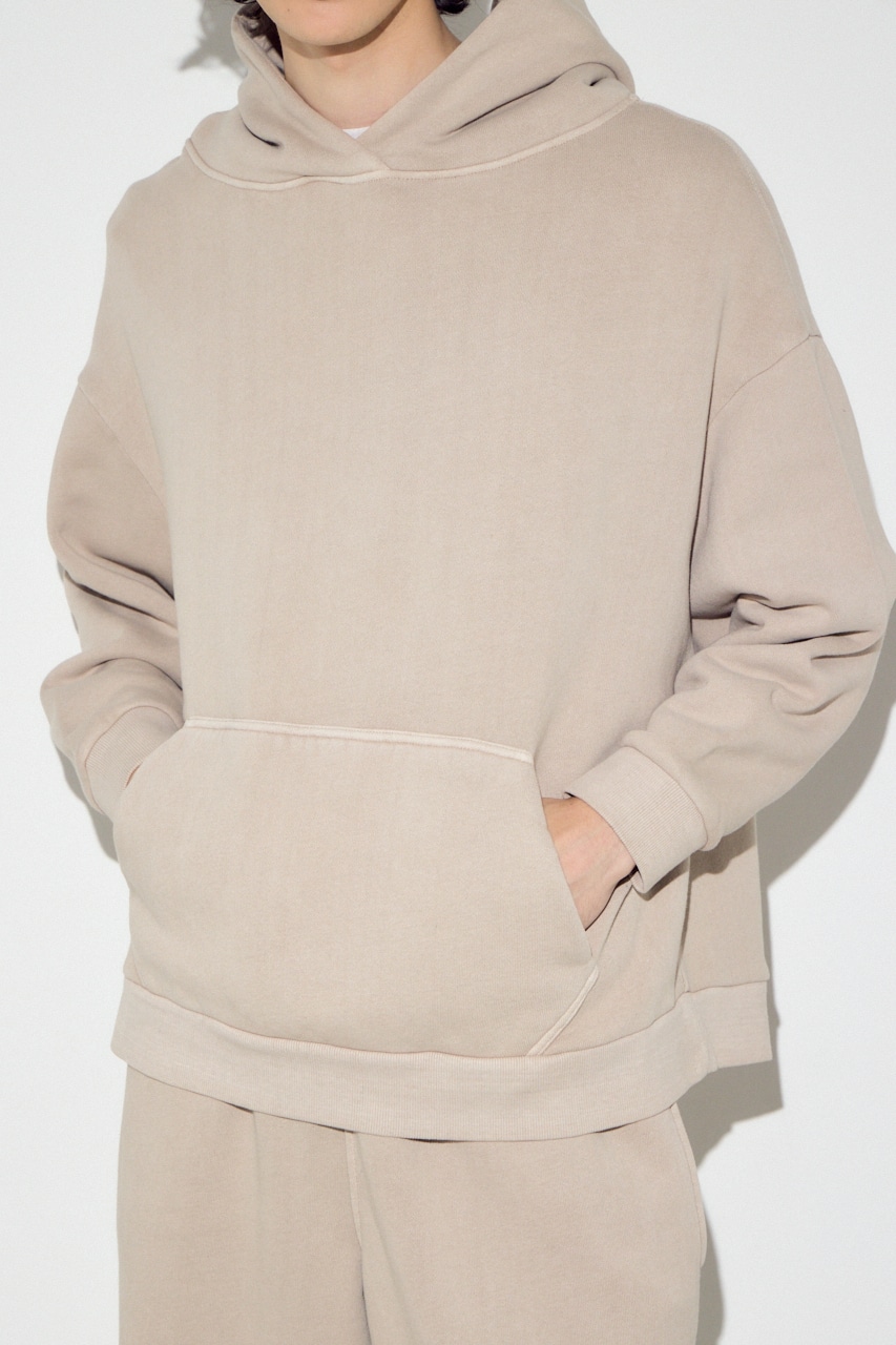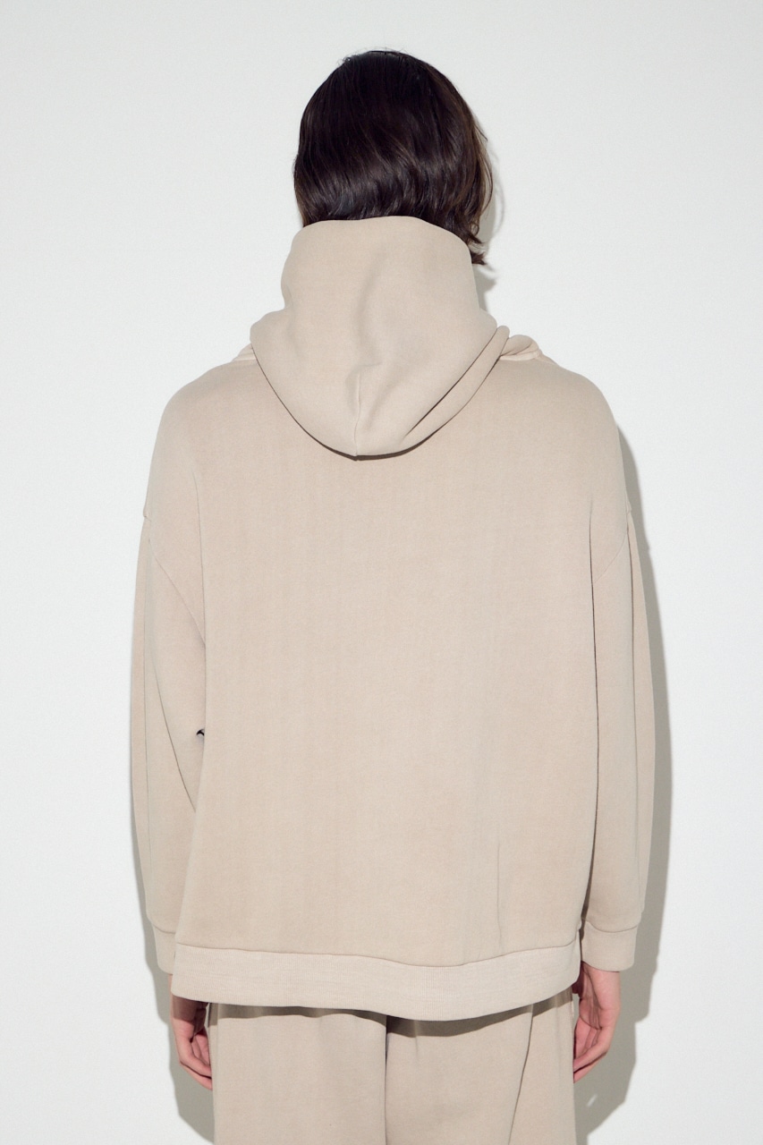吊り裏毛を起毛・ピグメント加工したワイドフーディーです。