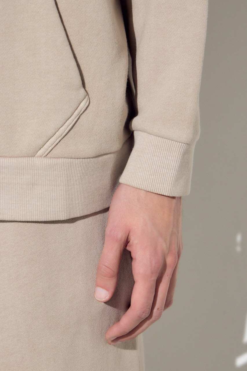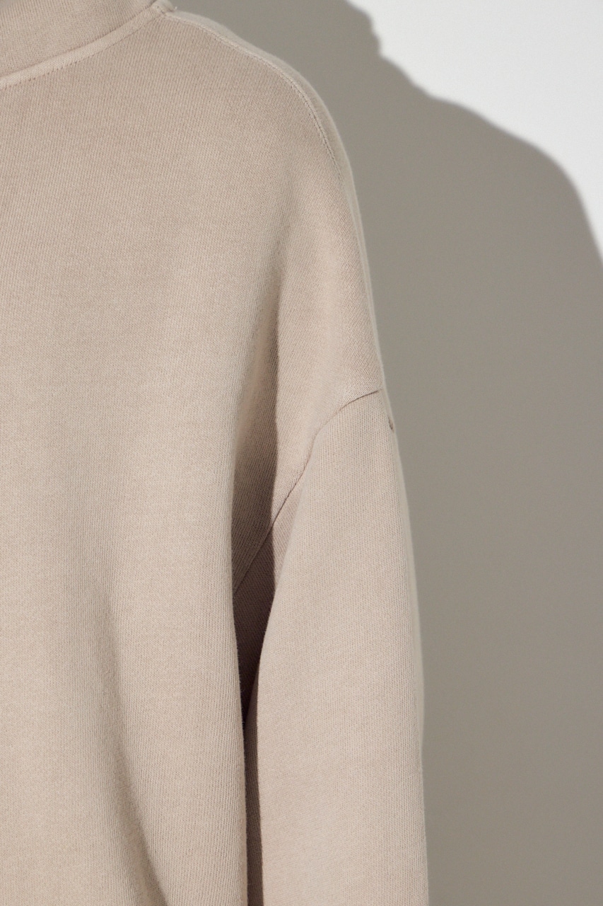 吊り裏毛と言う、通常の裏毛とは違う方法で編みたてた生地に起毛をかけ、ピグメント加工をすることで裏側も独特な起毛感のある生地です。