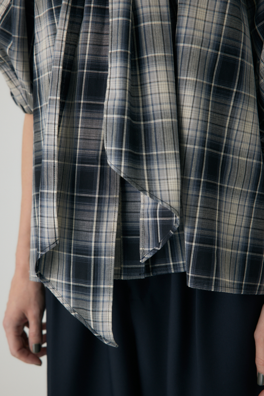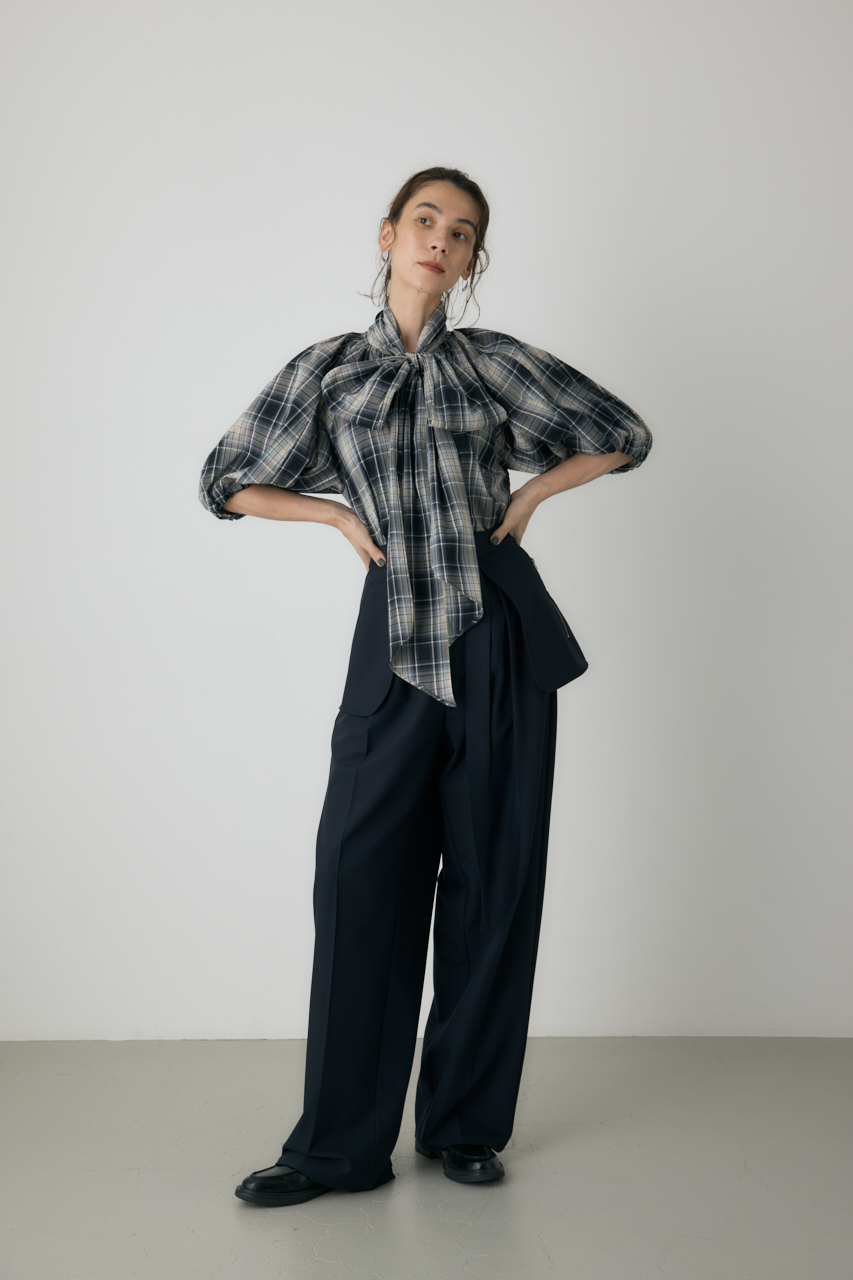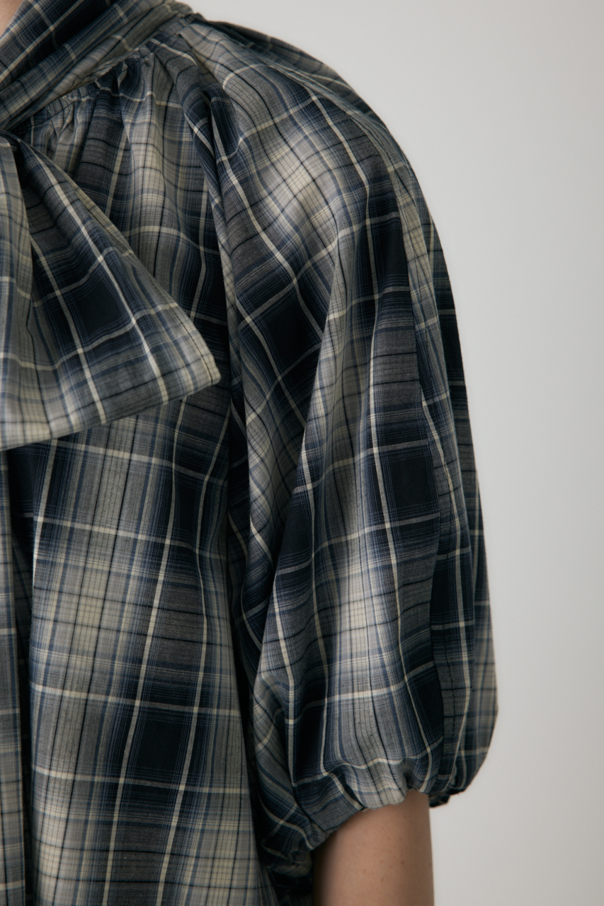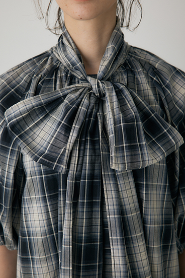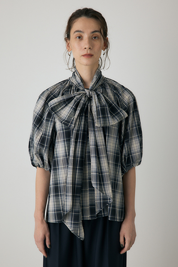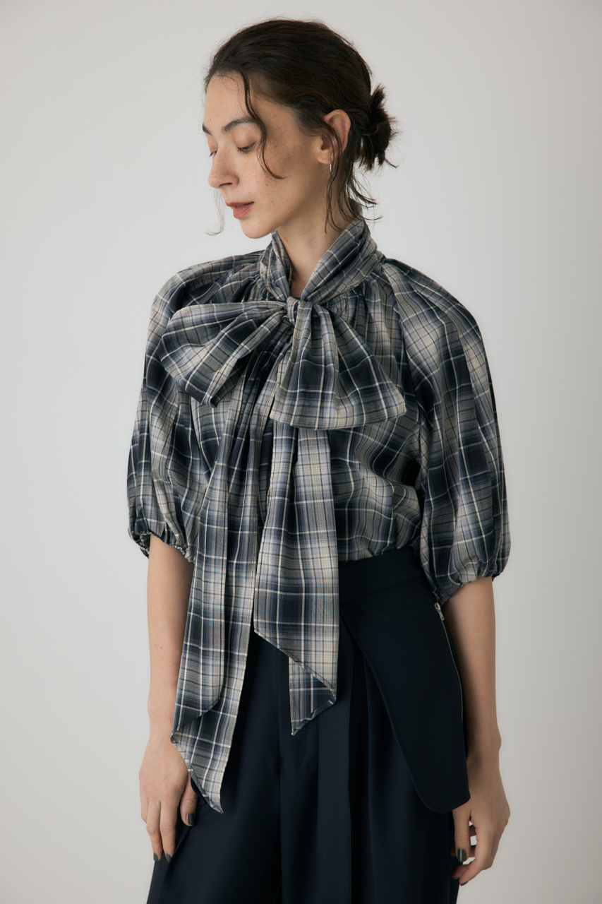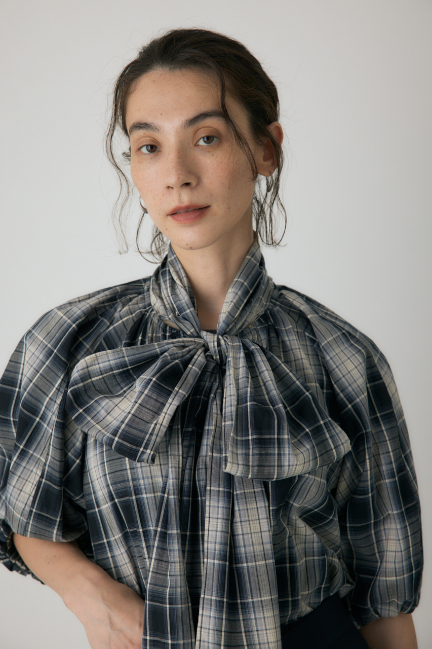 目を引く大きなボウタイと、今年トレンドのチェックで1枚で着映えるブラウス。